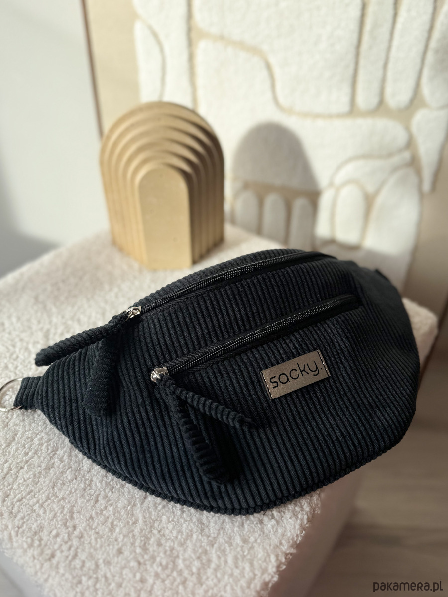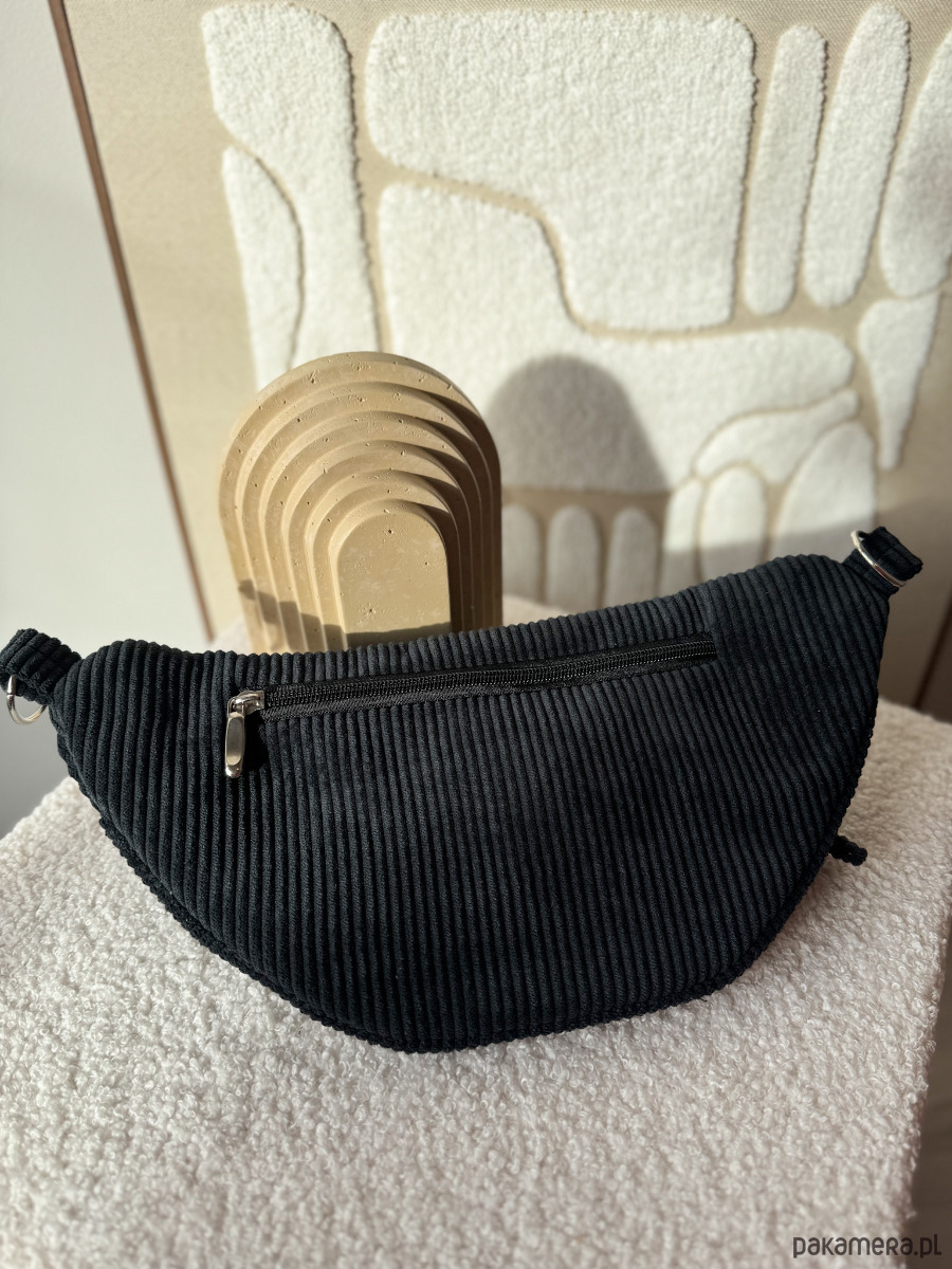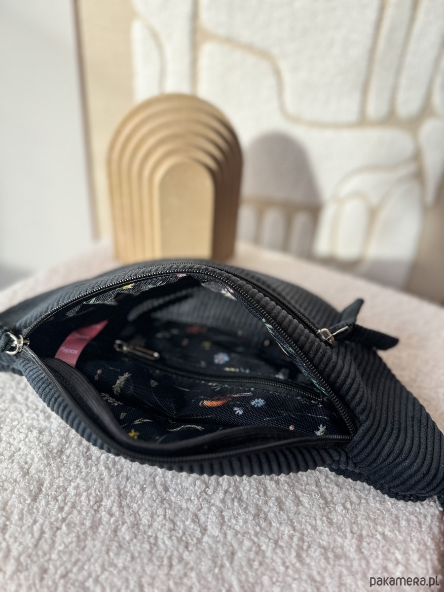 Sztruksowa nerka fall czarna to nasza jesienno zimowa propozycja. Nerka na przodzie poza główną komorę ma kieszonkę na zamek wykończoną ozdobnym frędzelkiem. Dodatkowo na tyle nerki znajduje się kieszonka na zamek. Pasek jest regulowany oraz odpinany, dzięki czemu możesz modyfikować wygląd swojej nerki i zmieniać paski dowolnie. W środku saszetka ma wodoodporną podszewkę, kieszonkę na zamek oraz karabinek na klucze.