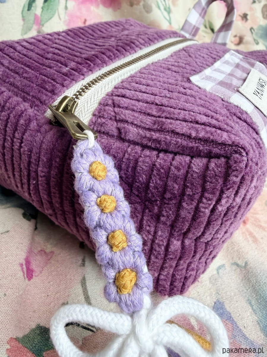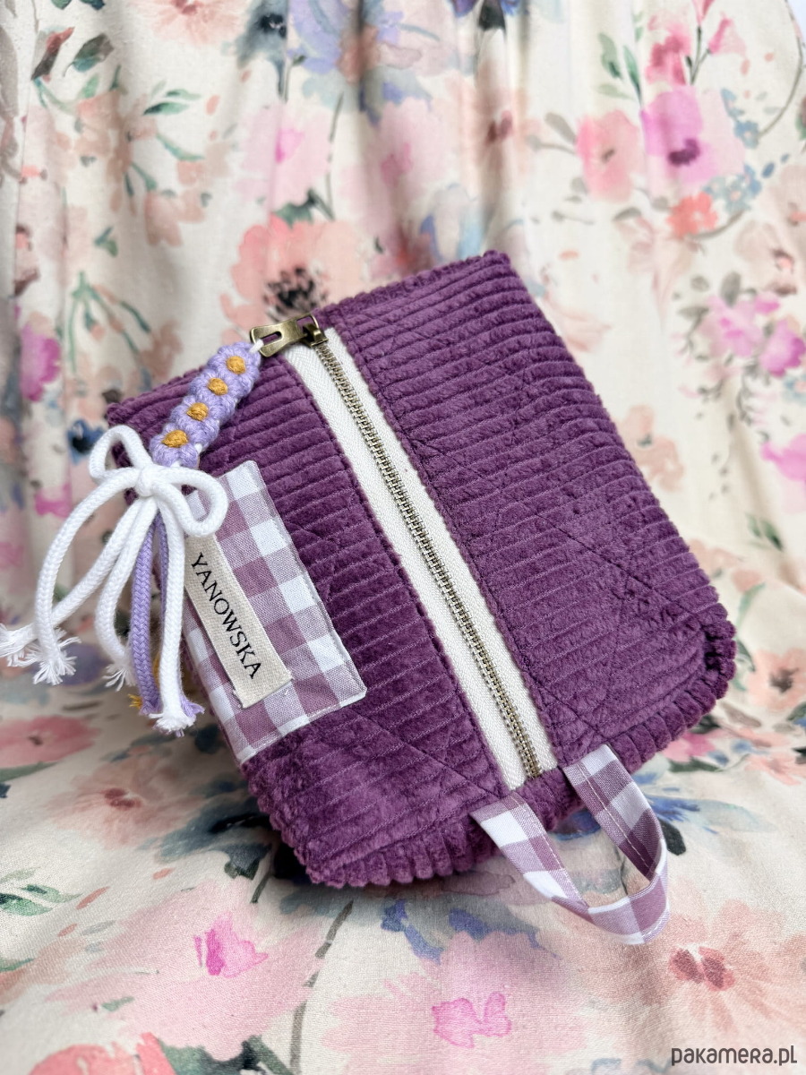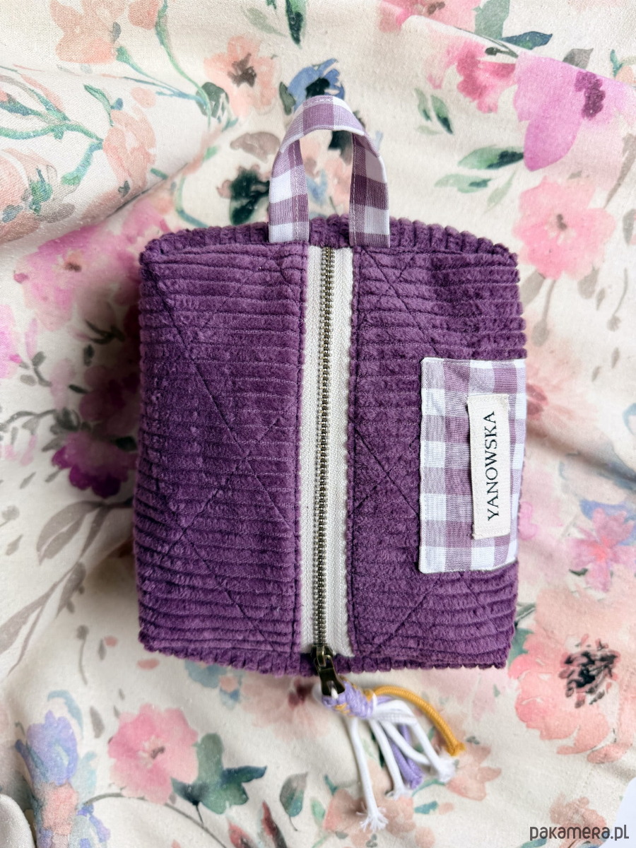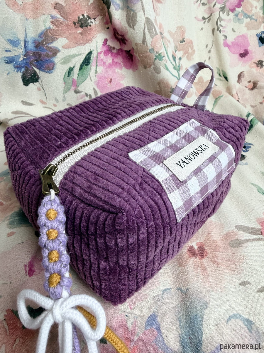 Fioletowa, sztruksowa kosmetyczka pomaga utrzymać porządek, zbierając wszystkie drobiazgi, które na co dzień łatwo zgubić w torebce lub bagażu.