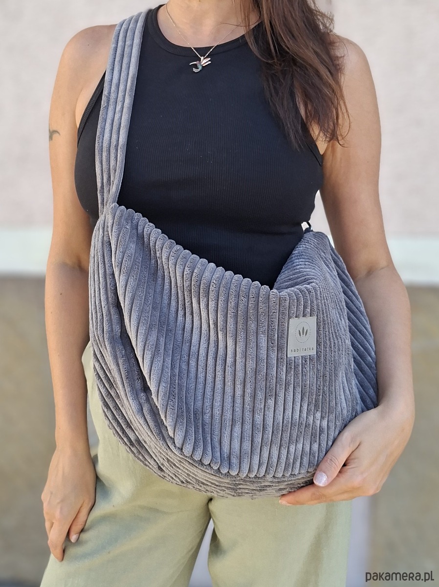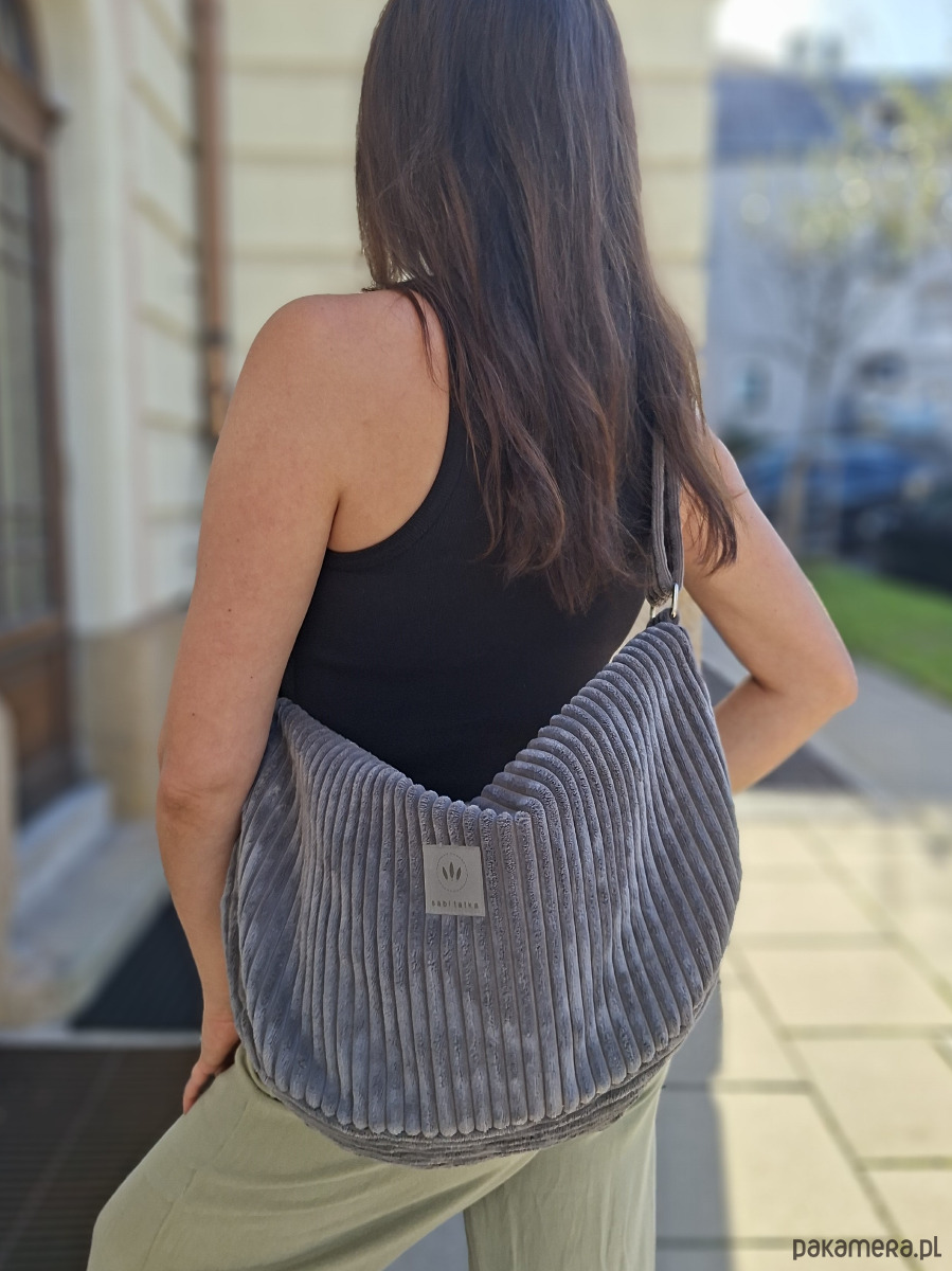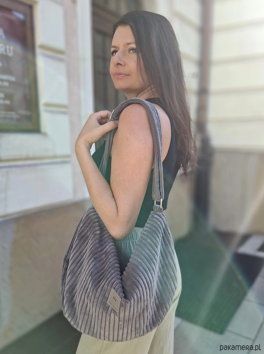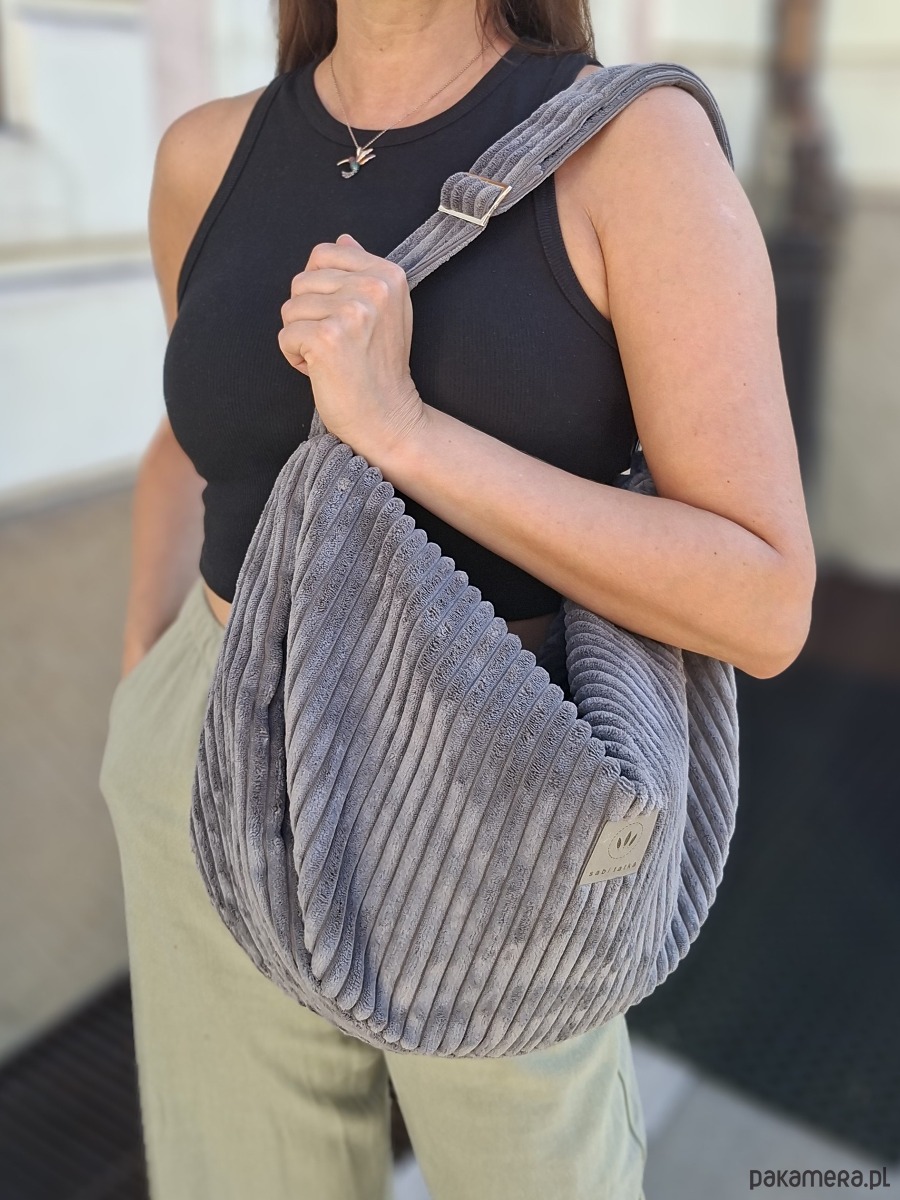 Średniej wielkości, minimalistyczna torba worek wykonana z tapicerskiego sztruksu.