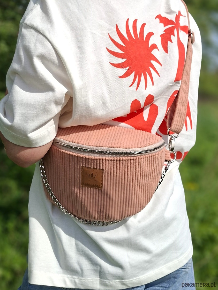 Duża torebko nerka wykonana ze sztruksu tapicerskiego w odcieniu brzoskwiniowym/morelowym.