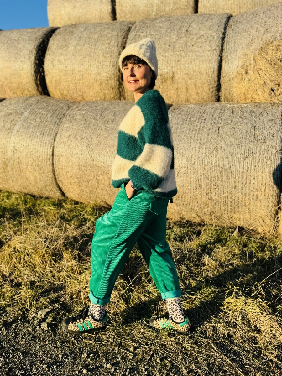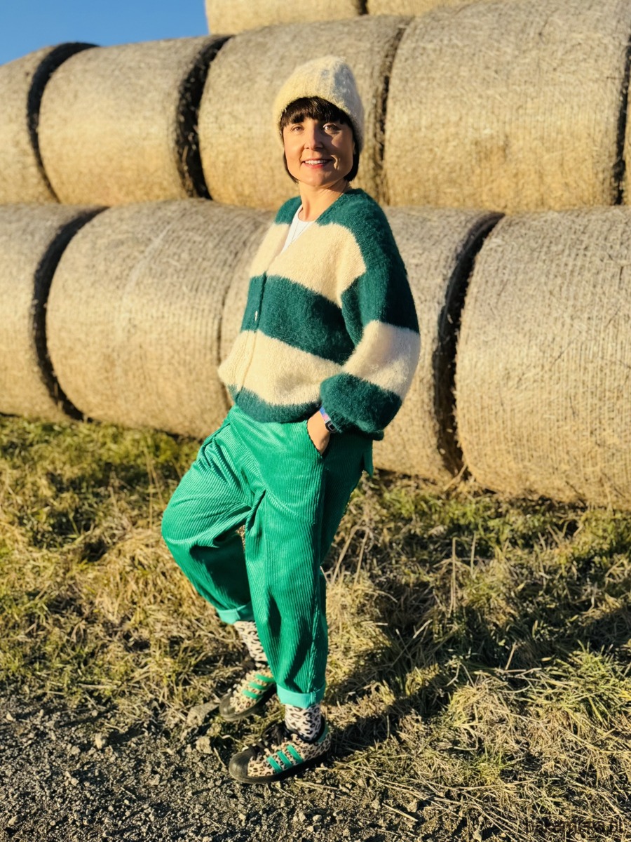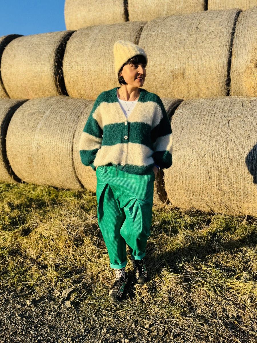 Miękki, bawełniany sztruks w kolorze soczystej zieleni, obniżony krok i zwężana nogawka – te spodnie baggy mają luz, ale trzymają formę. Z przodu asymetryczny karczek, a na nogawkach zakładki, każda inna, jak lubimy. Duże, wygodne kieszenie z przodu, z tyłu patki imitujące kieszenie, dla przełamania prostoty.