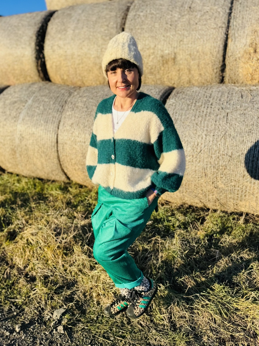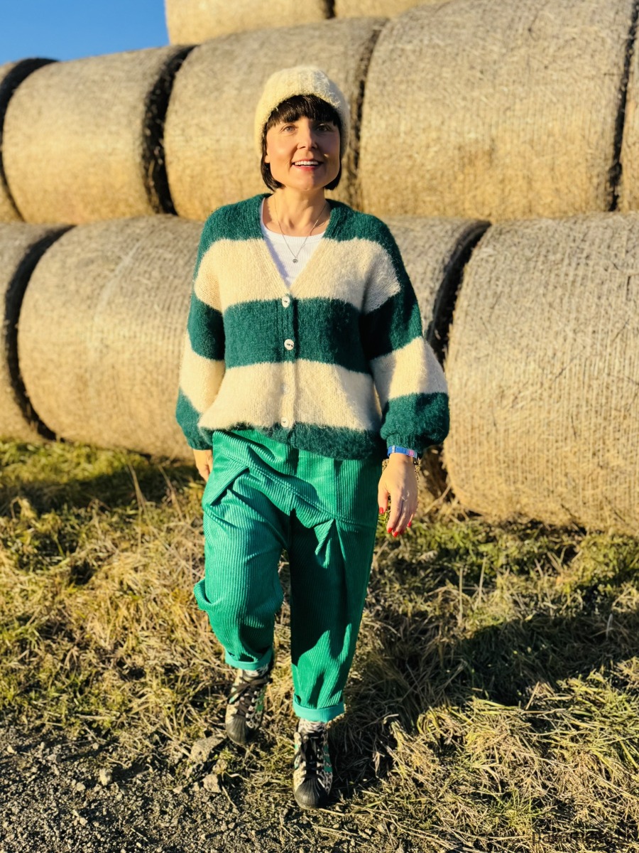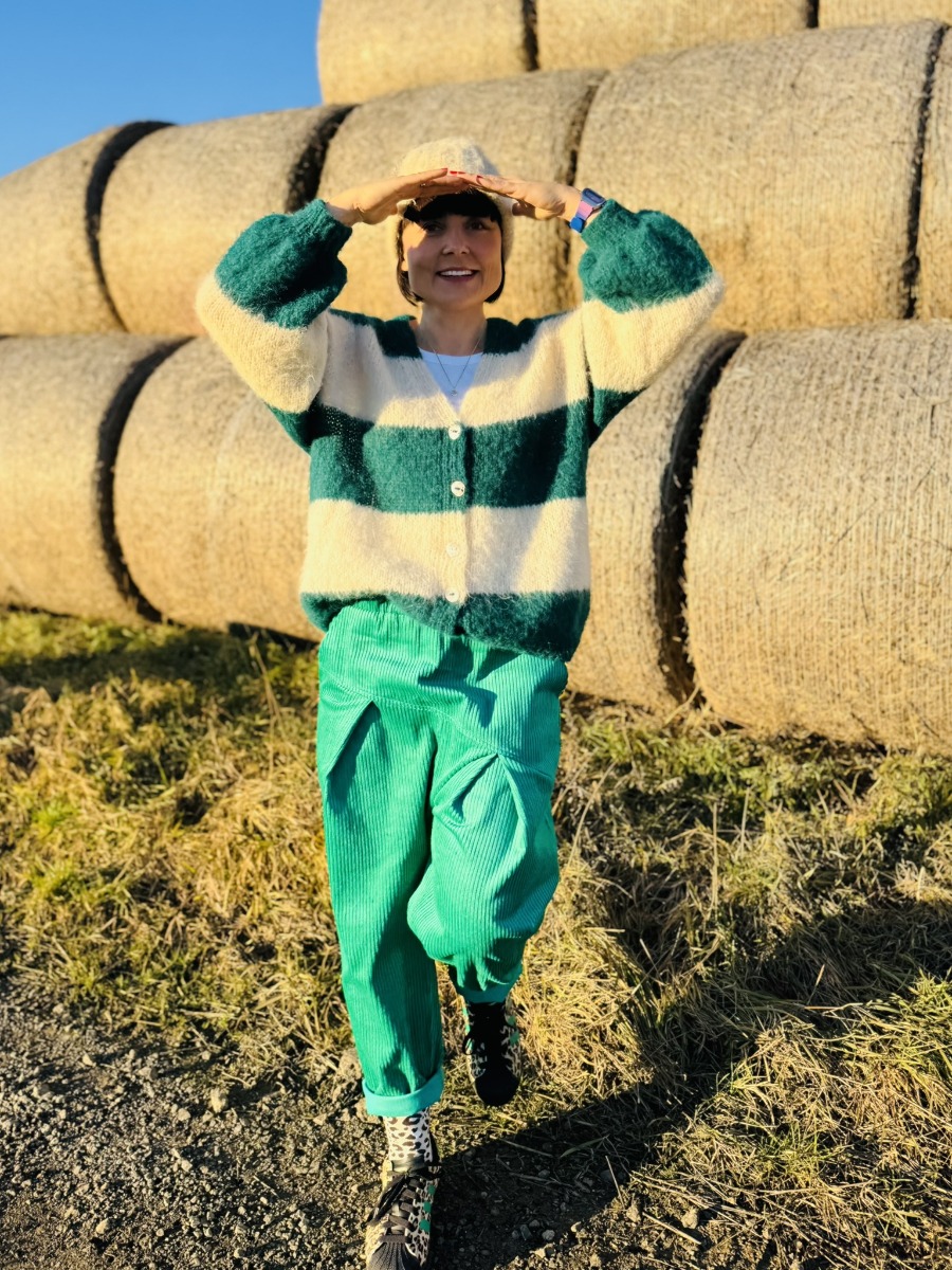 Miękki, bawełniany sztruks w kolorze soczystej zieleni, obniżony krok i zwężana nogawka – te spodnie baggy mają luz, ale trzymają formę. Z przodu asymetryczny karczek, a na nogawkach zakładki, każda inna, jak lubimy. Duże, wygodne kieszenie z przodu, z tyłu patki imitujące kieszenie, dla przełamania prostoty.