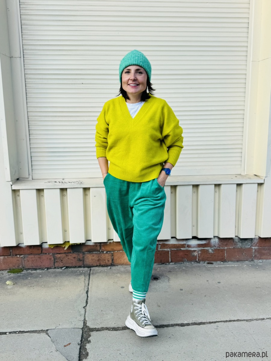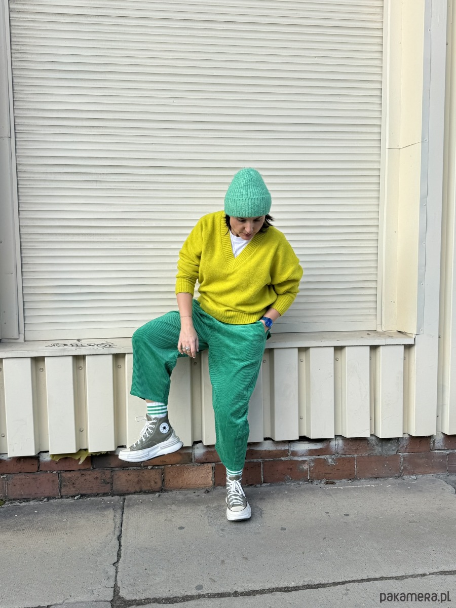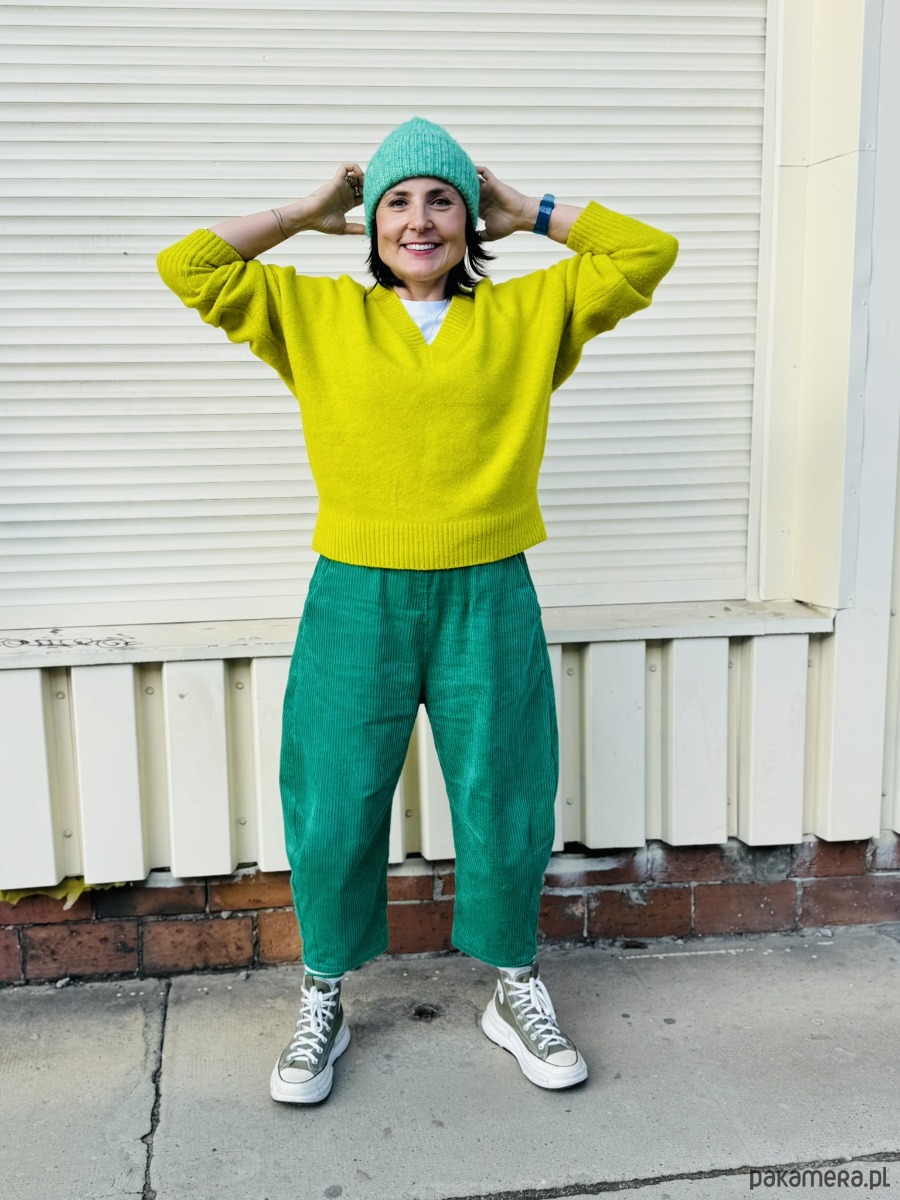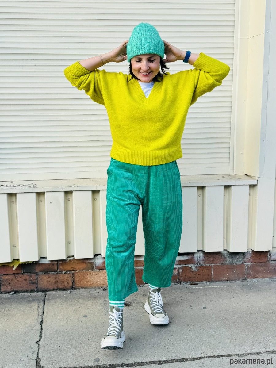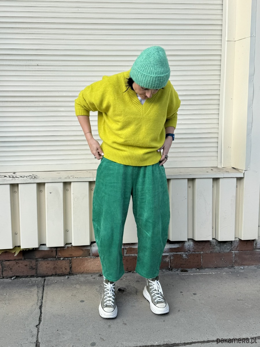 Odważne, oryginalne, wygodne — te spodnie to idealne połączenie stylu i funkcjonalności. Uszyte z grubszego, miekkiego sztruksu w pięknym zielonym kolorze.