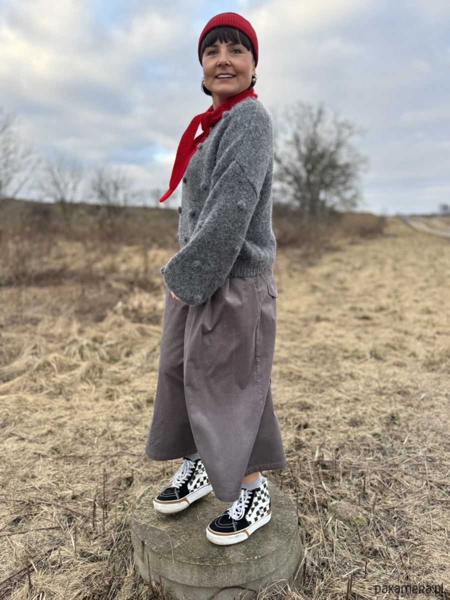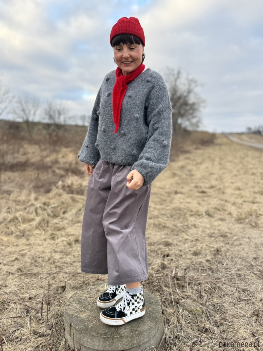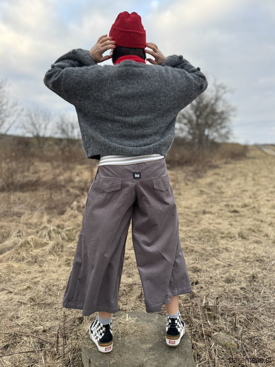 Szare kuloty, które wyglądają jak spódnica, ale dają komfort spodni.