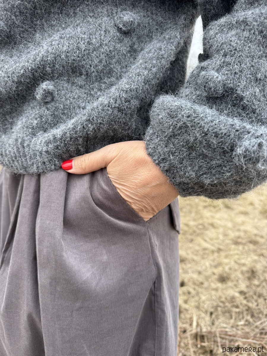 Uszyte z drobnego sztruksu w kolorze szarym, który sprawia, że spodnie świetnie się układają i trzymają formę, zachowując luz i wygodę przy noszeniu.