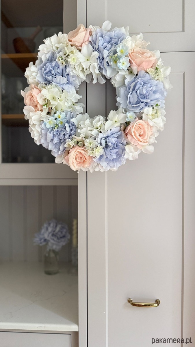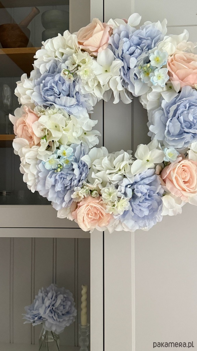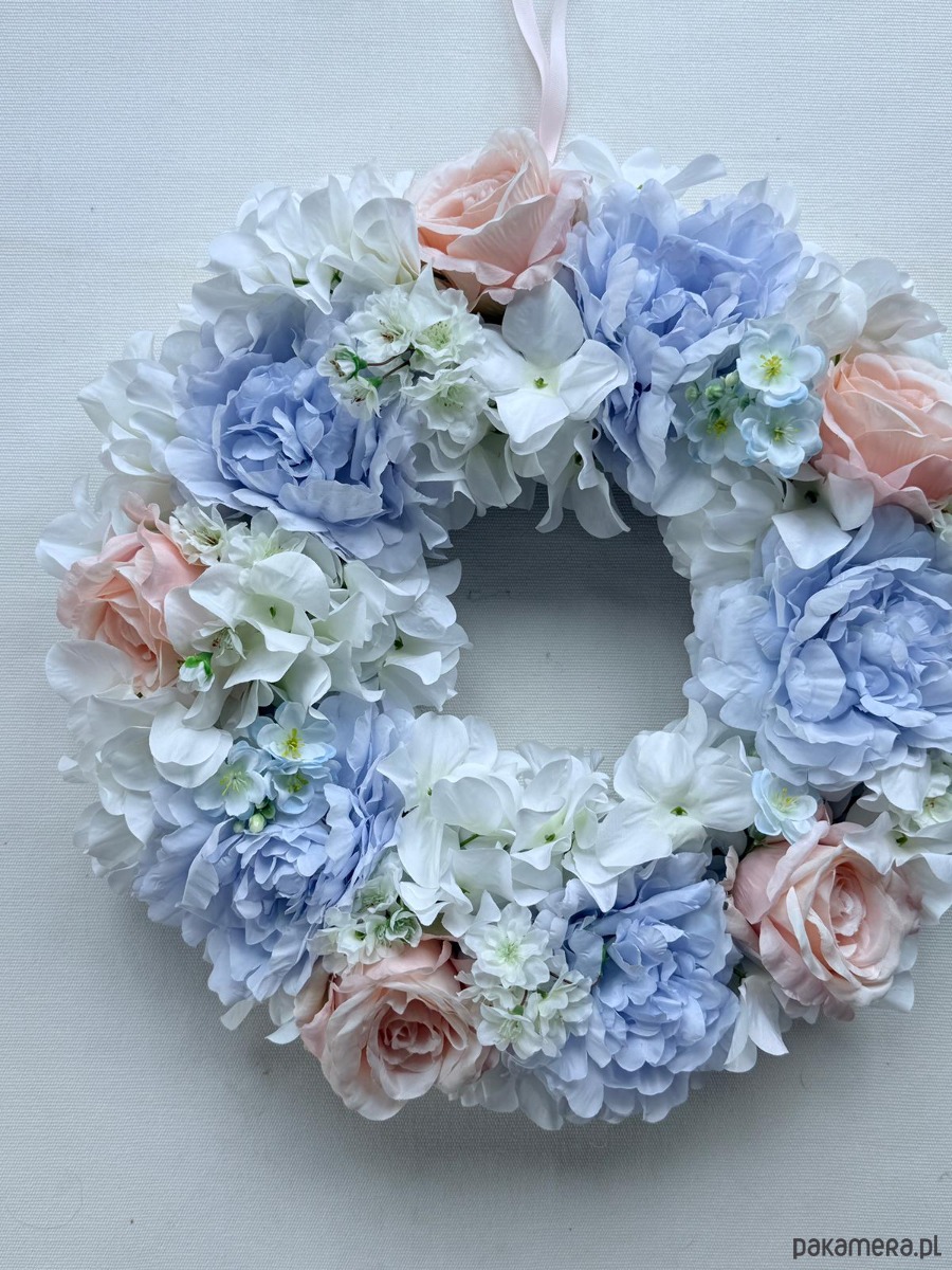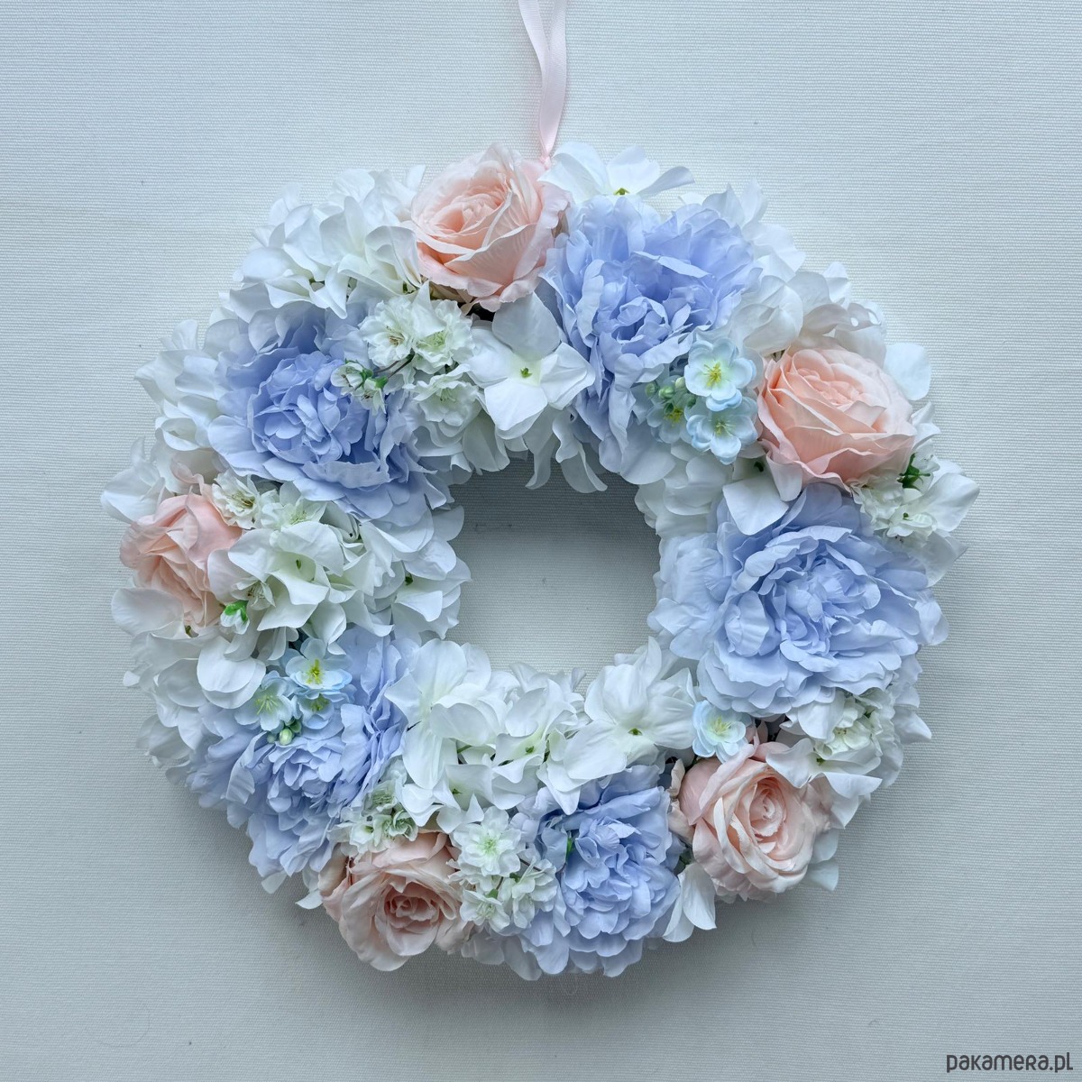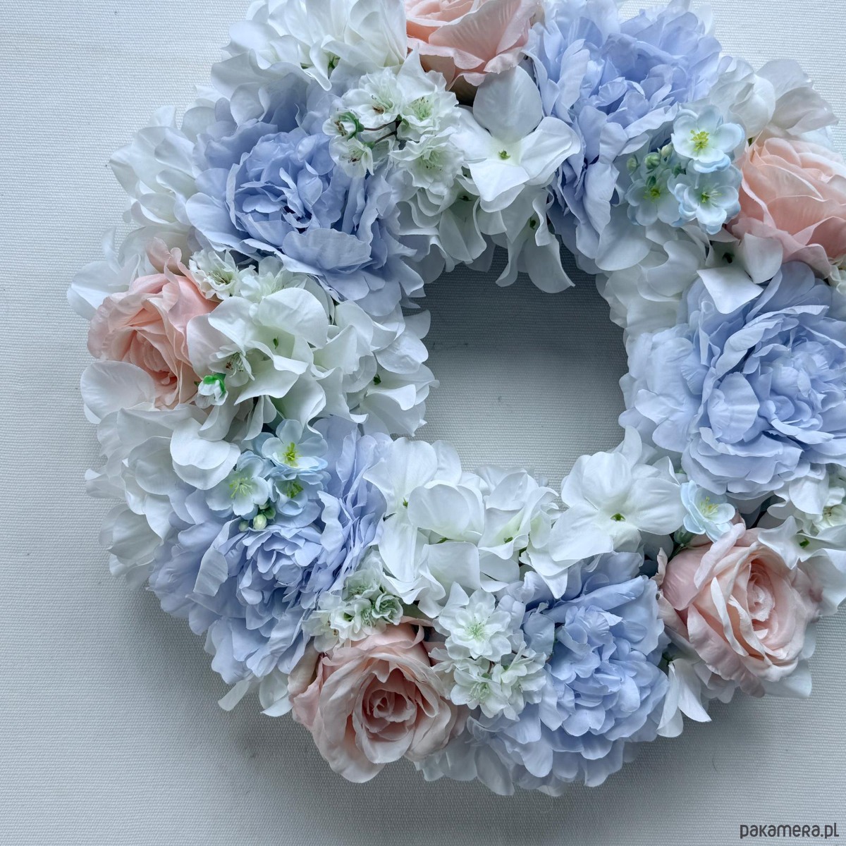 Podstawą jest wiklinowy wianek, dzięki czemu wianek prezentuje się pięknie z każdej strony.