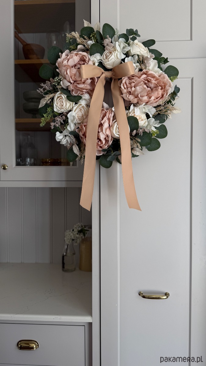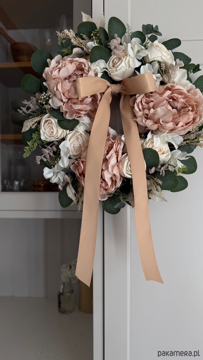 Wianek jest wykonany ręcznie na bardzo estetycznym wiklinowym spodzie, zrobiony z wysokiej jakości kwiatów Herbacianych Peonii, Boho różyczek oraz Eukaliptusa