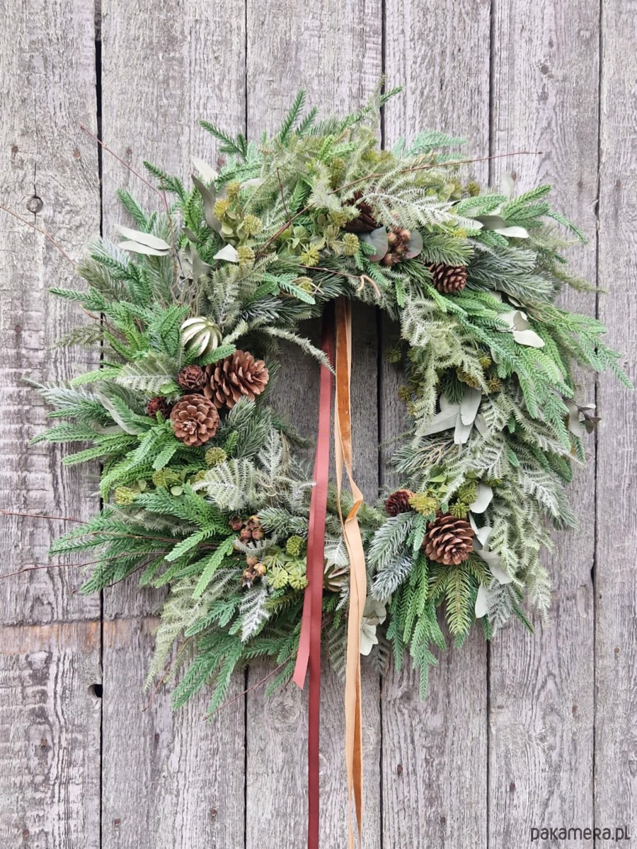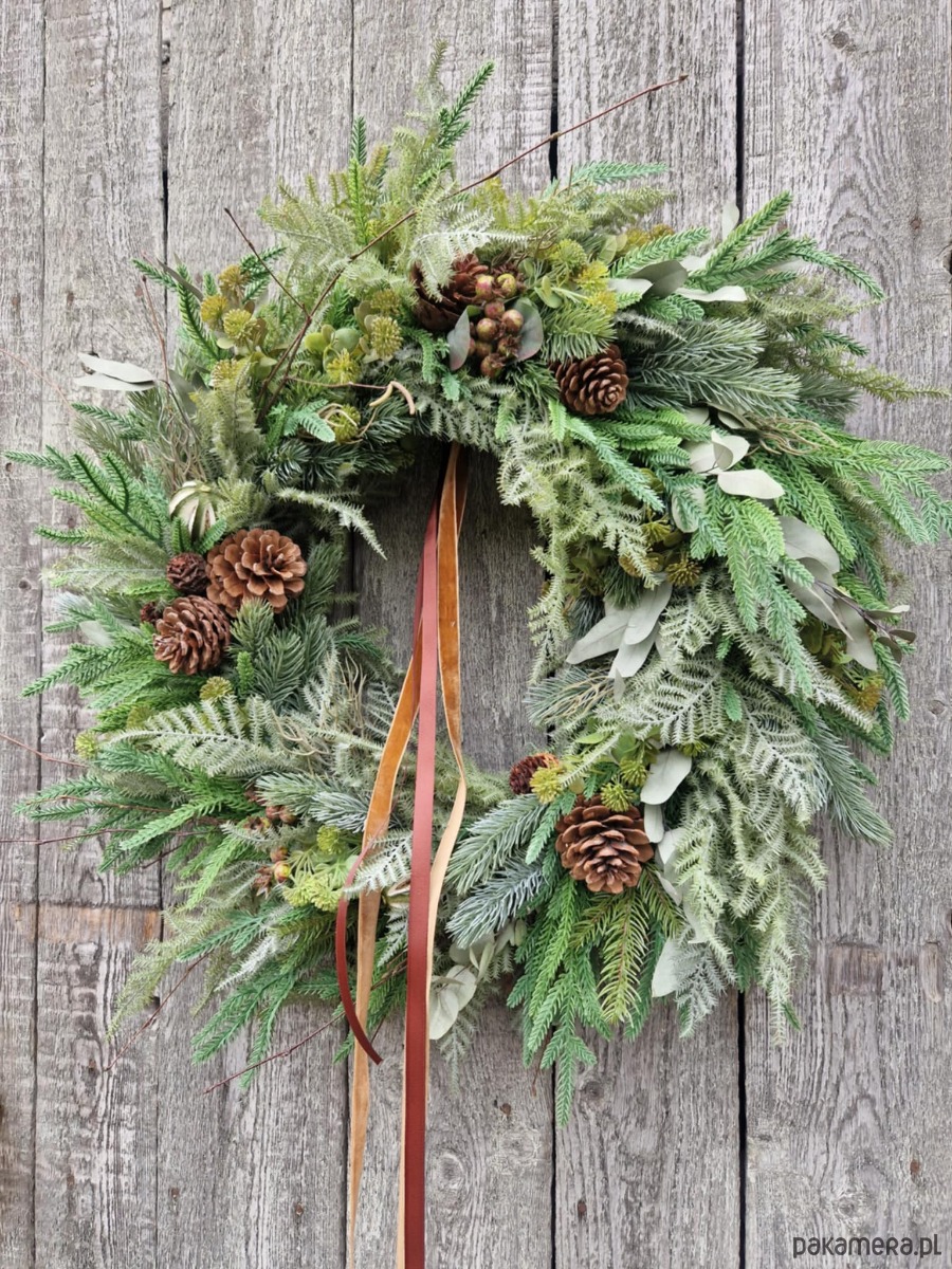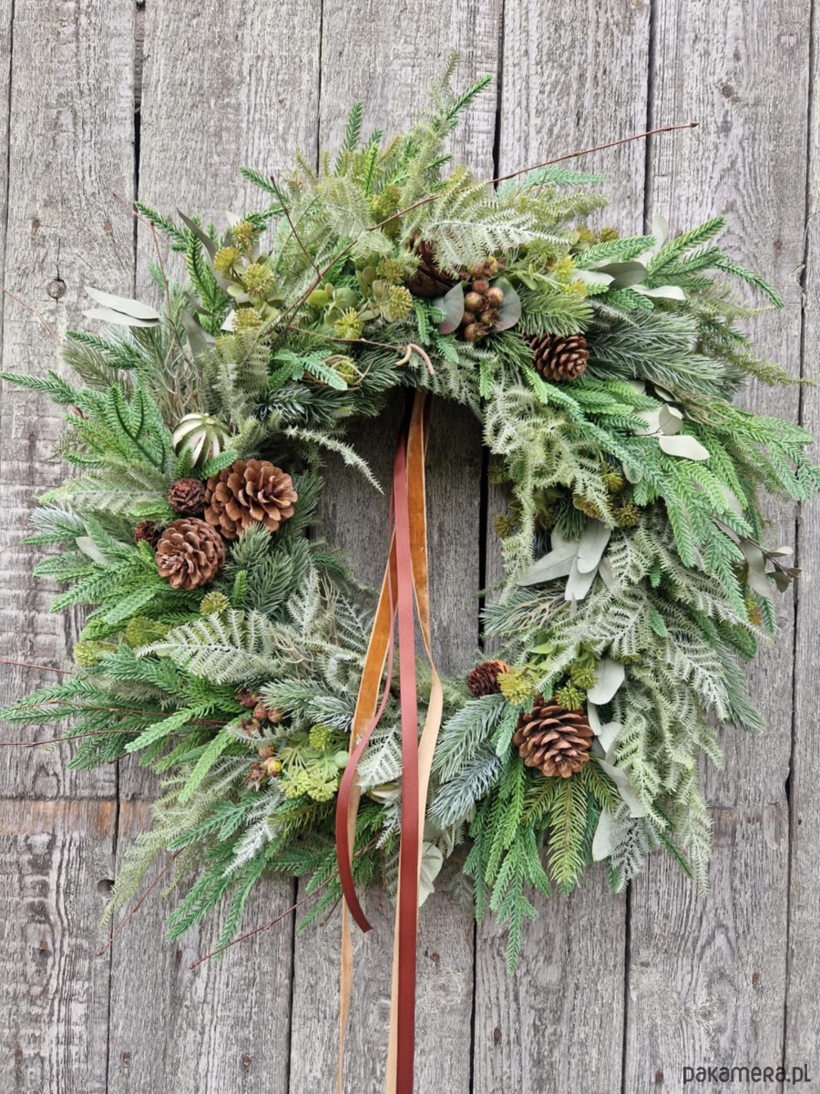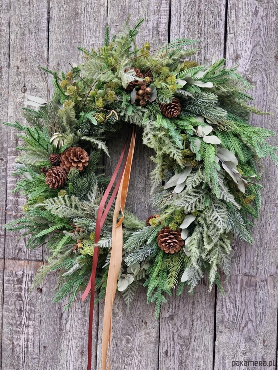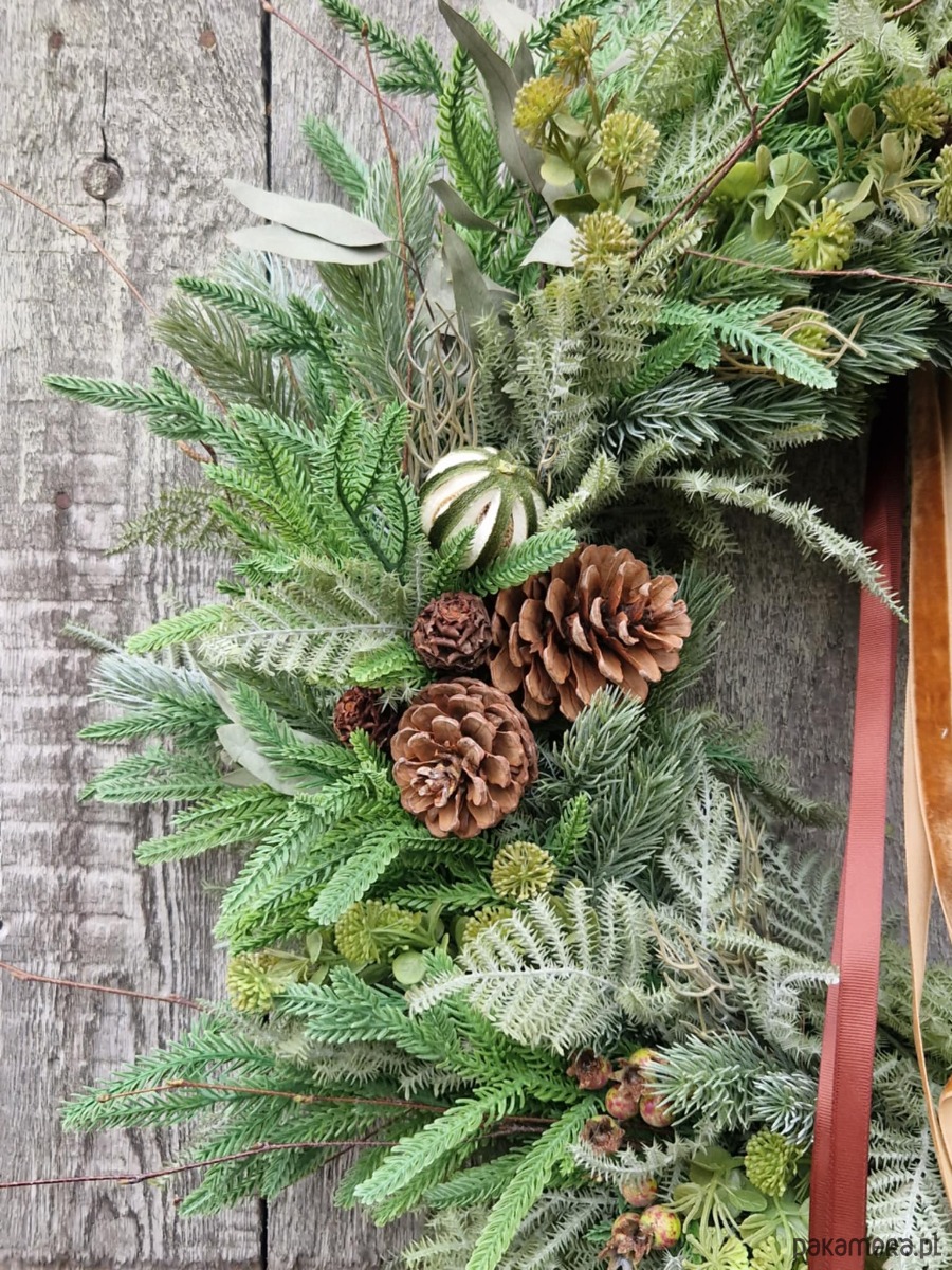 Prezentowany wianek wykonany jest z najwyższej jakości sztucznych gałązek świerka, cyprysa i eukaliptusa. Ozdobiony jest naturalnymi szyszkami oraz limonkami. Wianek jest ogromny i bardzo okazały.