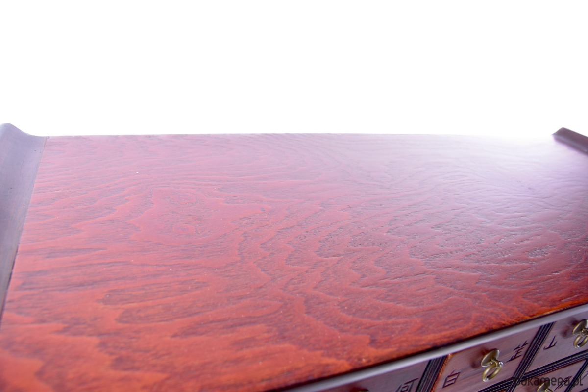 Blat: W kształcie chińskiej pagody, z delikatnie uniesionymi bokami, nadaje meblowi wyjątkowy, orientalny styl.
