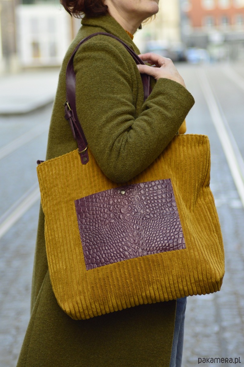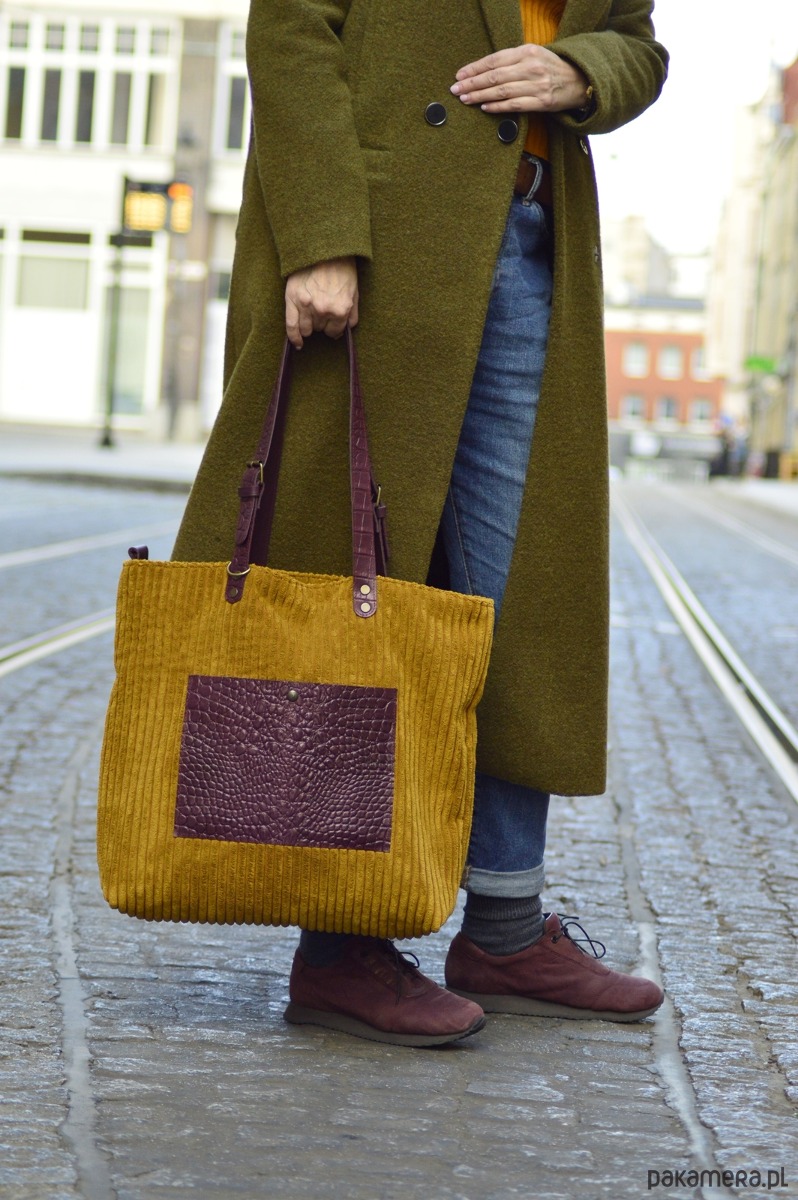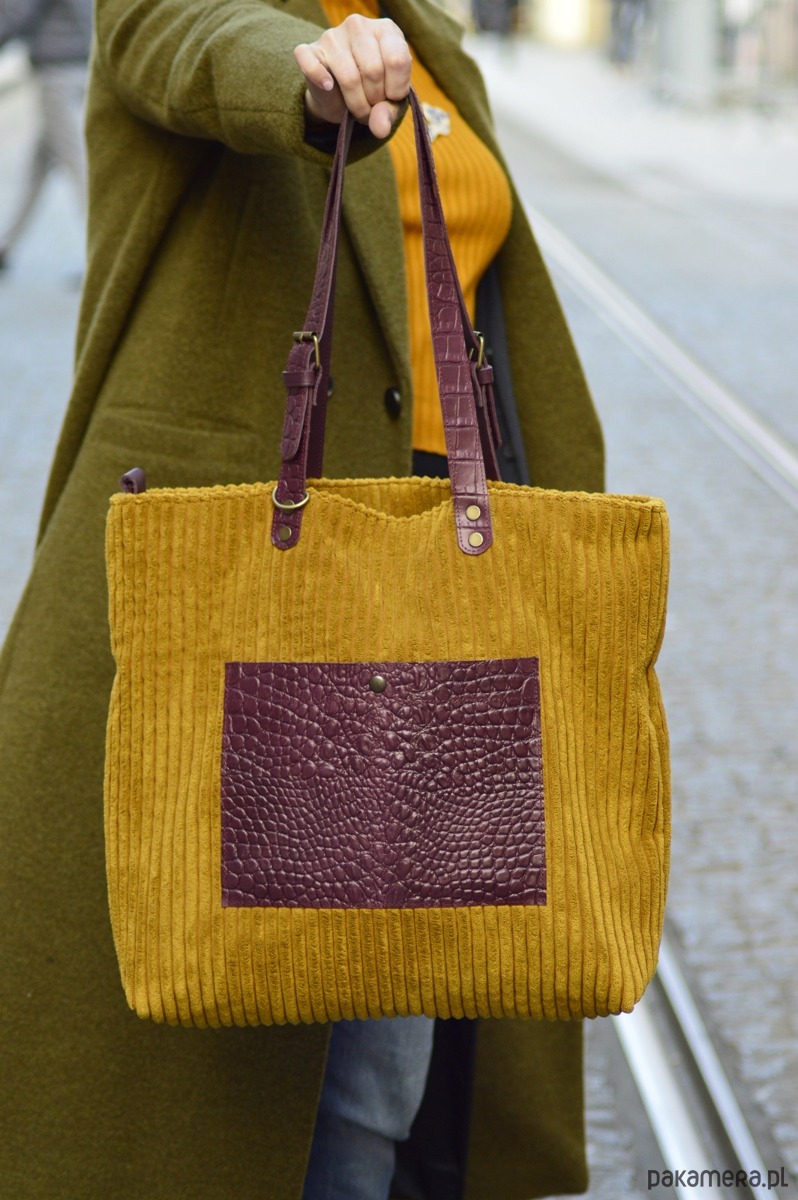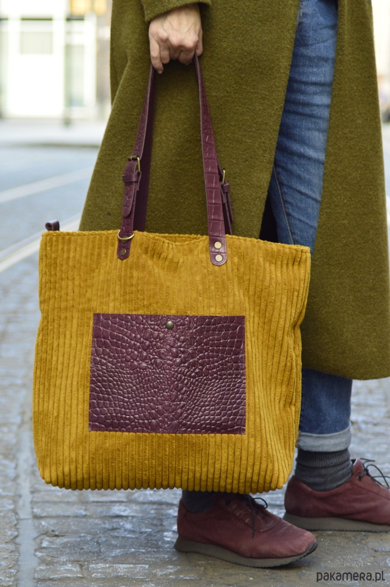 Połączenie sztruksowej żółci i bordowego krokodyla. Całość została wzmocniona warstwą wodoodporną i zapina się na suwak. Wewnątrz znajdują się trzy kieszonki. Regulowane rączki oraz kieszonka na zewnątrz powstały ze skóry skóry naturalnej.