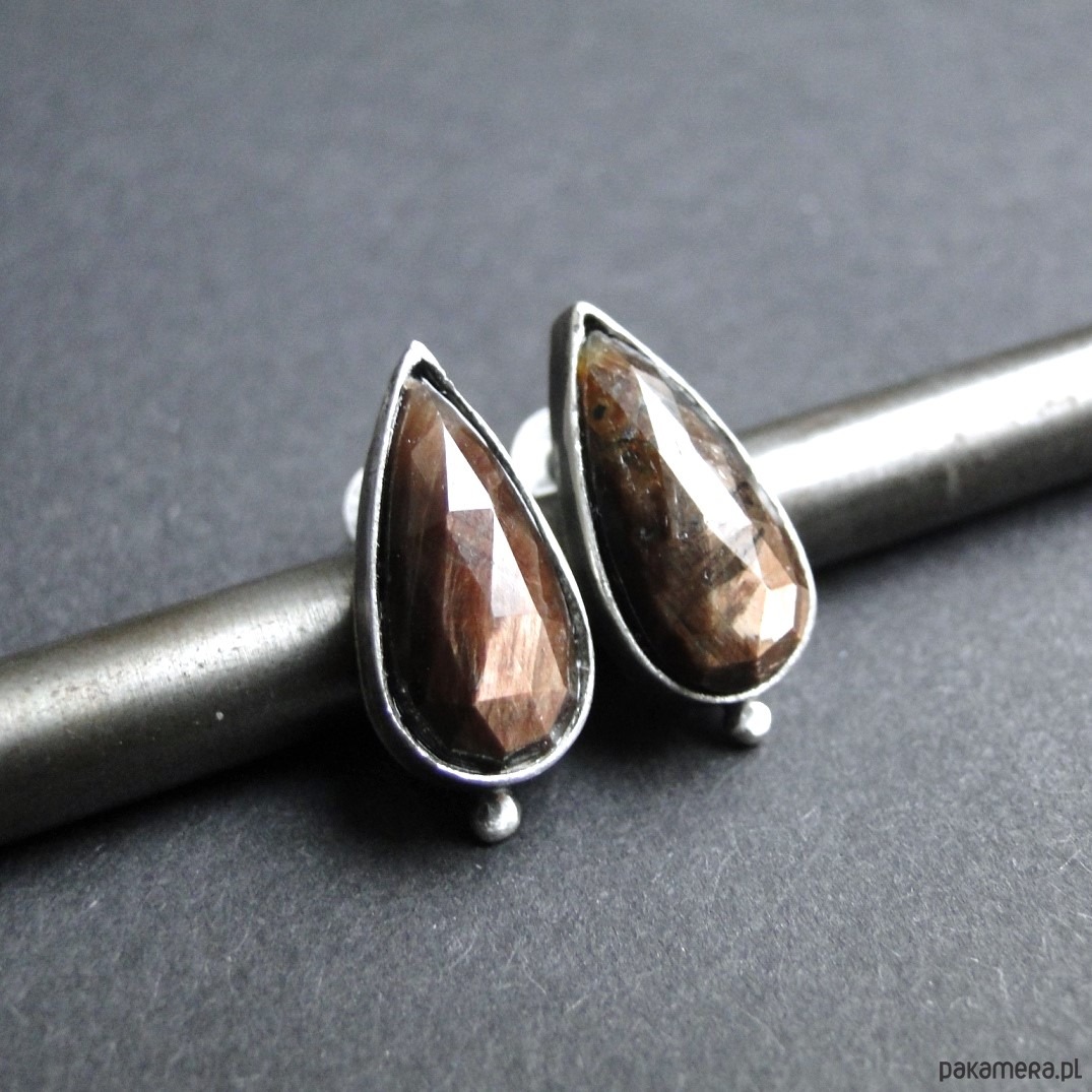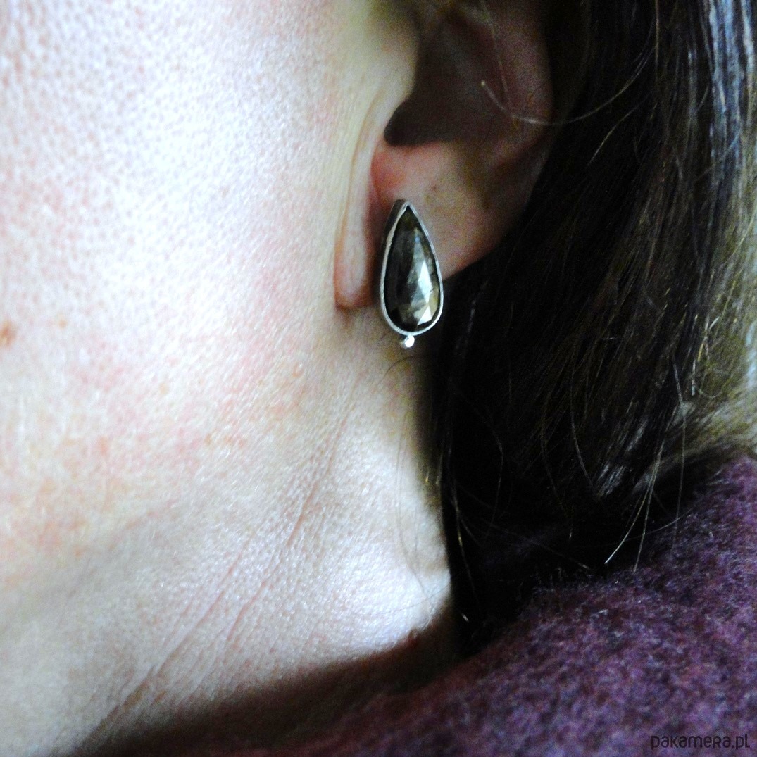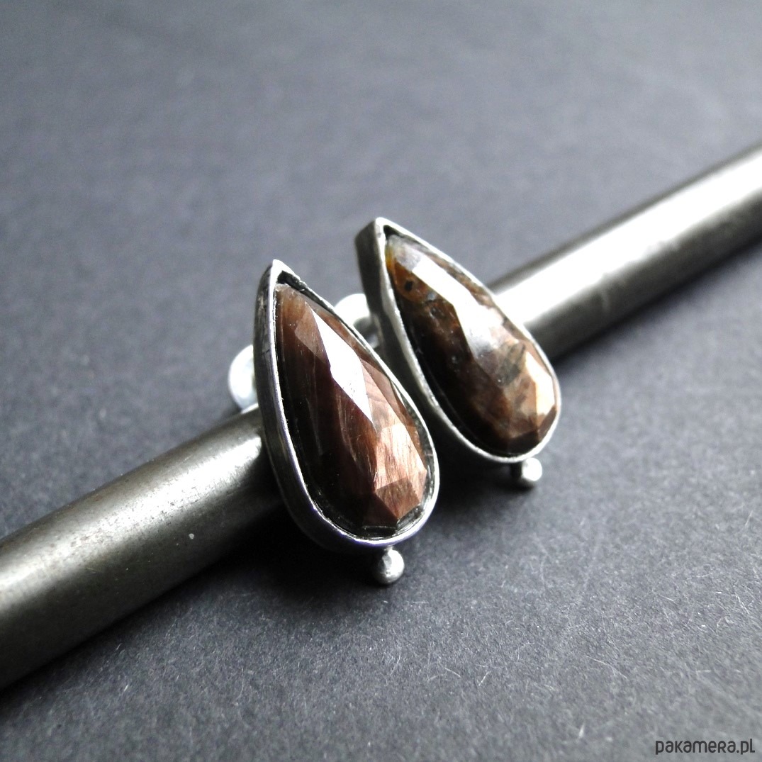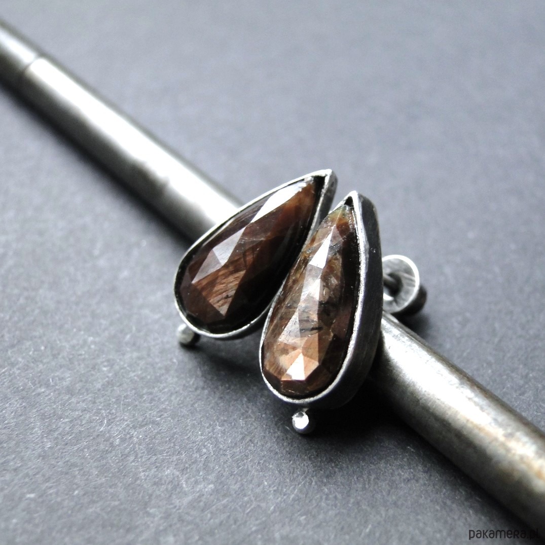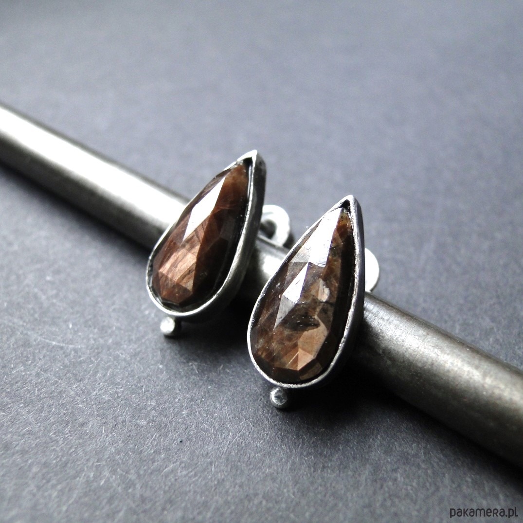 Oryginalne, lekko surowe sztyfty w pojedynczym egzemplarzu. Piękne naturalne szafiry w kolorze chłodnego brązu, z lekko złotawą poświatą. Kamienie fasetowane dł. 1,5 cm. Szafiry należą d o grupy kamieni szlachetnych, ich elegancja sama w sobie nie wymaga bogatej oprawy. Srebro 925,oksydowane i szorowane. Nie moczyć kolczyków w wodzie. Waga kolczyka- 2,75 g.