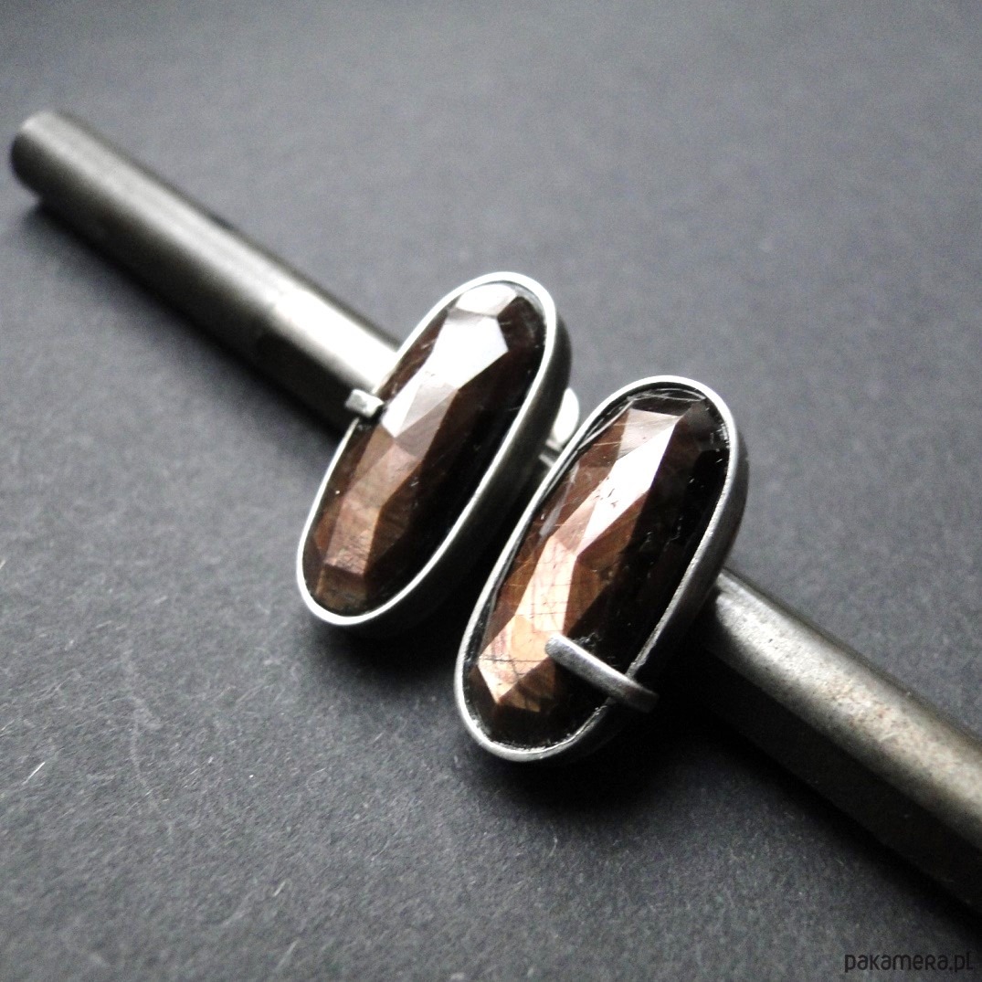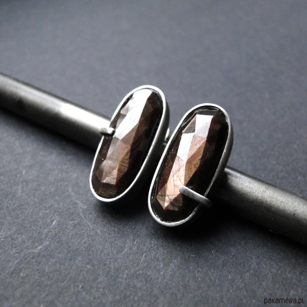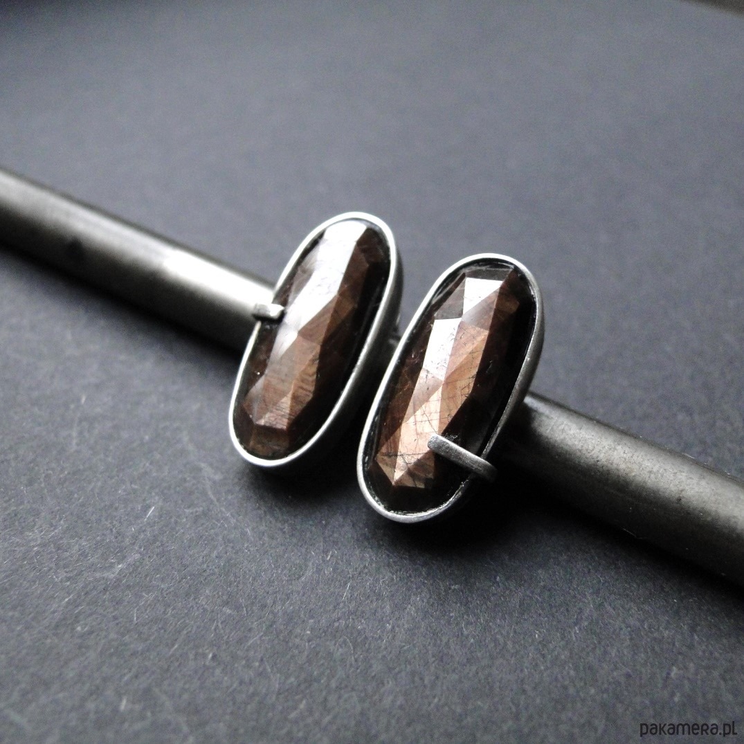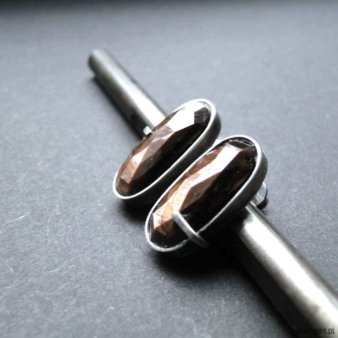 Eleganckie, lekko surowe sztyfty w pojedynczym egzemplarzu. Piękne naturalne szafiry w kolorze chłodnego brązu, z lekko złotawą poświatą. Kamienie fasetowane dł. aż 2,1 cm. Szafiry należą d o grupy kamieni szlachetnych, swoją elegancką nie wymagają bogatej oprawy. Srebro 925,oksydowane i szorowane. Nie moczyć kolczyków w wodzie. Waga kolczyka- 4,23g.