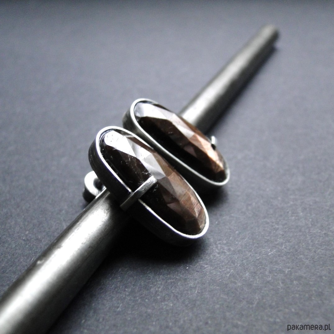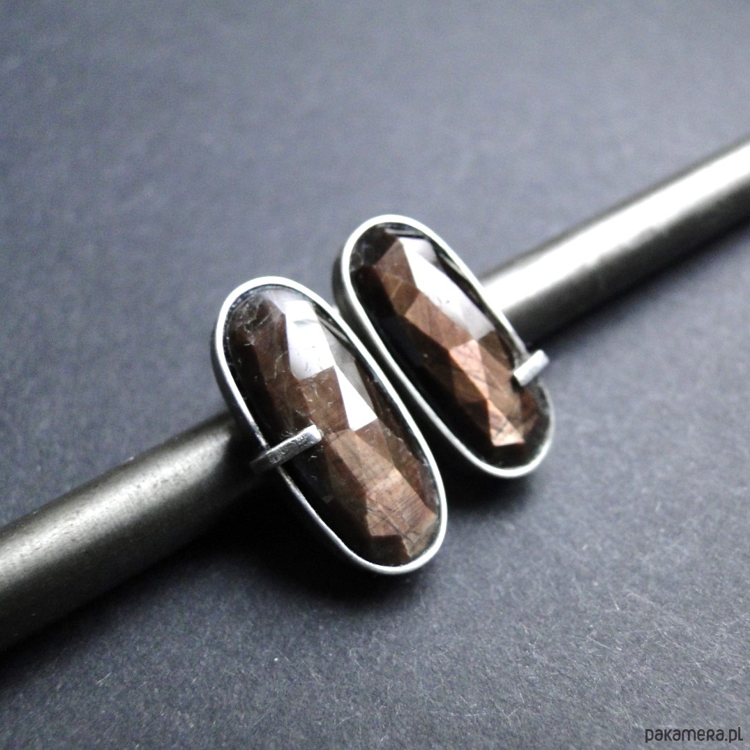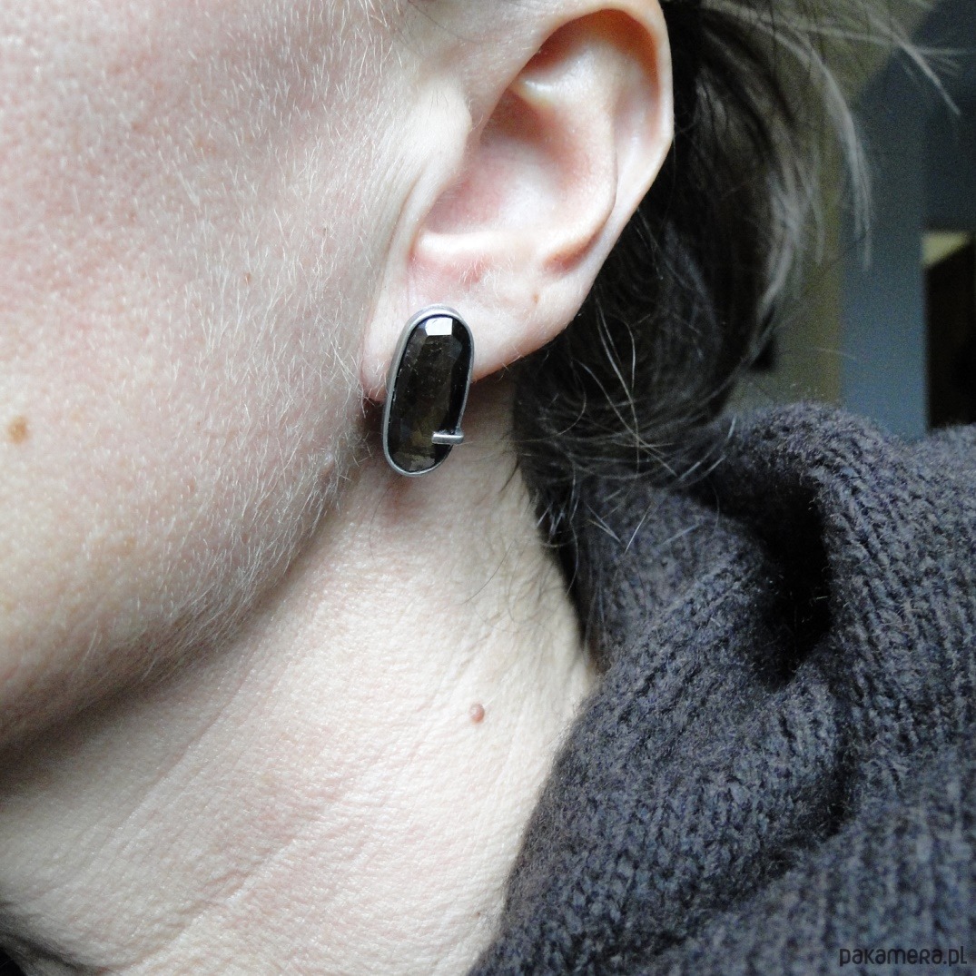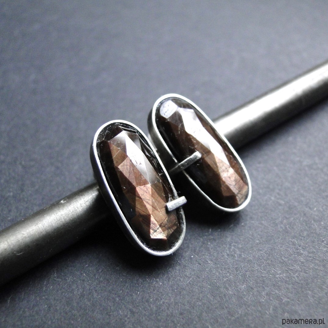 Eleganckie, lekko surowe sztyfty w pojedynczym egzemplarzu. Piękne naturalne szafiry w kolorze chłodnego brązu, z lekko złotawą poświatą. Kamienie fasetowane dł. aż 2,1 cm. Szafiry należą d o grupy kamieni szlachetnych, swoją elegancką nie wymagają bogatej oprawy. Srebro 925,oksydowane i szorowane. Nie moczyć kolczyków w wodzie. Waga kolczyka- 4,23g.