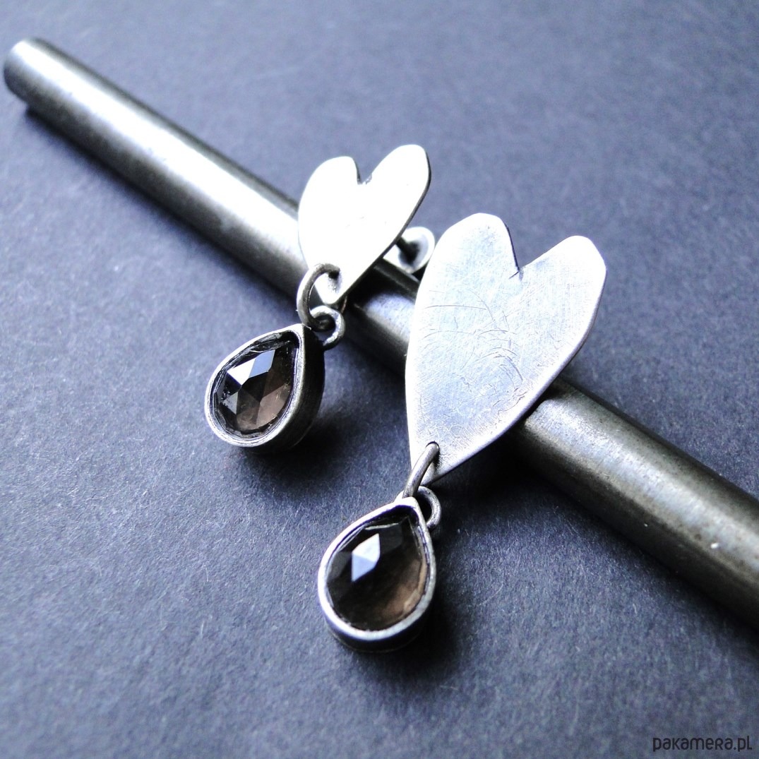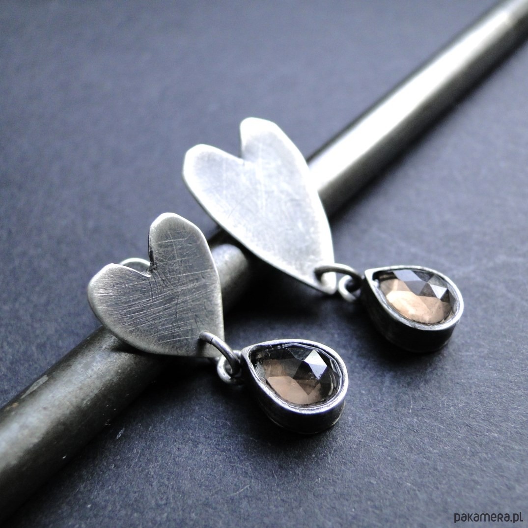 Surowe sztyfty wykonane na zamówienie. Srebro 925,oksydowane i szorowane. Kamienie: kwarc dymny 8x6mm fasetowany. Unikać moczenia w wodzie.