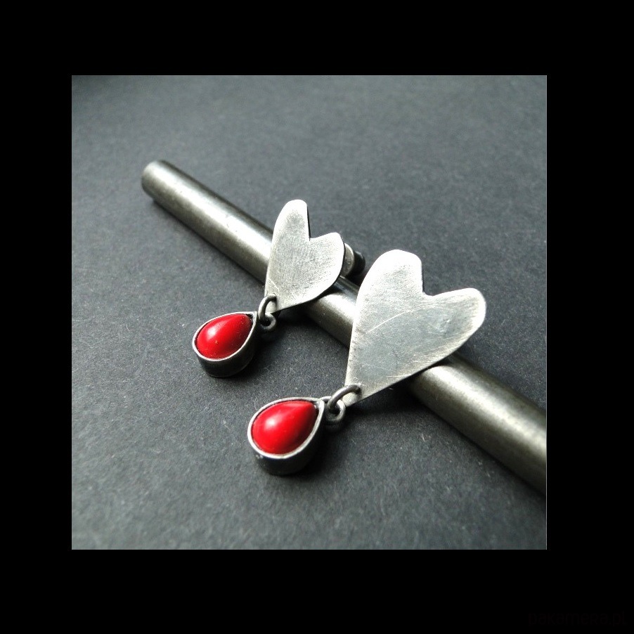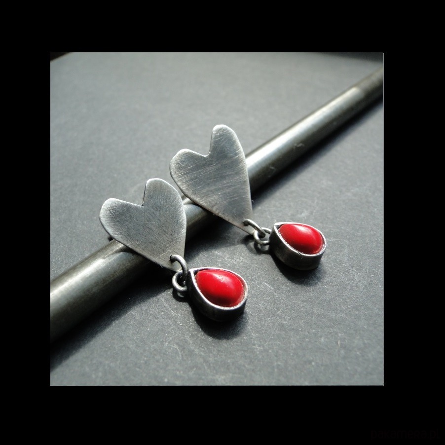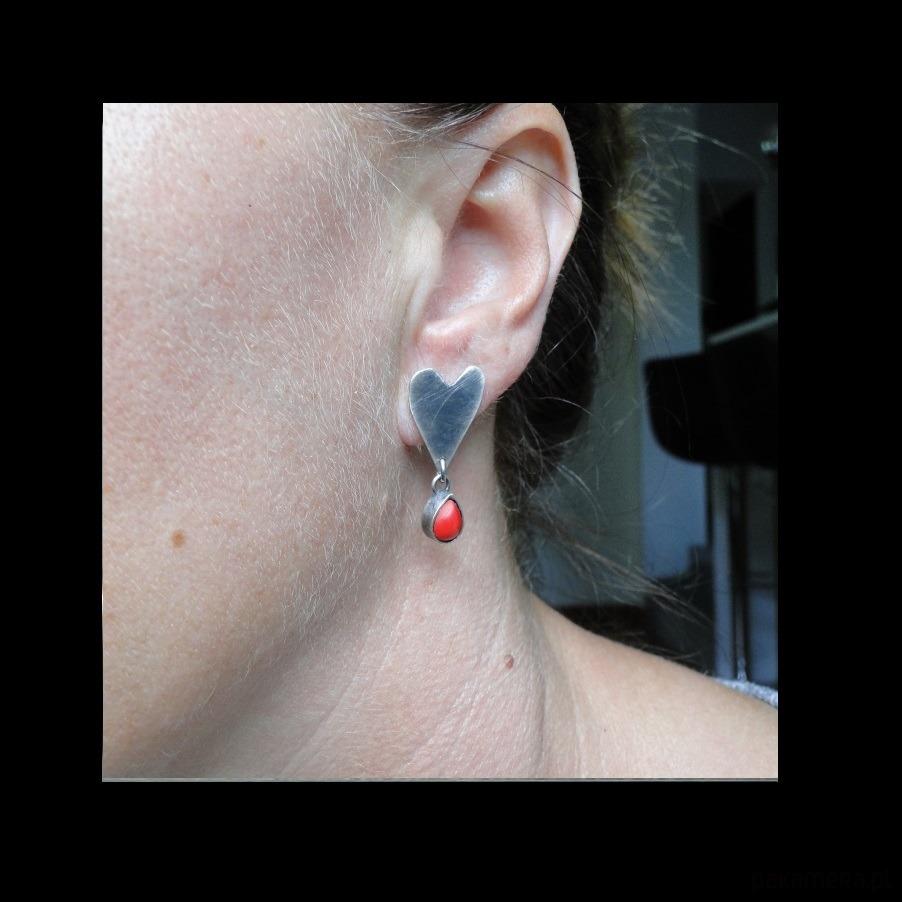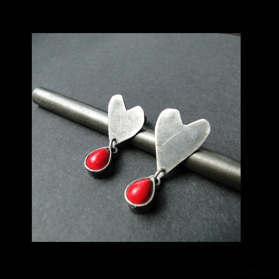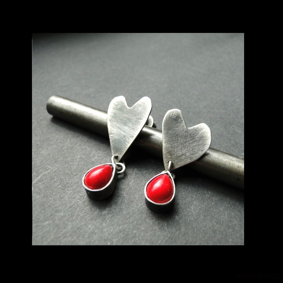 Surowe, nietuzinkowe sztyfty wykonane ręcznie ze srebra pr.925.Oksydowane i szorowane. Sztyfty są asymetryczne,mniejszy i ciut większy kolczyk. Serca ręcznie wycinane. Kamień: naturalny koral czerwony o wym.8x6mm. Długość kolczyków odpowiednio: 3 cm i 2,6 cm. Zdejmować do kąpieli.
