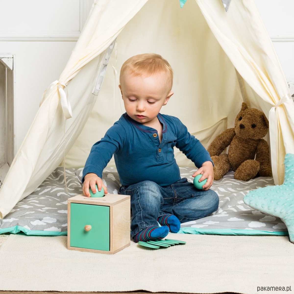 Dziecko wkłada drewnianą kulkę (o średnicy 4,5 cm) lub żeton (o średnicy 6 m) w otwór w pudełku, a następnie może otworzyć szufladkę i wyjąć schowany przedmiot. Maluch znajduje ukrytą zabawkę, której chwilowo nie widział, i może się nią nadal bawić – dzięki temu dostrzega, że wrzucone do pudełka rzeczy nie znikają. Zabawka jest tak skonstruowana, że nie ma możliwości wrzucenia kulki w otwór na żeton ani odwrotnie.