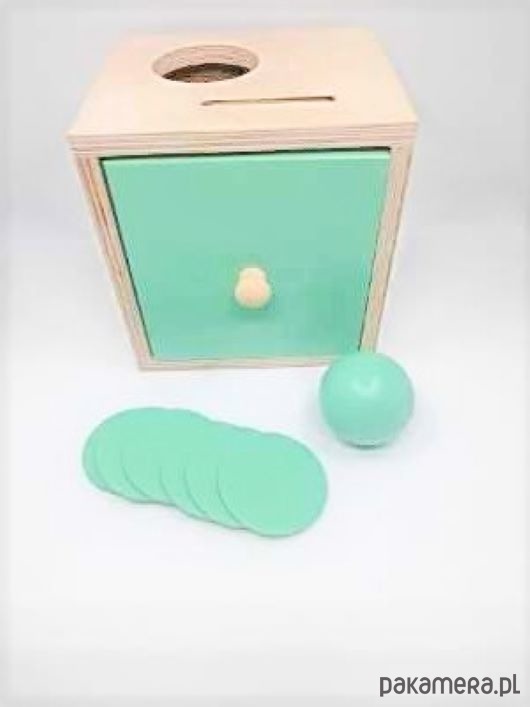 Szufladka Montessori – 2w1 to drewniane pudełko z szufladką oraz ze specjalnymi otworami – na żeton i na kulkę. Zadaniem dziecka jest włożenie przedmiotów a następnie wyjęcie ich poprzez wyciągnięcie szufladki.
