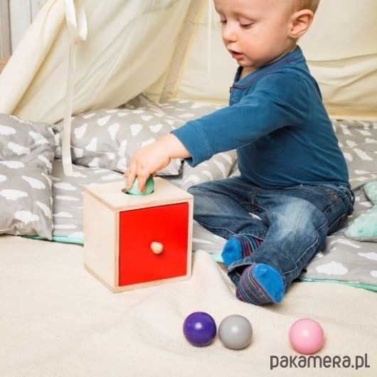 Szufladka Montessori to drewniane pudełko z szufladką oraz ze specjalnymi otworami, przez które wrzuca się żeton lub kulkę. Dziecko wkłada przedmiot w otwór w pudełku, a następnie może otworzyć szufladkę i wyjąć ukrytą rzecz. Maluch znajduje schowaną zabawkę, której chwilowo nie widział, i może się nią nadal bawić – dzięki temu dostrzega, że wrzucone do pudełka rzeczy nie znikają. Istnieje także możliwość dokupienia większej ilości żetonów lub kulek oraz wybrania koloru zestawu.