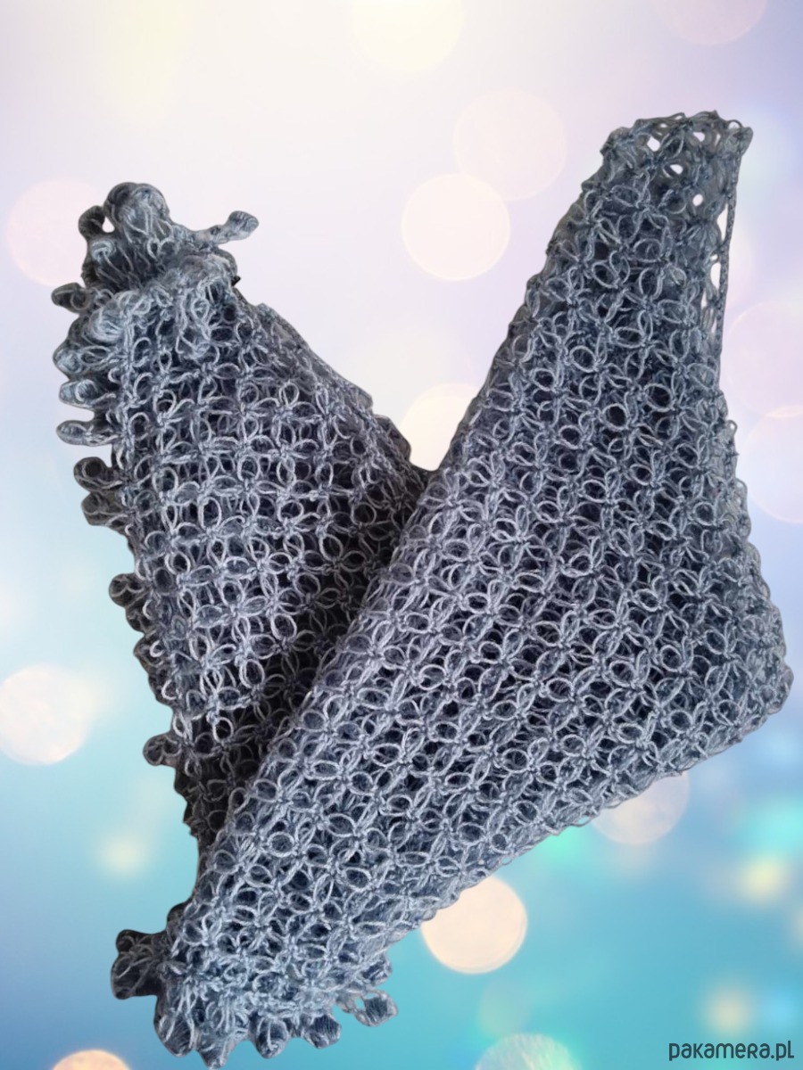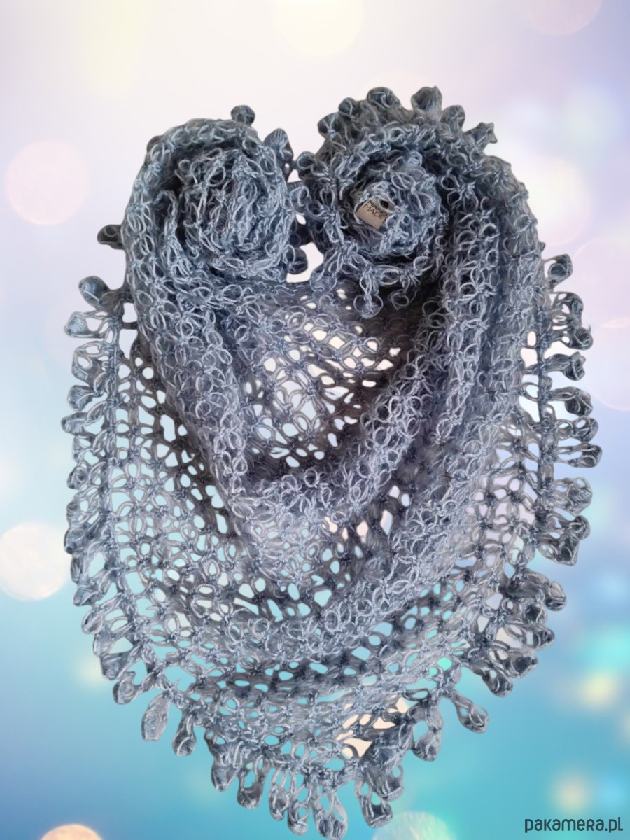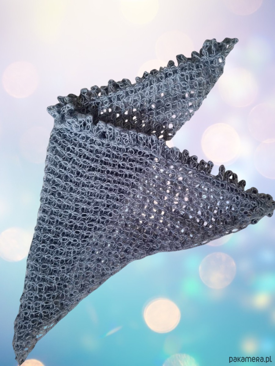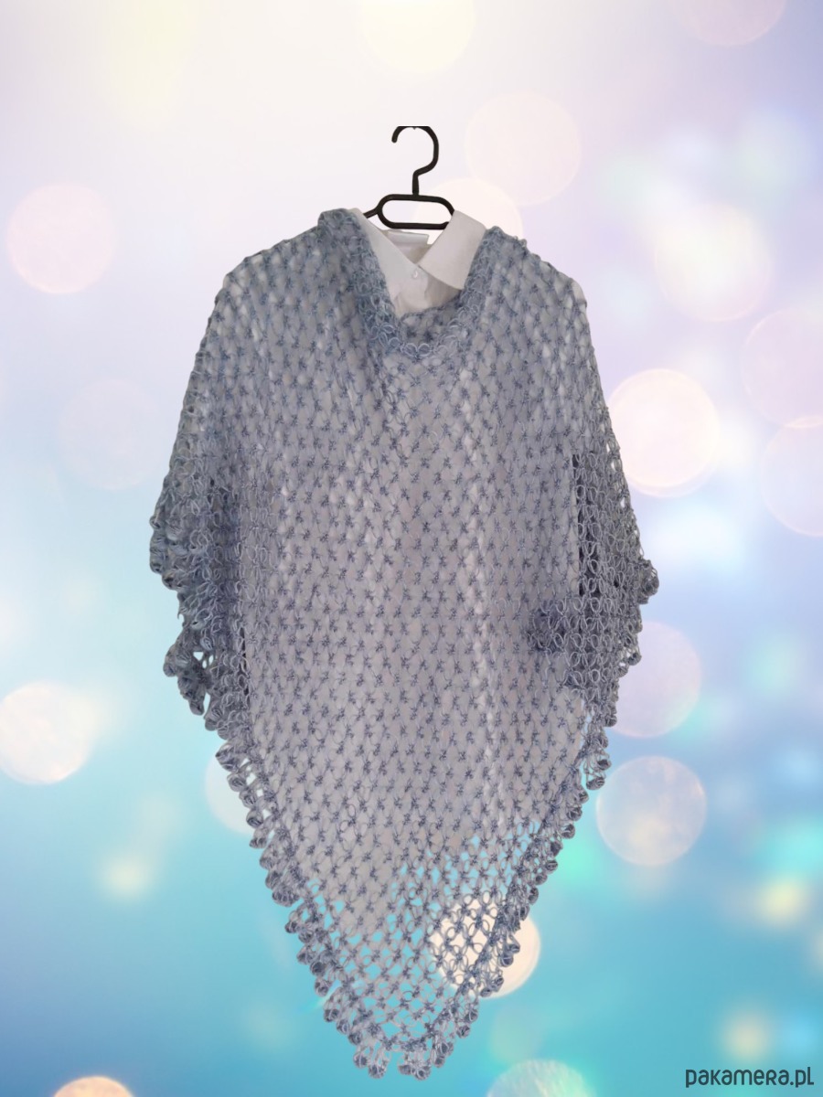 Szydełkowa chusta wykonana z włóczki alize angora gold. Długość najdłuższego boku 195 cm; pozostałe boki 135 cm. Miękka i delikatna. Przepiękna kolor jeansowy. Gorąco polecam. Na wiosenne, jesienne i zimowe wieczory. Będzie ślicznym dodatkiem do każdego ubioru.