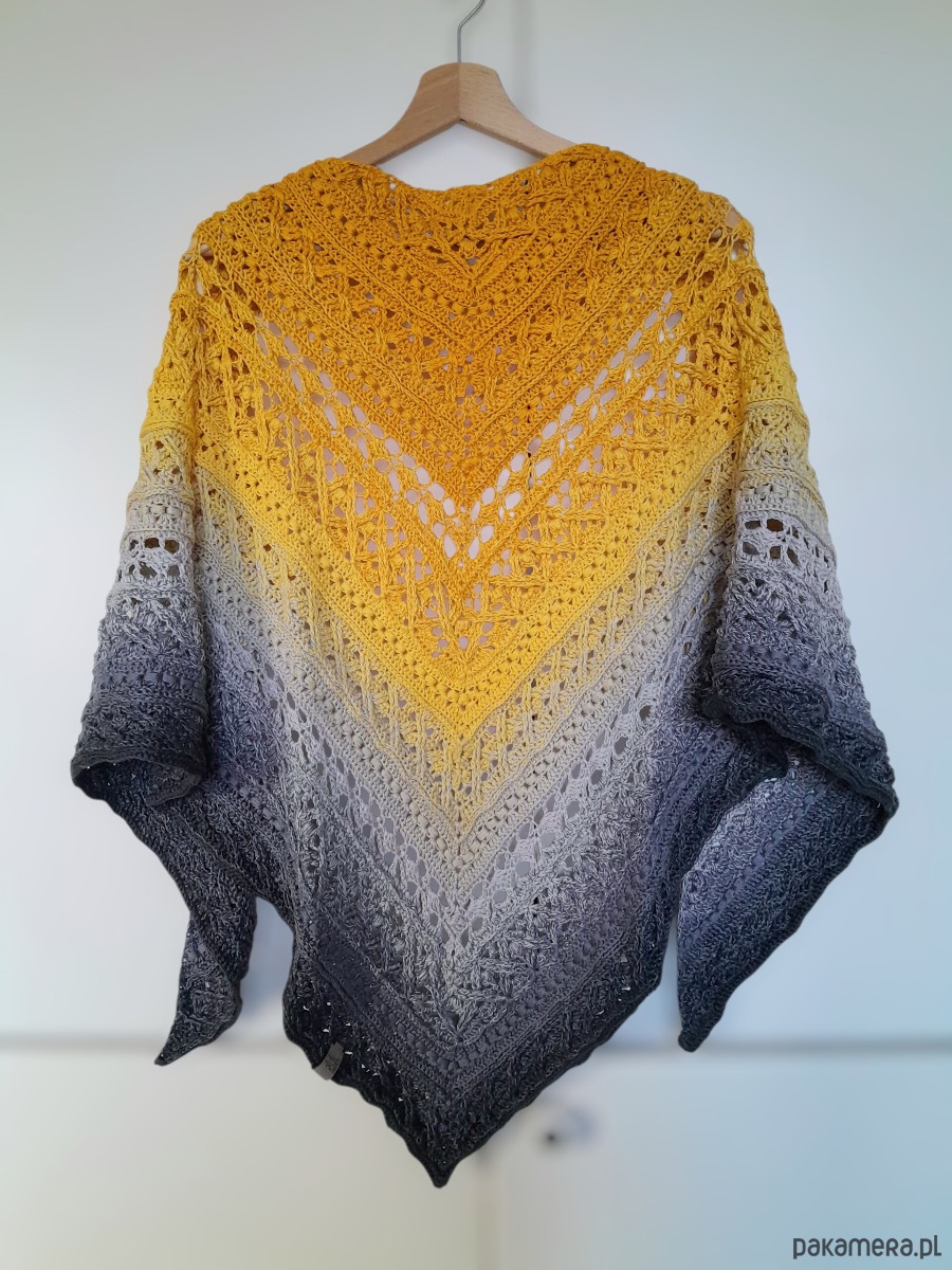 Chusta została wykonana z wysokiej jakości, polskiej włóczki o składzie 50% bawełna 50% akryl, a więc nie daje uczucia drapania, a zarazem grzeje i oddycha. Kolory gotowej chusty to kurkuma, żółty, beż, średni i ciemny szary.