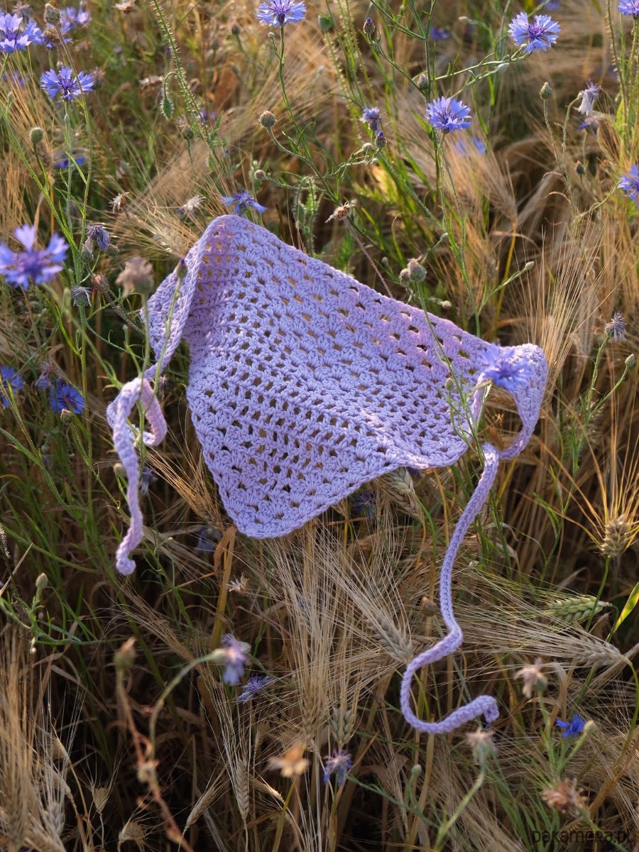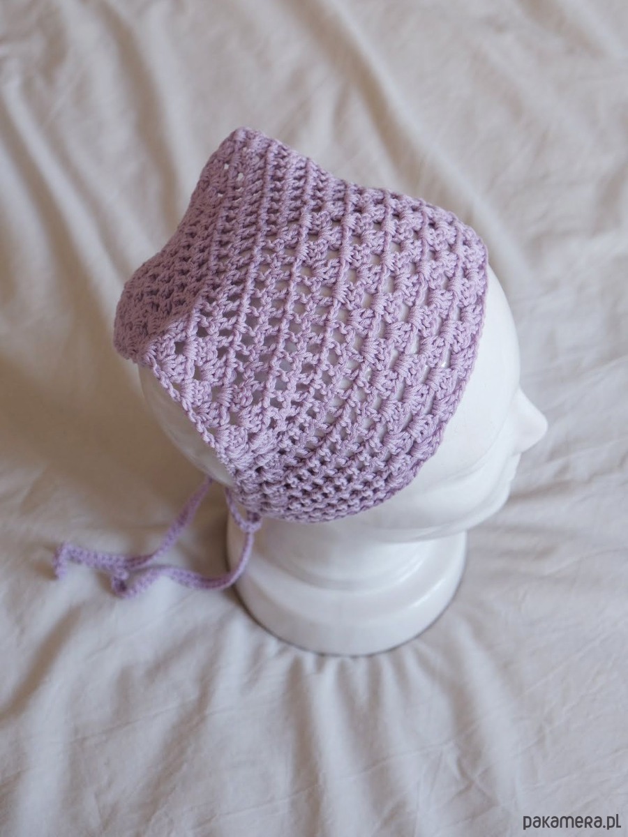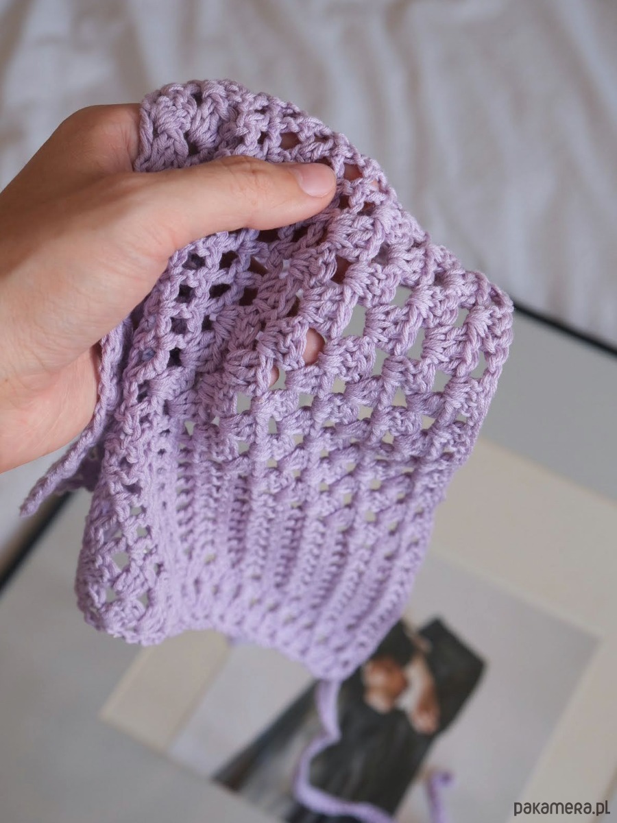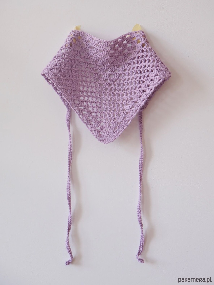 Szydełkowa chustka o wymiarach 32 x 32 x 48 cm.