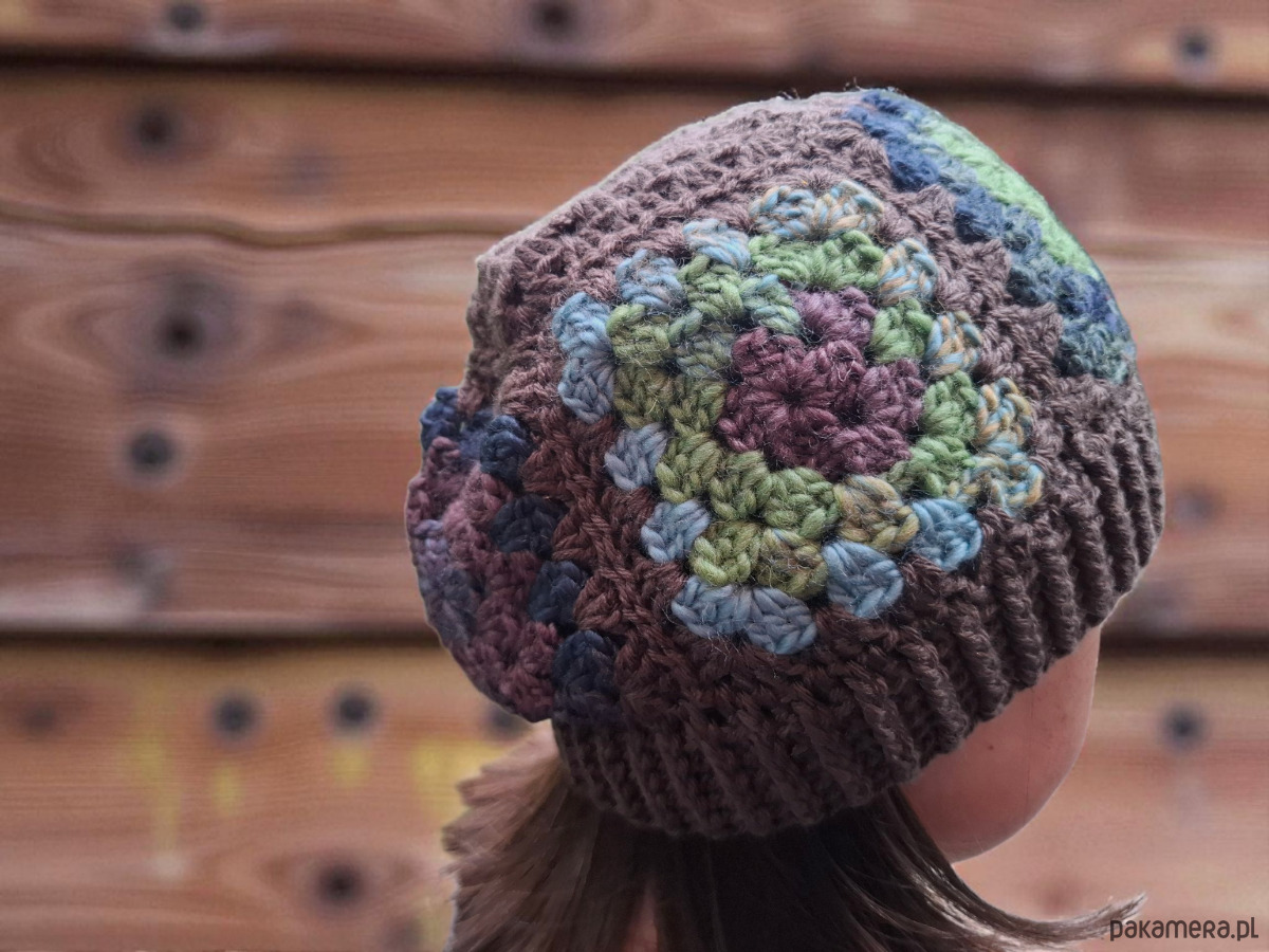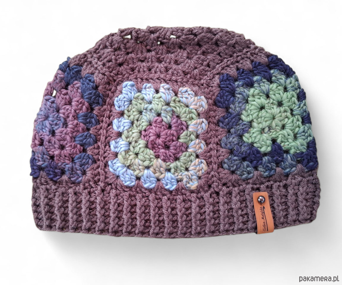 Ta czapka to ręcznie robione nakrycie głowy na szydełku, które łączy w sobie tradycyjny wzór granny square z nowoczesnym stylem. Starannie wykonana z miękkiej włóczki w odcieniach śliwkowego fioletu, zieleni, błękitu i granatu, zachwyca unikalnym designem i pięknymi przejściami kolorystycznymi.