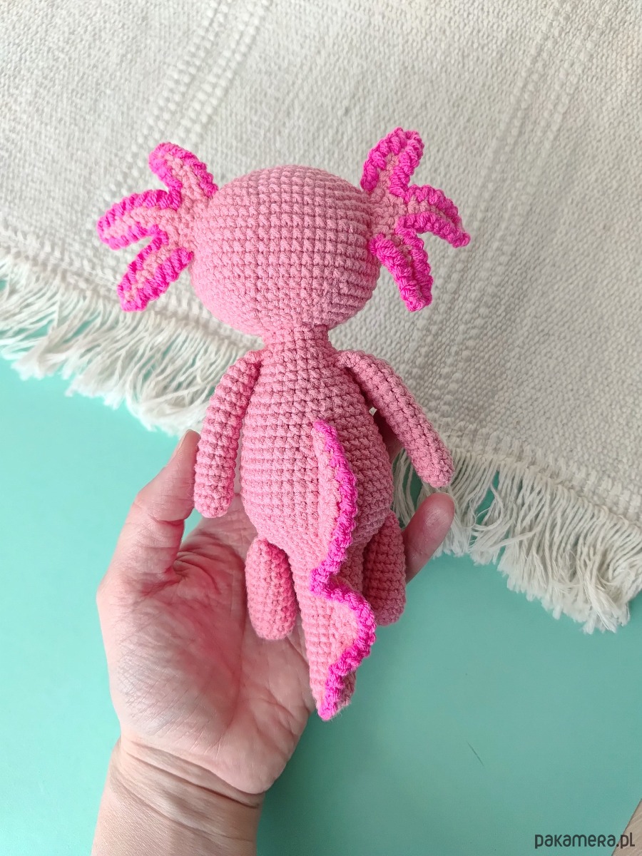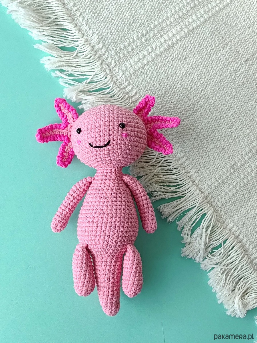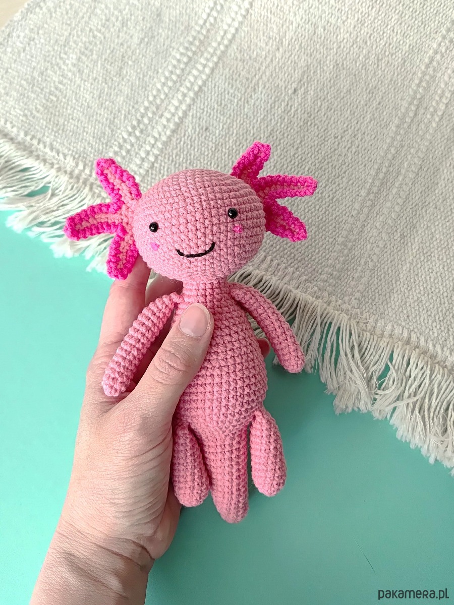 Uroczy różowy aksolotl — mięciutki, spokojny i zawsze w dobrym humorze. Idealny towarzysz dla tych, którzy lubią dziwne, ale słodkie stworzonka.