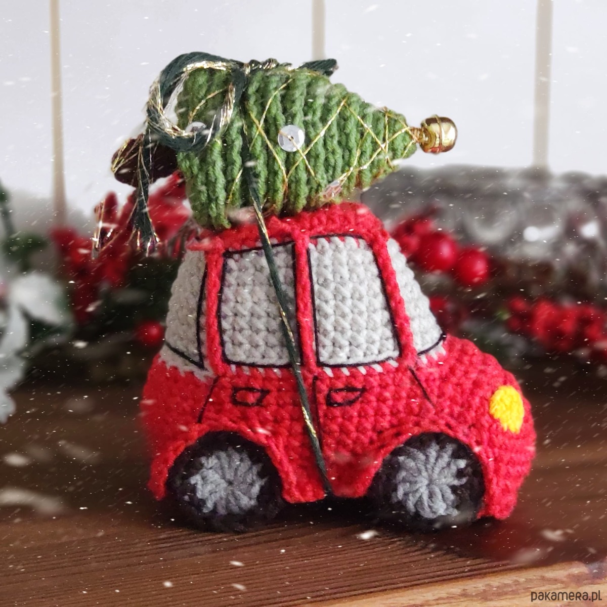 Szydełkowe czerwone autko  z ozdobą świąteczną w postaci choinki.