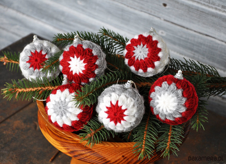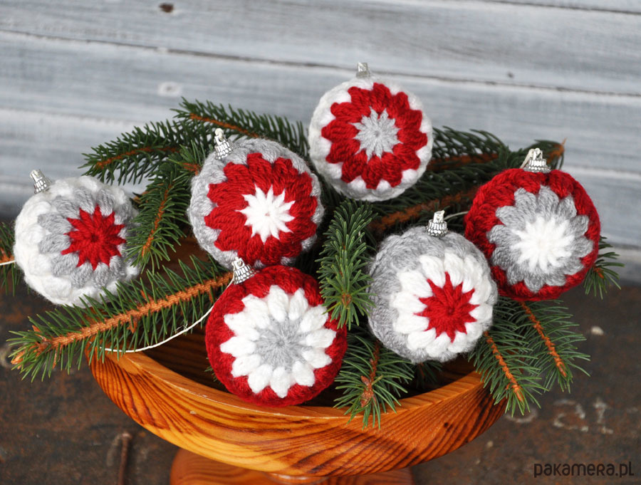 Piękne i wyjątkowe bombki świąteczne w szydełkowym ubranku, na styropianowej bazie; kolorystyka szary, czerwony i biały- w różnych kombinacjach; średnica bombek 6cm, w zestawie 6szt; do bombek są przymocowane sznureczki, umożliwiające ich zawieszenie; zapraszam