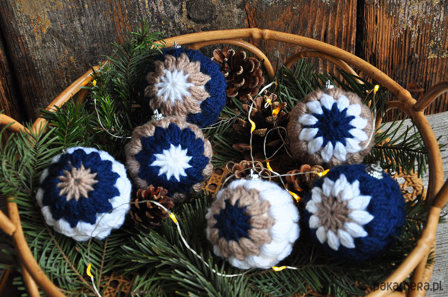 Piękne i wyjątkowe bombki świąteczne w szydełkowym ubranku, na styropianowej bazie; kolorystyka granat, beż i biały- w różnych kombinacjach; średnica bombek 6cm, w zestawie 6szt; do bombek są przymocowane sznureczki, umożliwiające ich zawieszenie; zapraszam