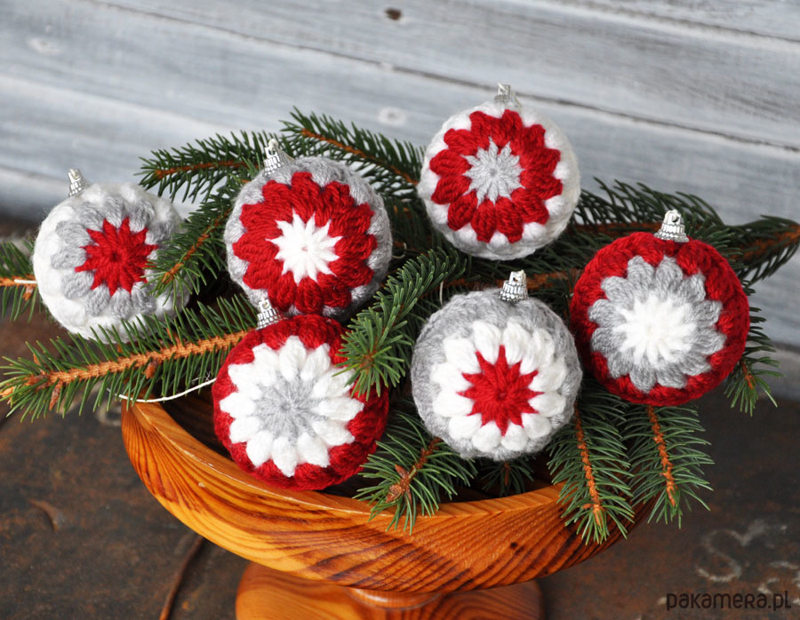 Piękne i wyjątkowe bombki świąteczne w szydełkowym ubranku, na styropianowej bazie; kolorystyka szary, czerwony i biały- w różnych kombinacjach; średnica bombek 6cm, w zestawie 6szt; do bombek są przymocowane sznureczki, umożliwiające ich zawieszenie; zapraszam