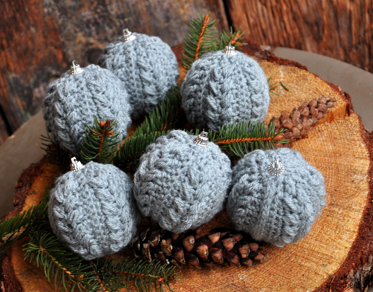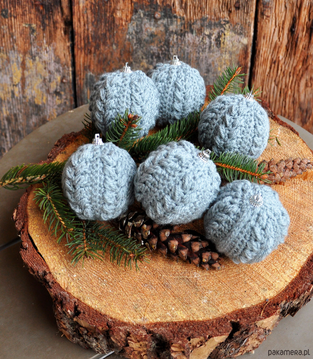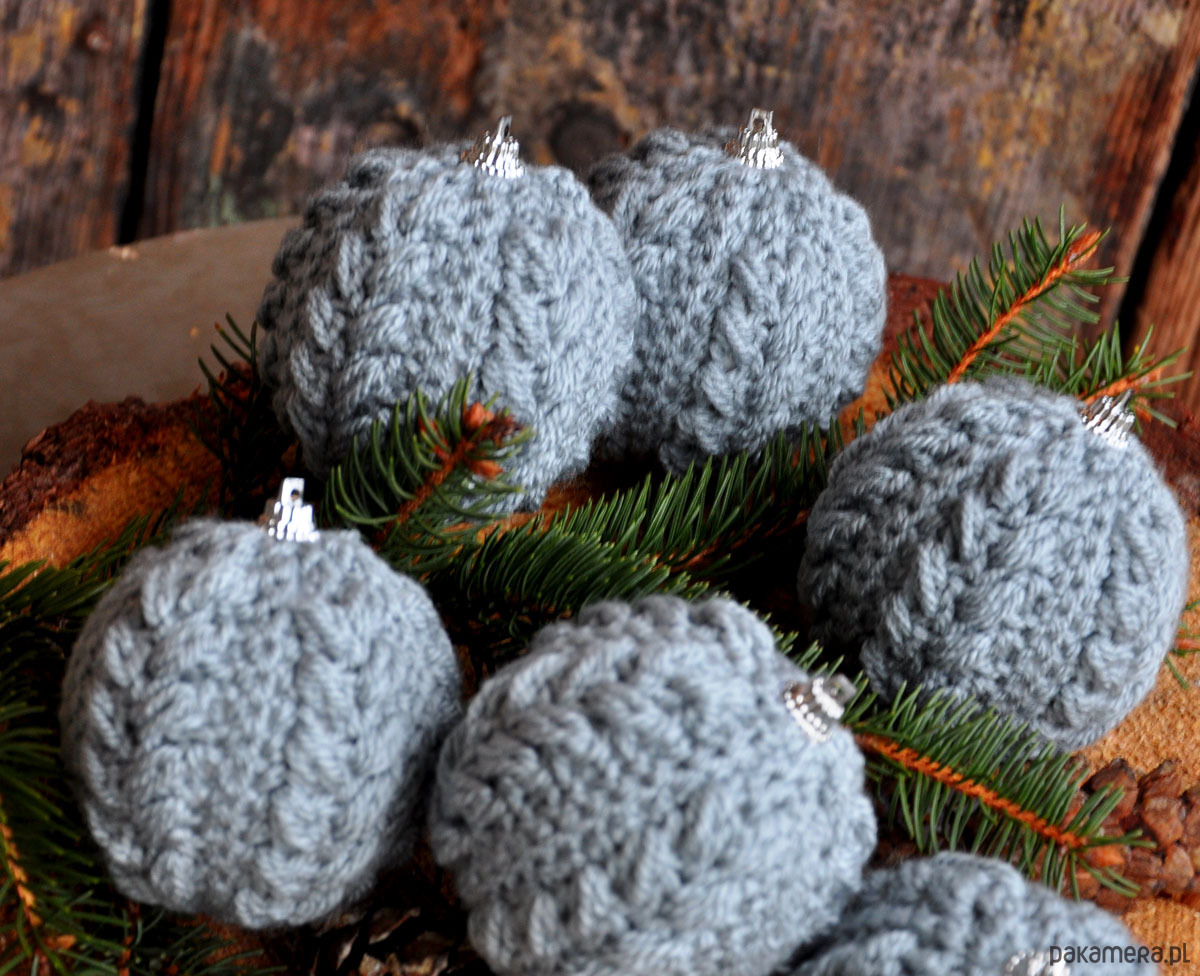 Piękne i wyjątkowe bombki świąteczne w szydełkowym sweterku w warkocze, na styropianowej bazie;