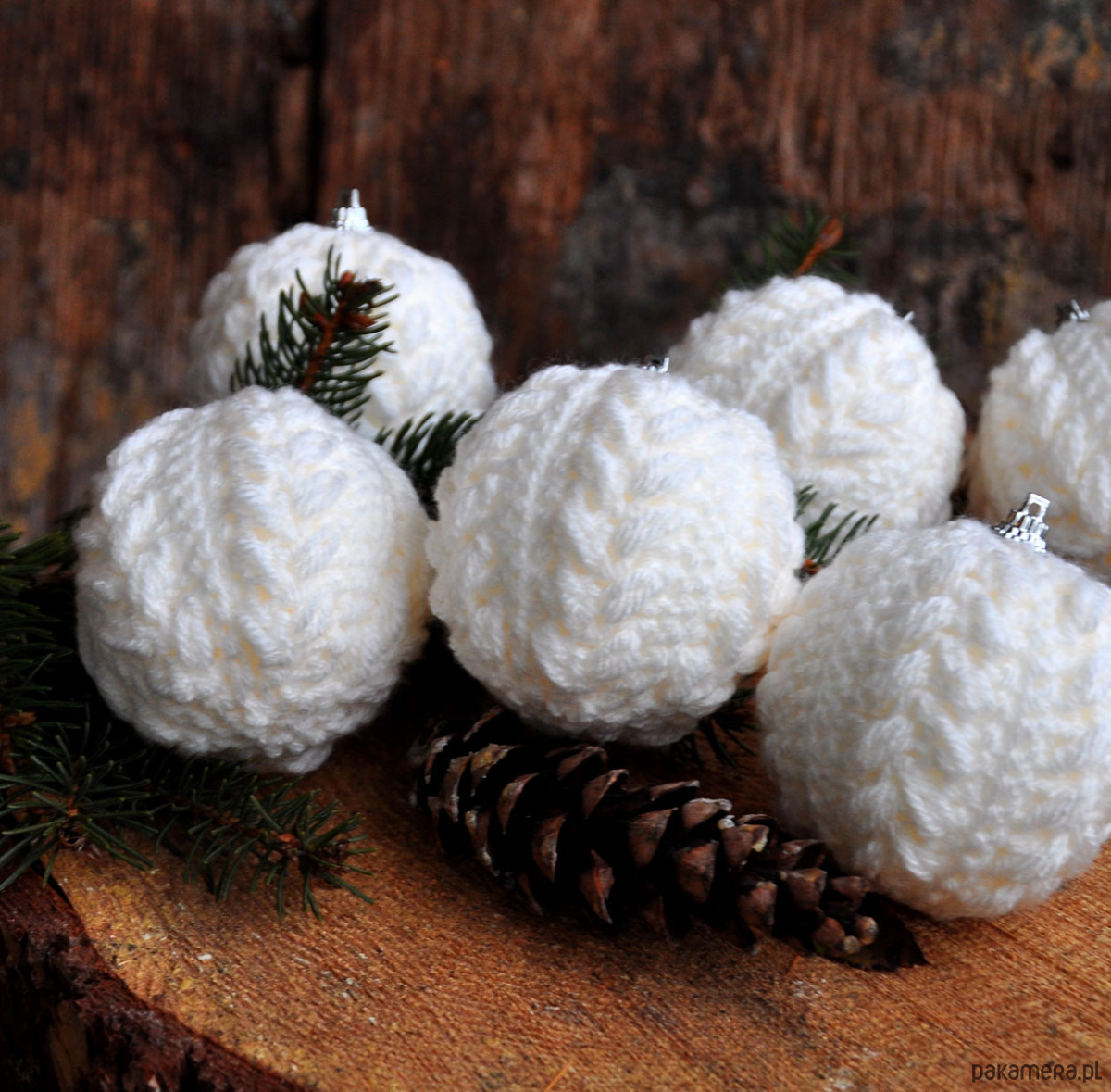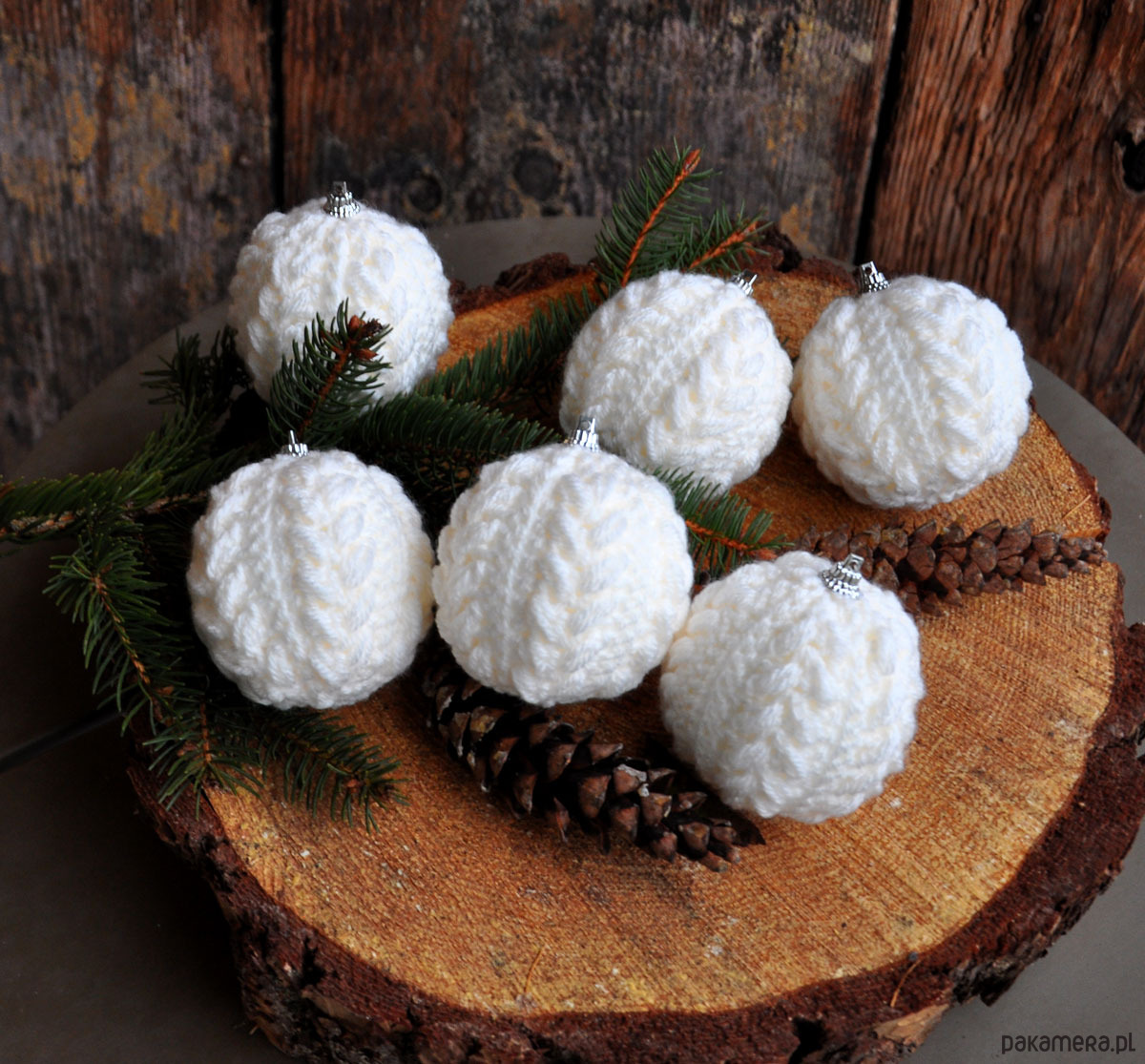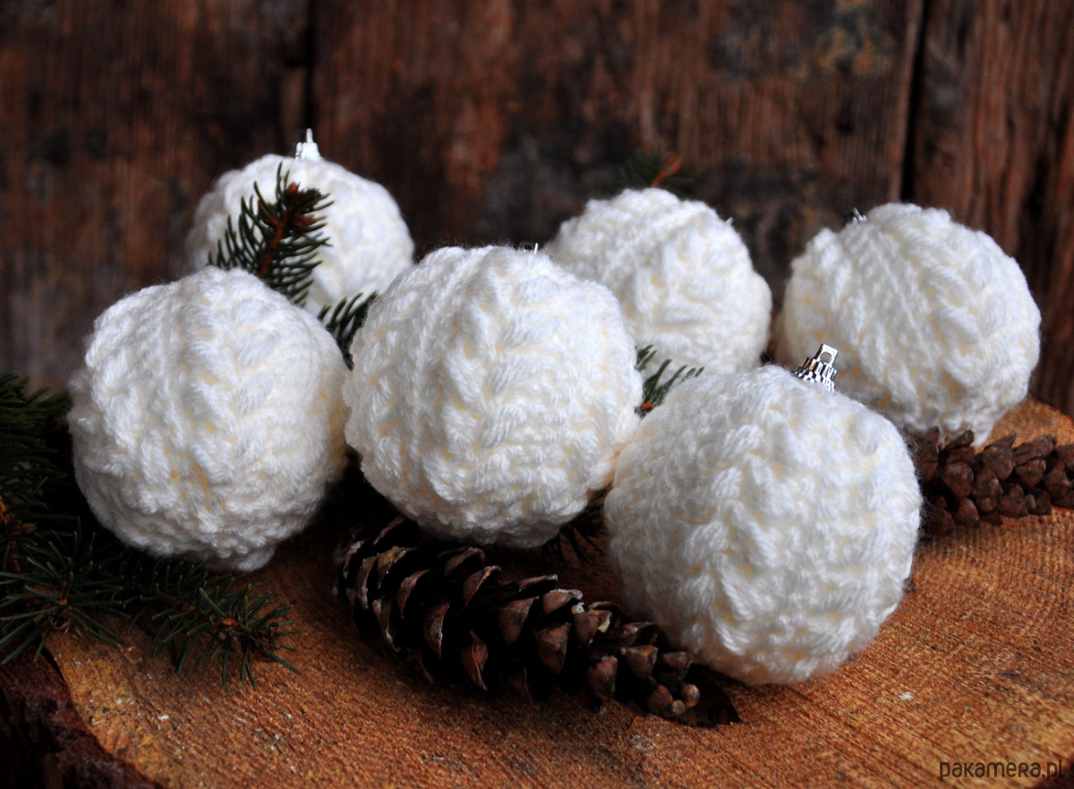 Piękne i wyjątkowe bombki świąteczne w szydełkowym sweterku w warkocze, na styropianowej bazie;