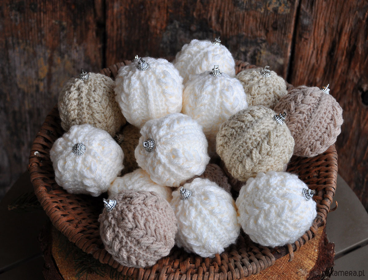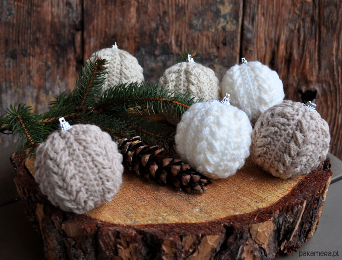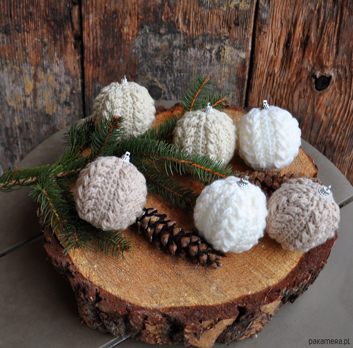 Piękne i wyjątkowe bombki świąteczne w szydełkowym sweterku w warkocze, na styropianowej bazie;