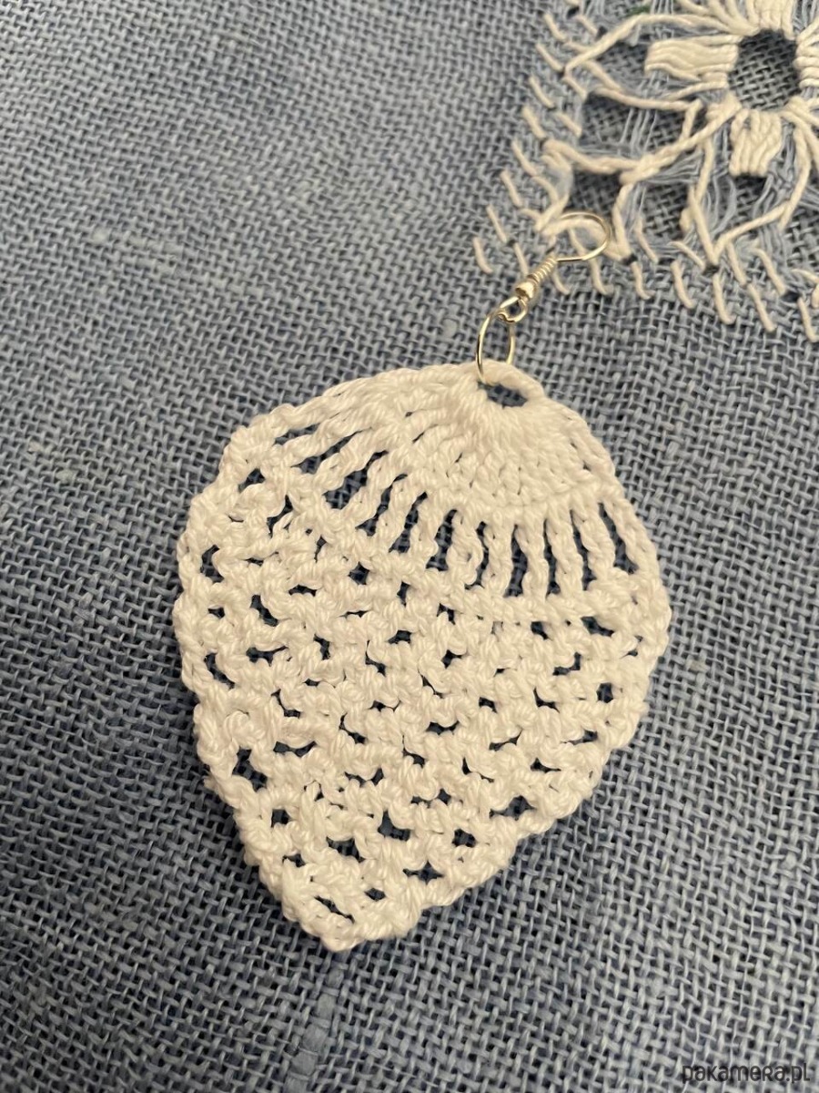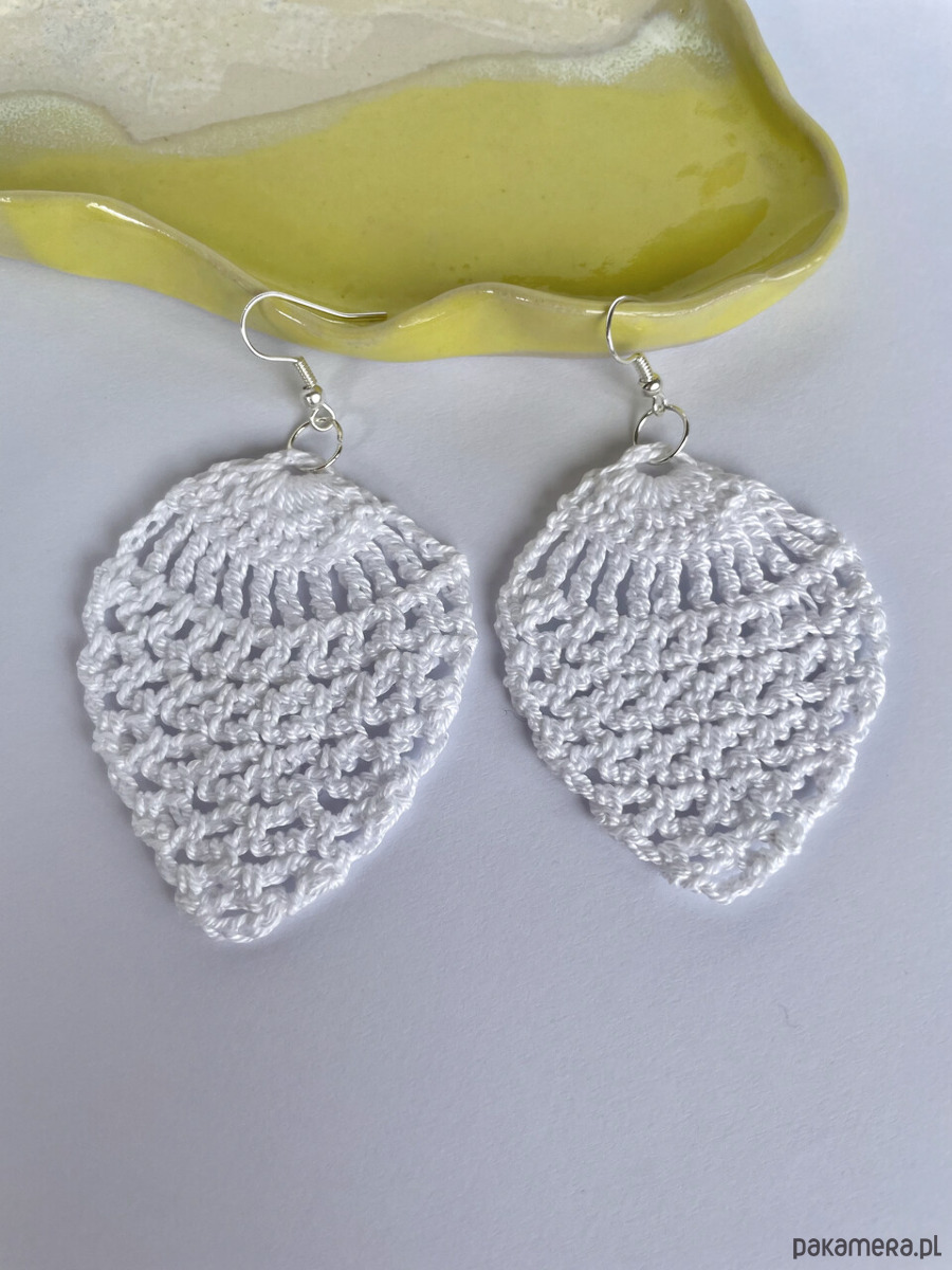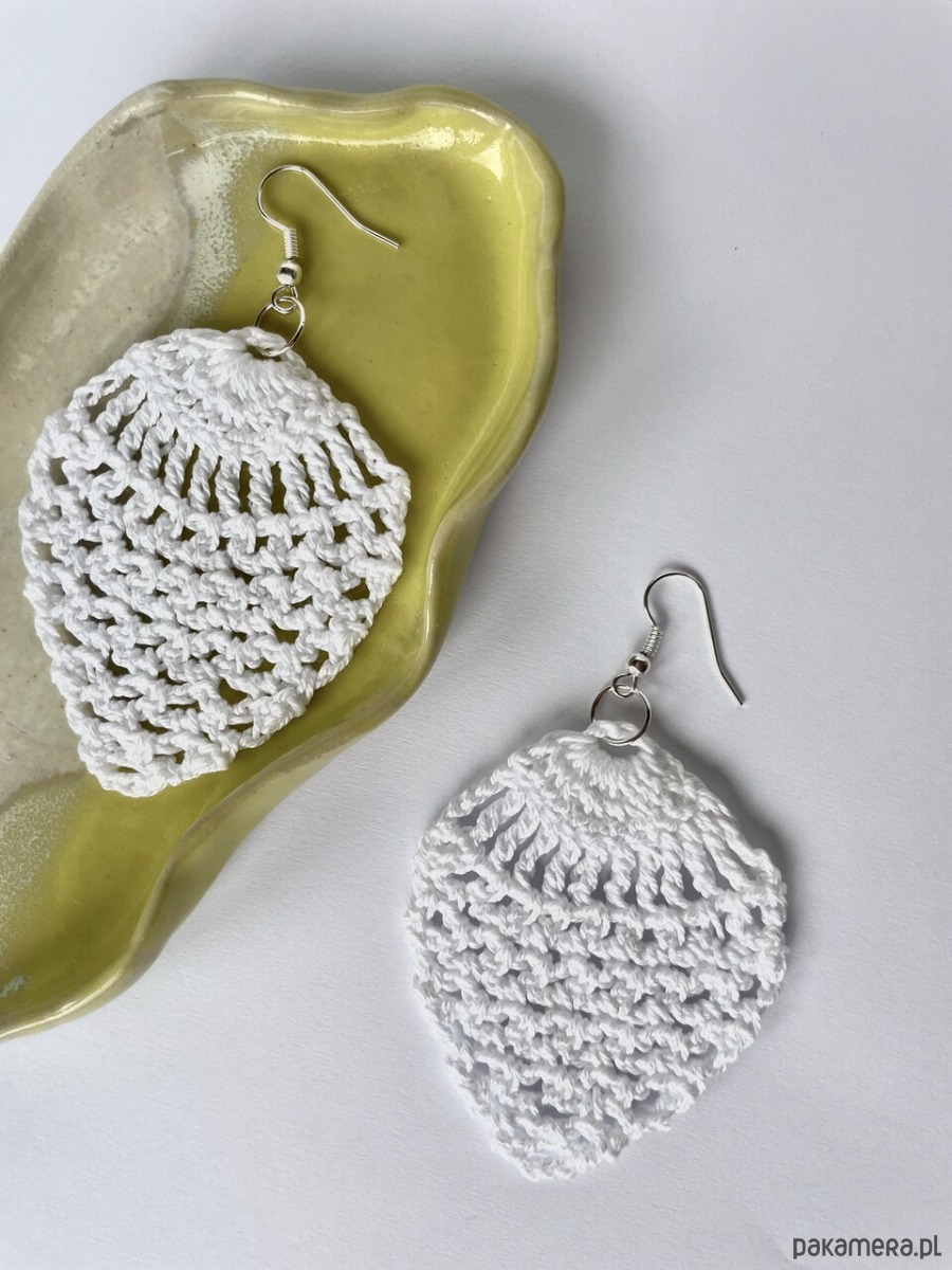 Szydełkowe kolczyki wykonane z bawełnianego białego cienkiego kordonka.