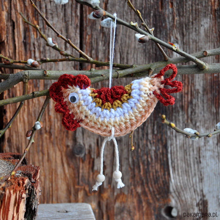 Szydełkowe kurki w folkowym stylu; do wykorzystania w wielkanocnych dekoracjach- można zawiesić na gałązce, wetknąć w rzeżuchę itp., wielkość kokoszki ok.10/11cm; w zestawie 3szt ; zapraszam