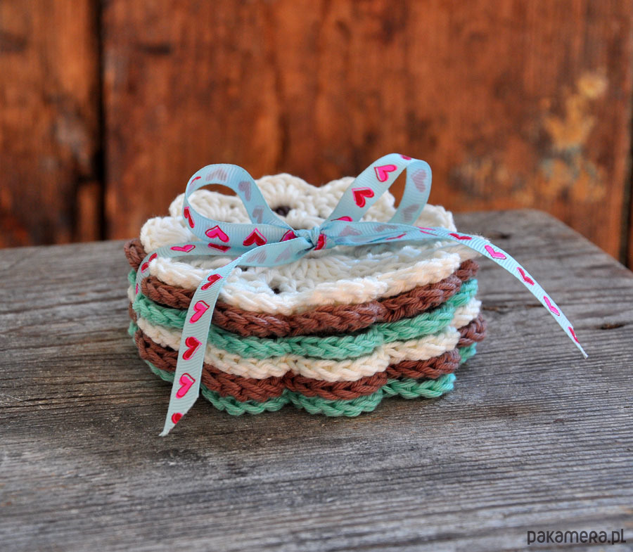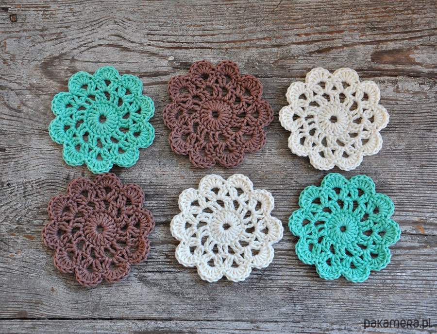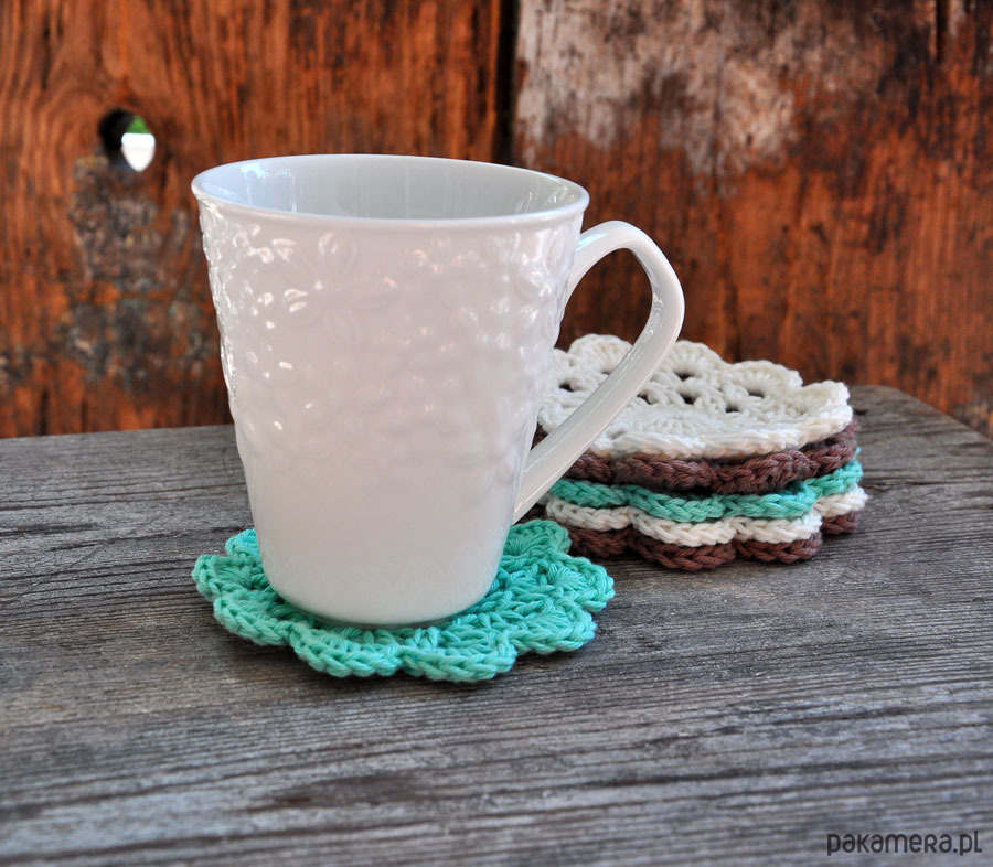 Wyjątkowe podkładki pod kubeczki wykonane szydełkiem z bawełny; delikatnie usztywnione; zabezpieczą Twój stół; umilą codzienną kawkę i popołudniową herbatkę; idealne na prezent; średnica 11cm; podkładki wysyłam w ozdobnym opakowaniu; w komplecie 6szt; kolory biały, turkus i brąz; zapraszam