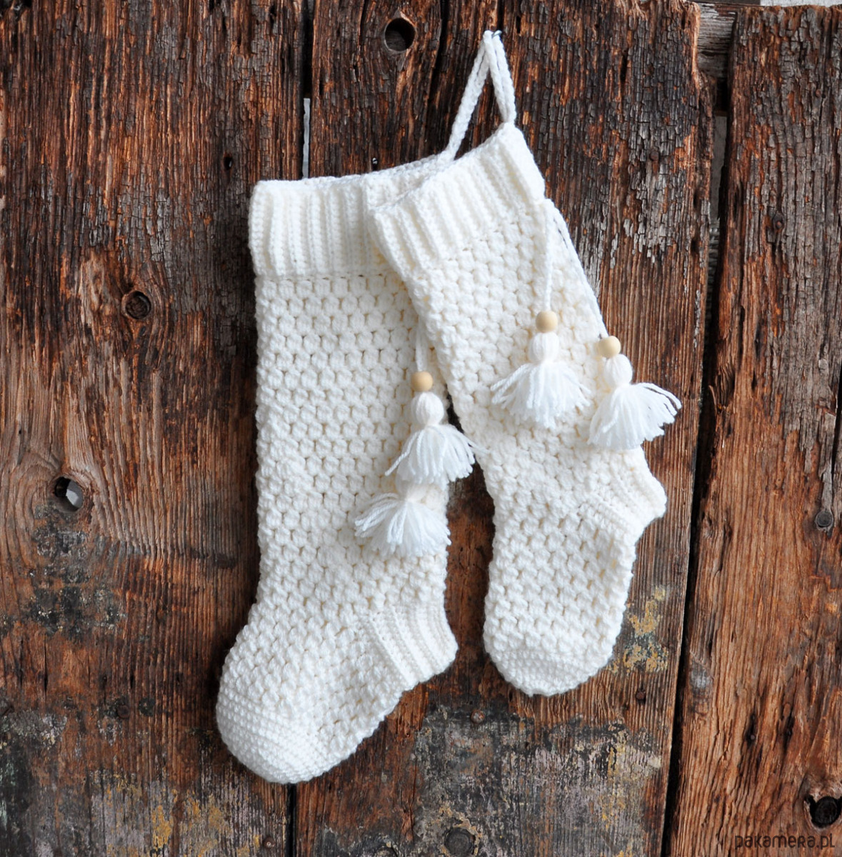 Grube, ręcznie robione szydełkiem, skarpety na kominek, puchate, z chwostami i pętelką do zawieszenia; w zestawie 2szt; wymiary- dł. 45cm/16cm i 38cm/14cm; zapraszam