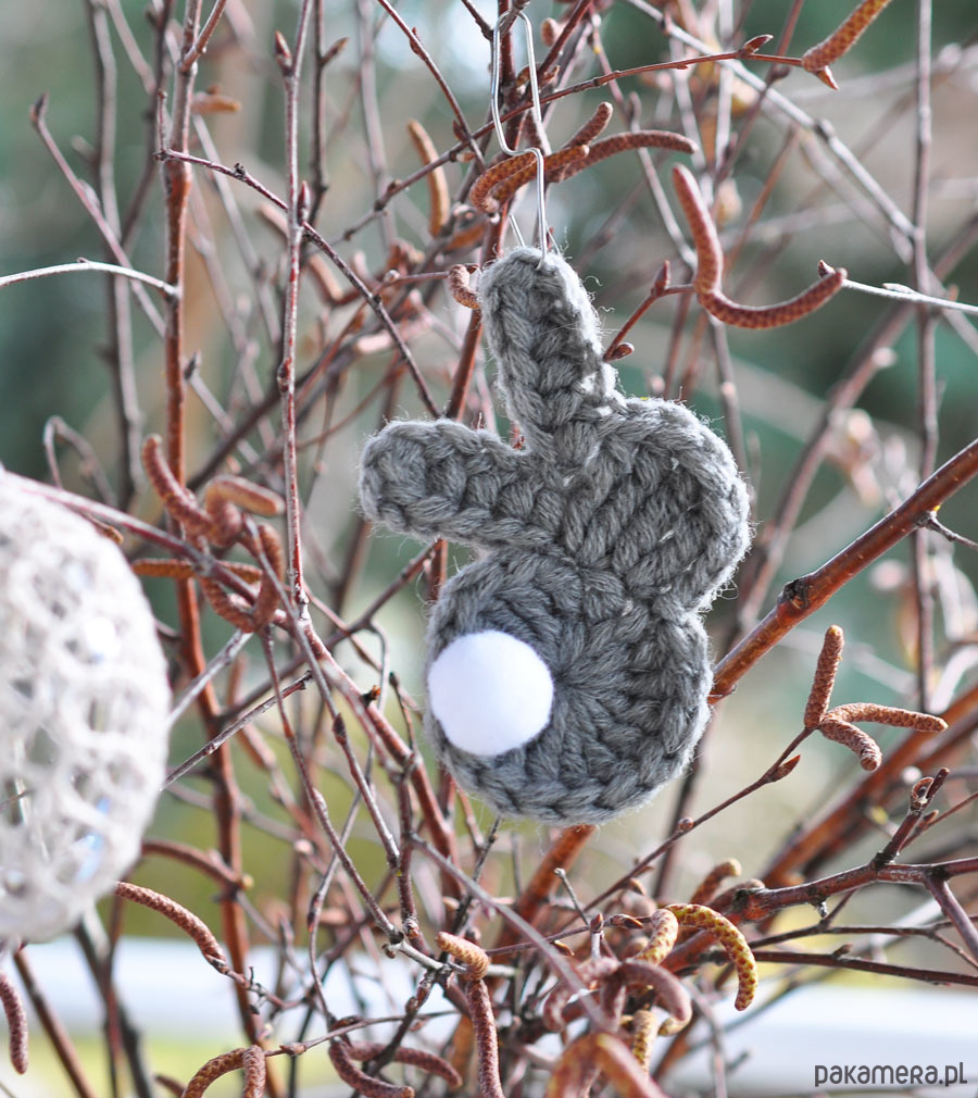 Małe, szydełkowe zajączki z białym ogonkiem, wykonane szydełkiem z włóczkowego sznurka; do wykorzystania w wielkanocnych dekoracjach- można zawiesić na gałązce, wetknąć w rzeżuchę, czy stroik, itp., wielkość zajączka ok.10cm; w zestawie 5szt w kolorze szarym; zapraszam