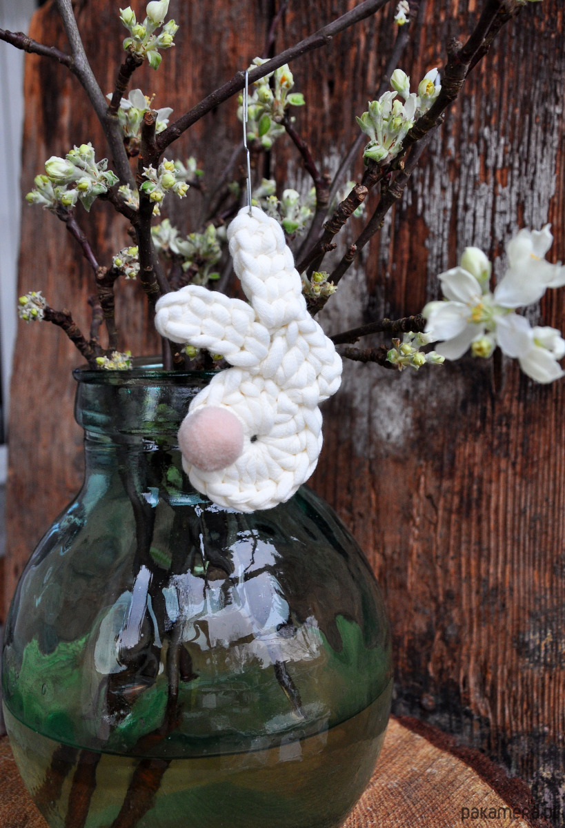 Małe, szydełkowe zajączki z białym ogonkiem, wykonane szydełkiem ze sznurka; do wykorzystania w wielkanocnych dekoracjach- można zawiesić na gałązce, wetknąć w rzeżuchę, czy stroik, itp., wielkość zajączka ok.11cm; w zestawie 5szt w kolorze szarym; zapraszam
