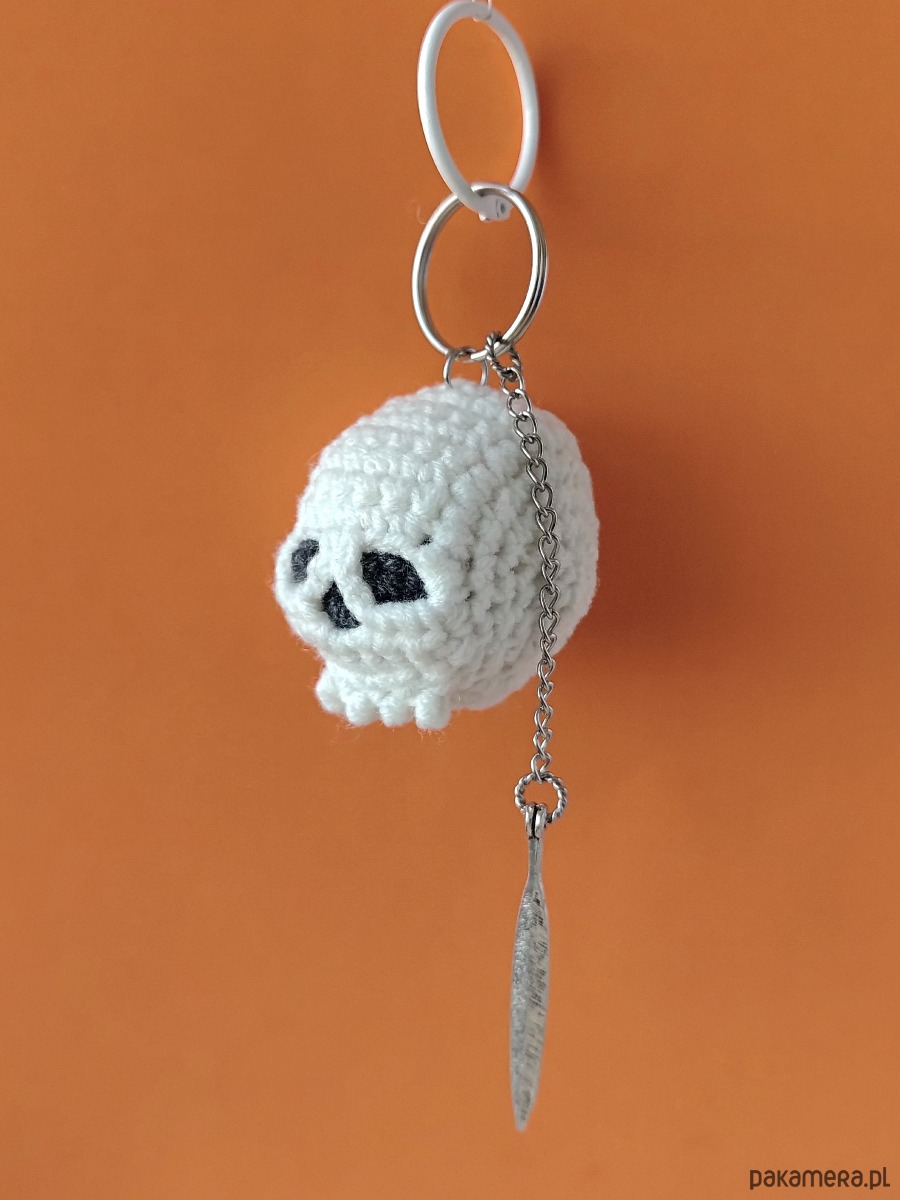 Mała, ręcznie robiona czaszka z włóczki – miękka i lekka, ale z charakterem. Dopełnia ją metalowy detal w formie zawieszki, który dodaje całości odrobiny mrocznego klimatu.