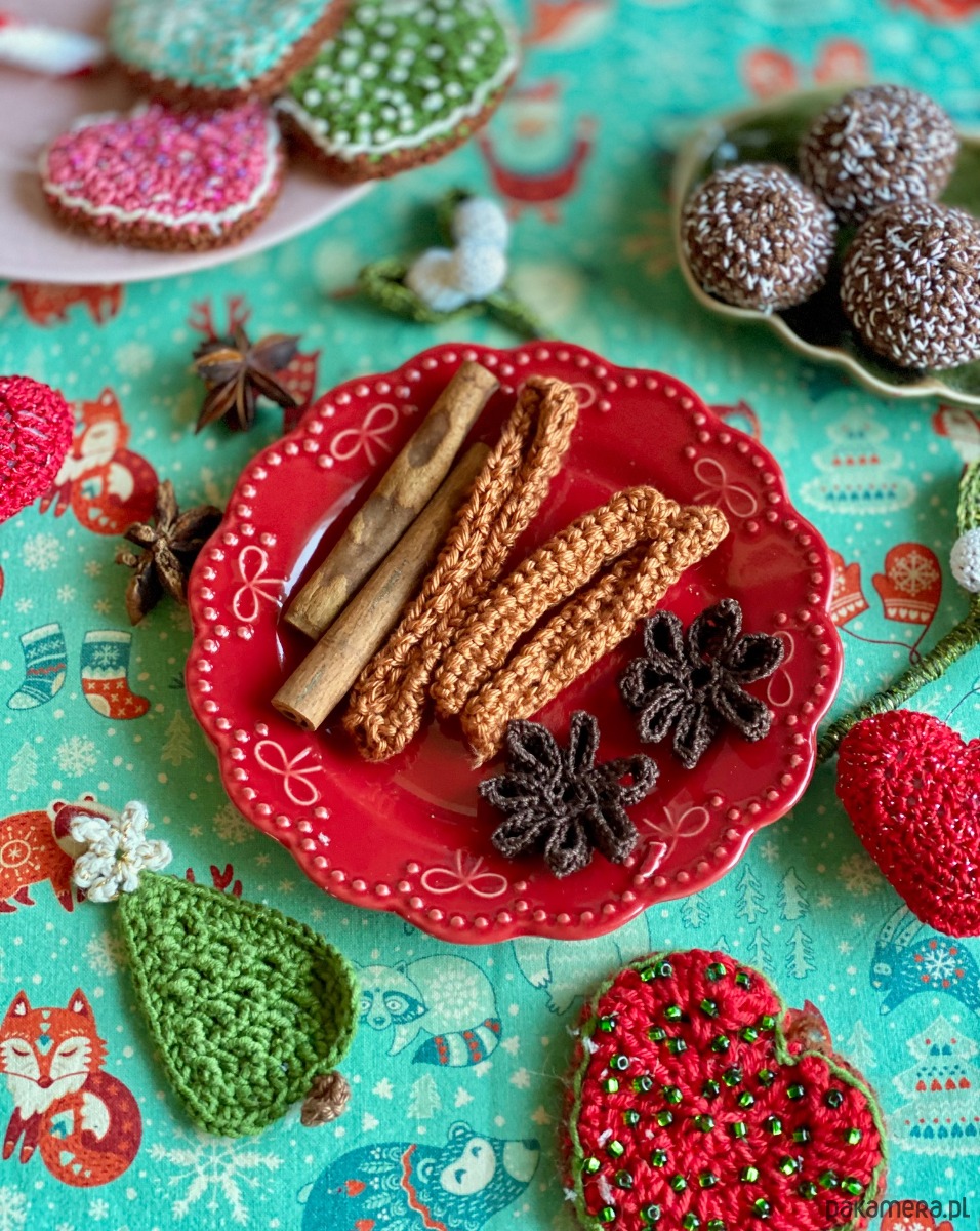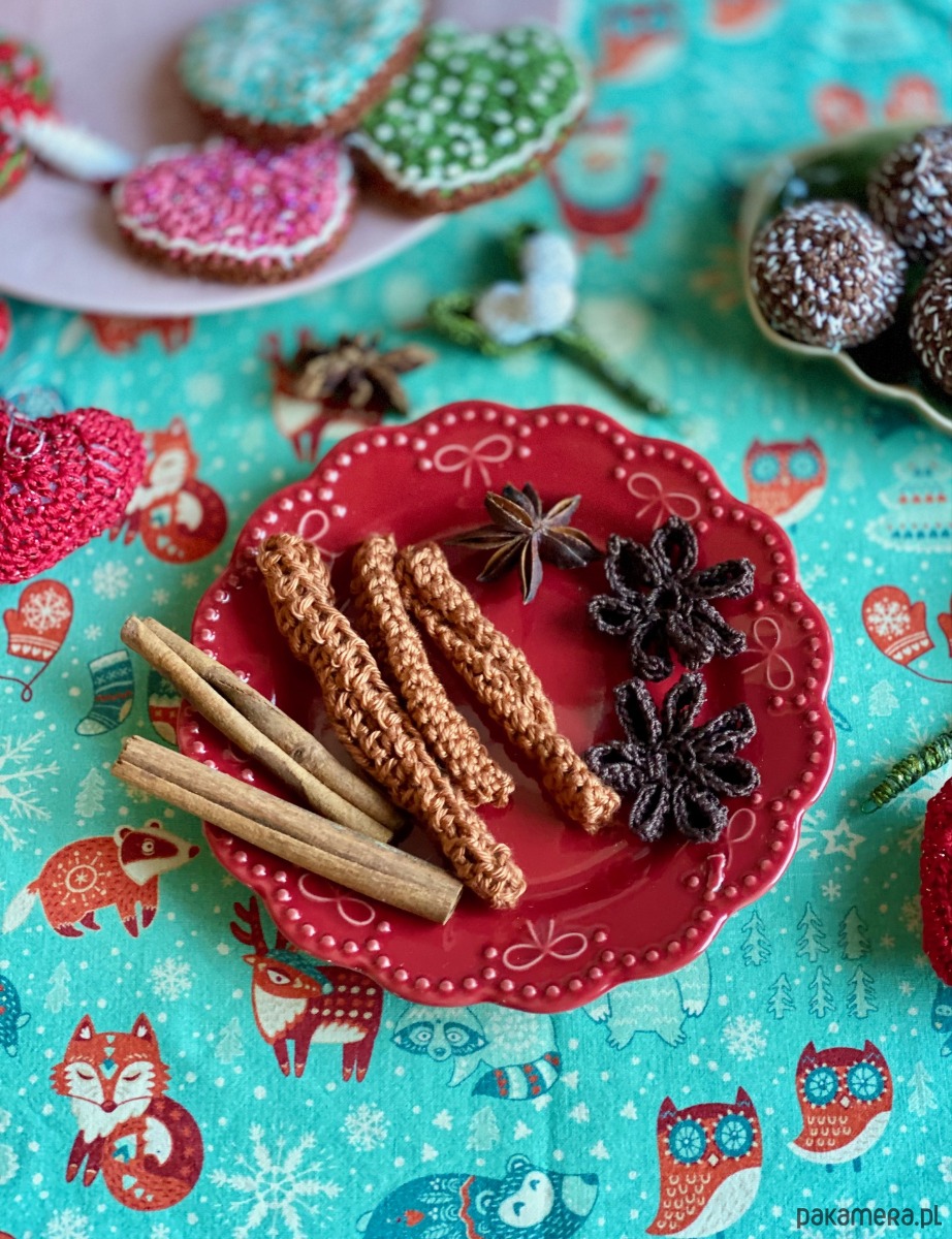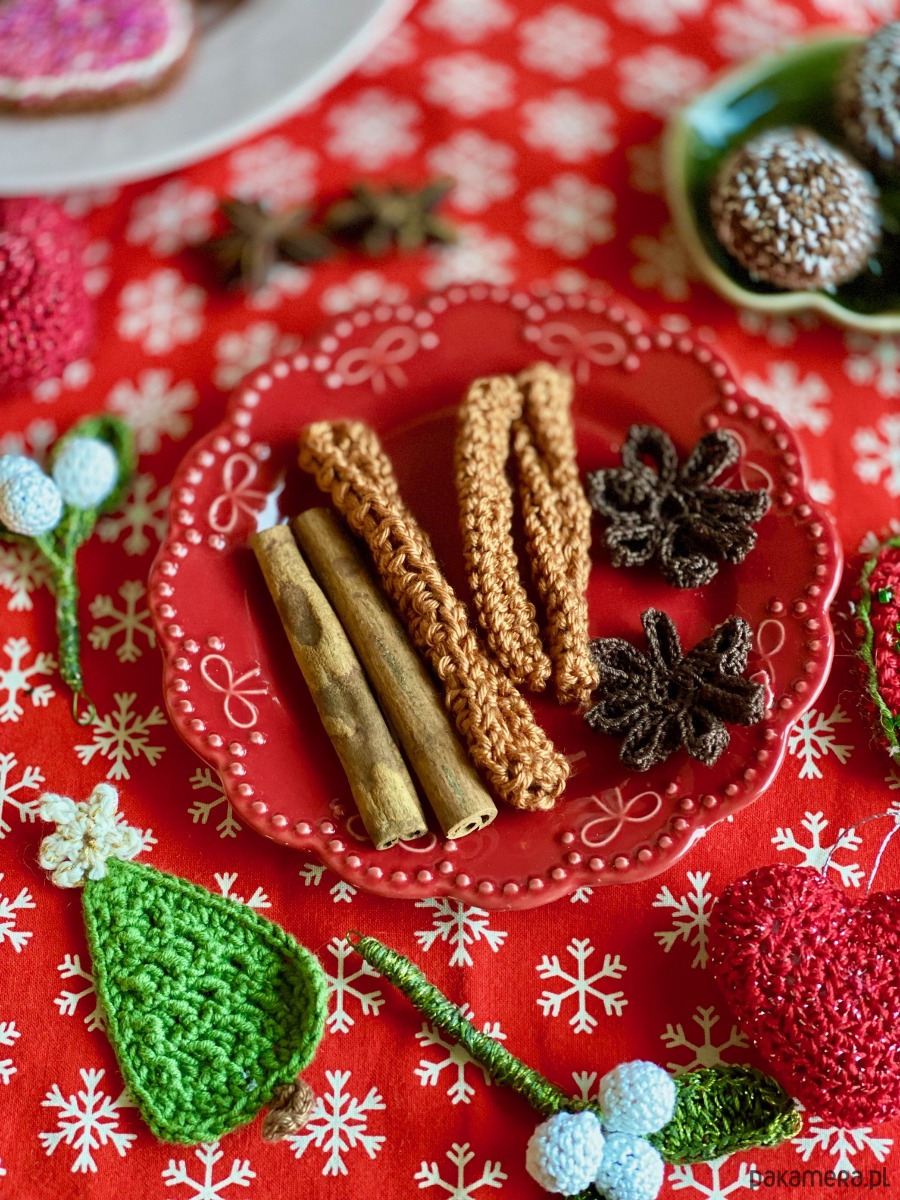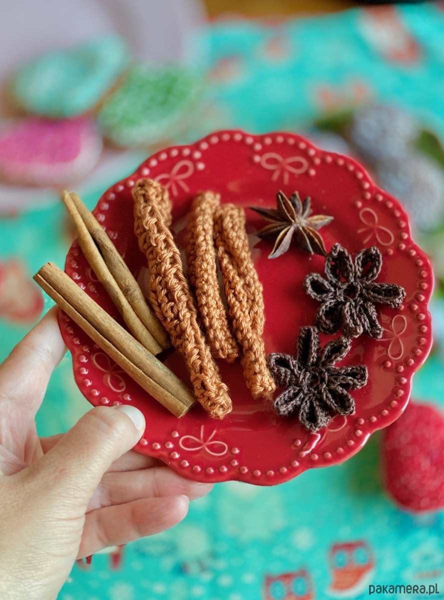 Szydełkowy cynamon i anyż — to wyjątkowy dodatek do Twojej świątecznej aranżacji lub dziecięcej kuchni. Wykonane ręcznie z dbałością o każdy szczegół, idealnie oddają urok prawdziwych przypraw. Doskonale sprawdzą się jako ozdoba świątecznych prezentów, element bożonarodzeniowej dekoracji stołu, a także jako bezpieczna zabawka do zabawy w pieczenie i gotowanie.