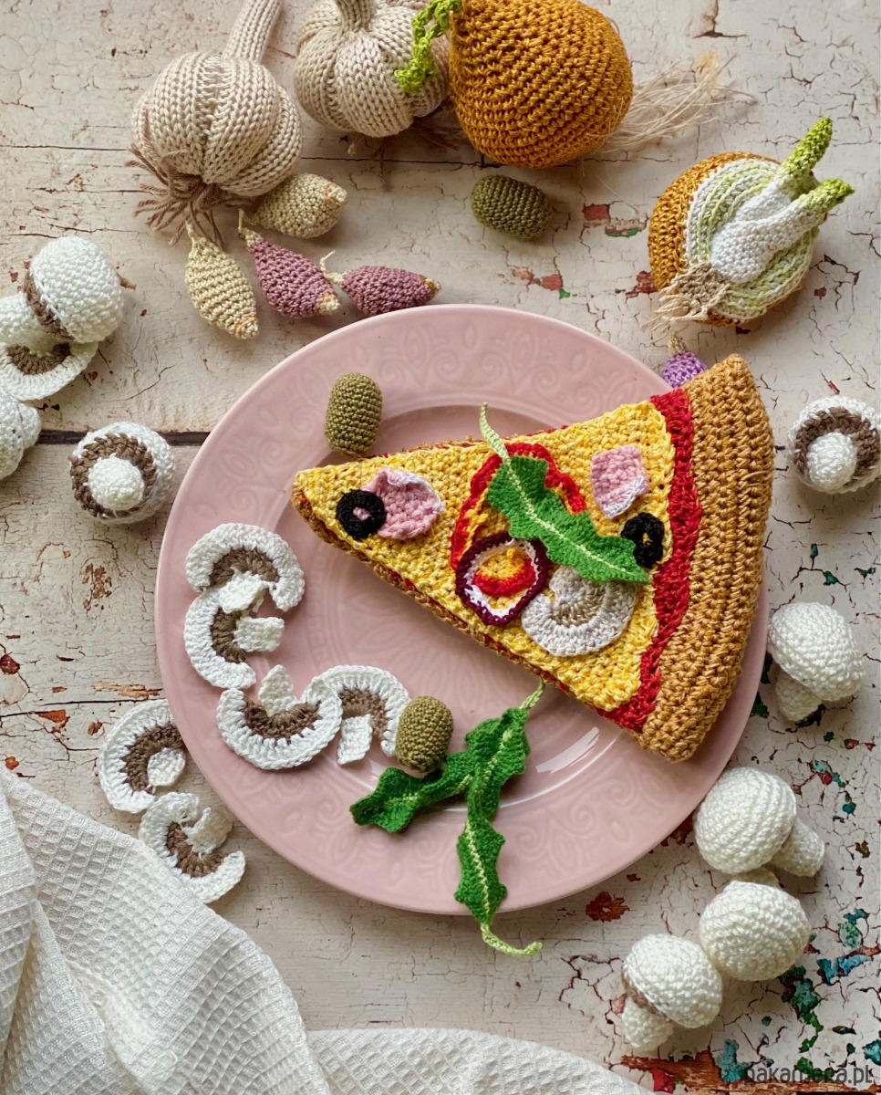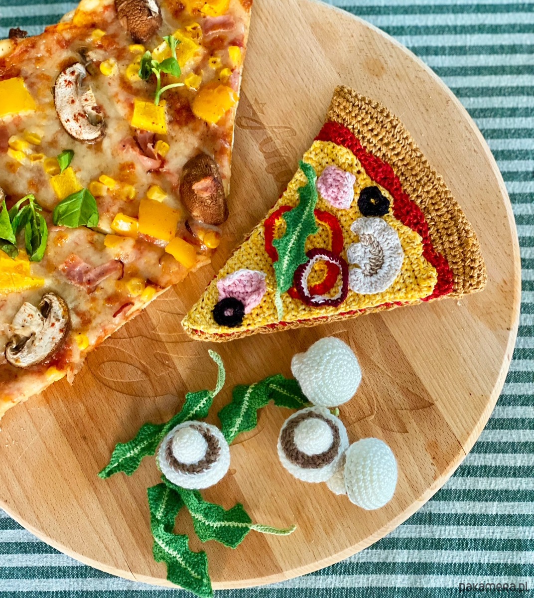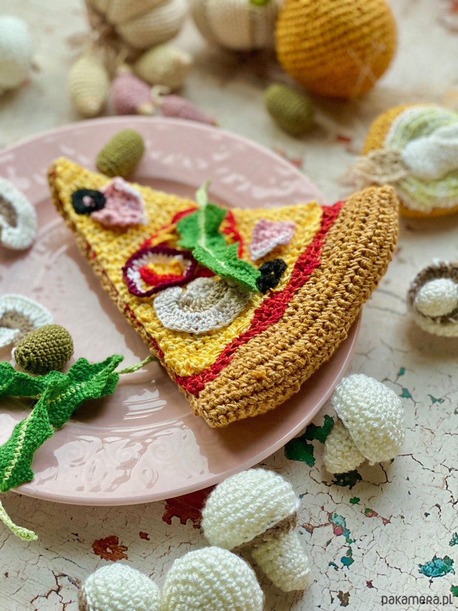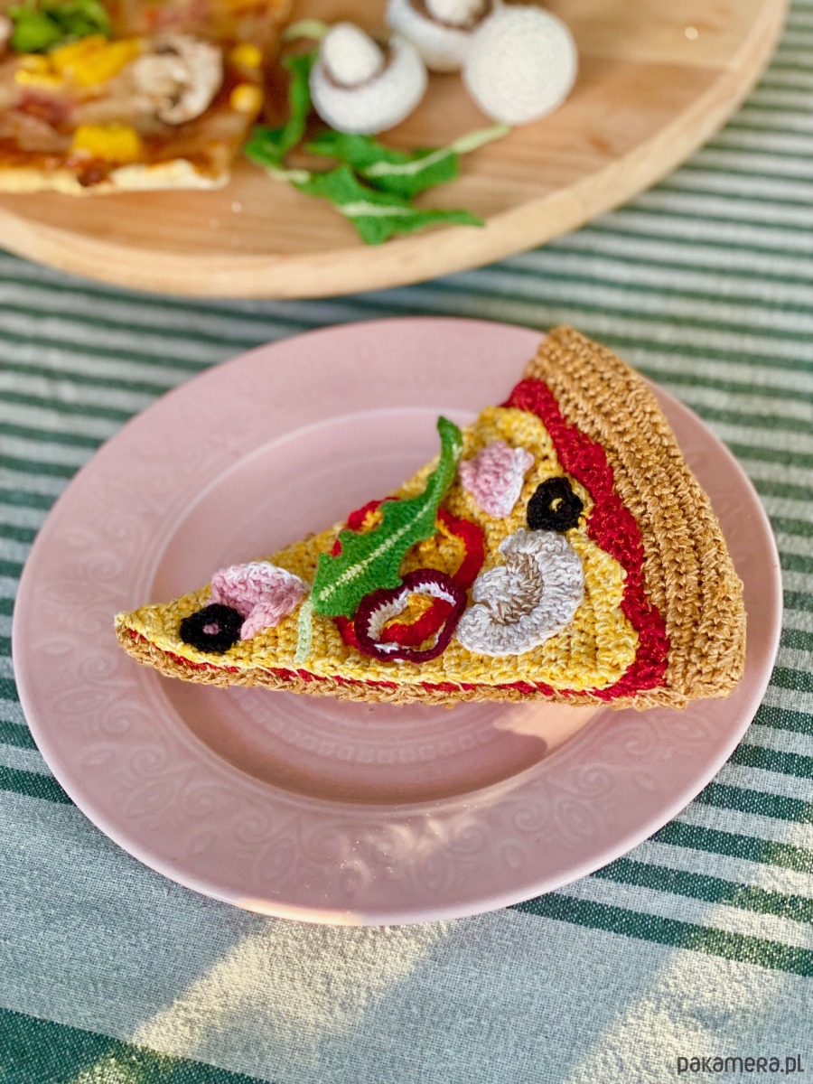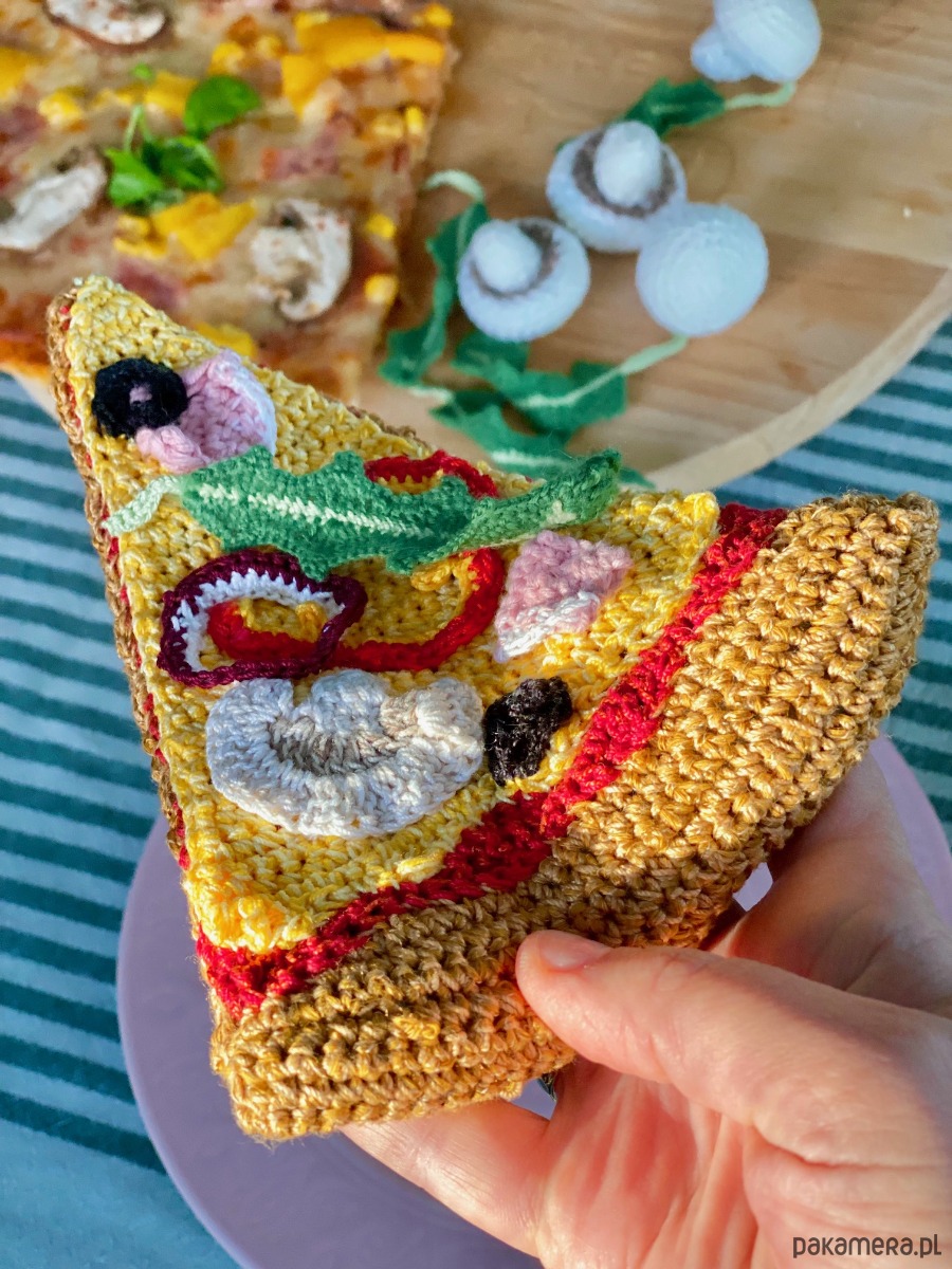 Szydełkowy kawałek pizzy z szynką i dodatkami