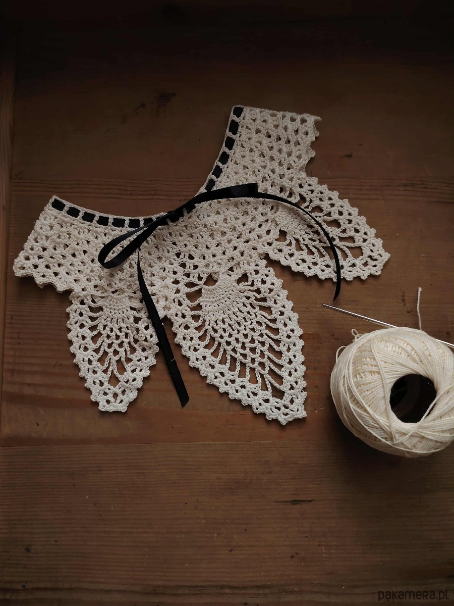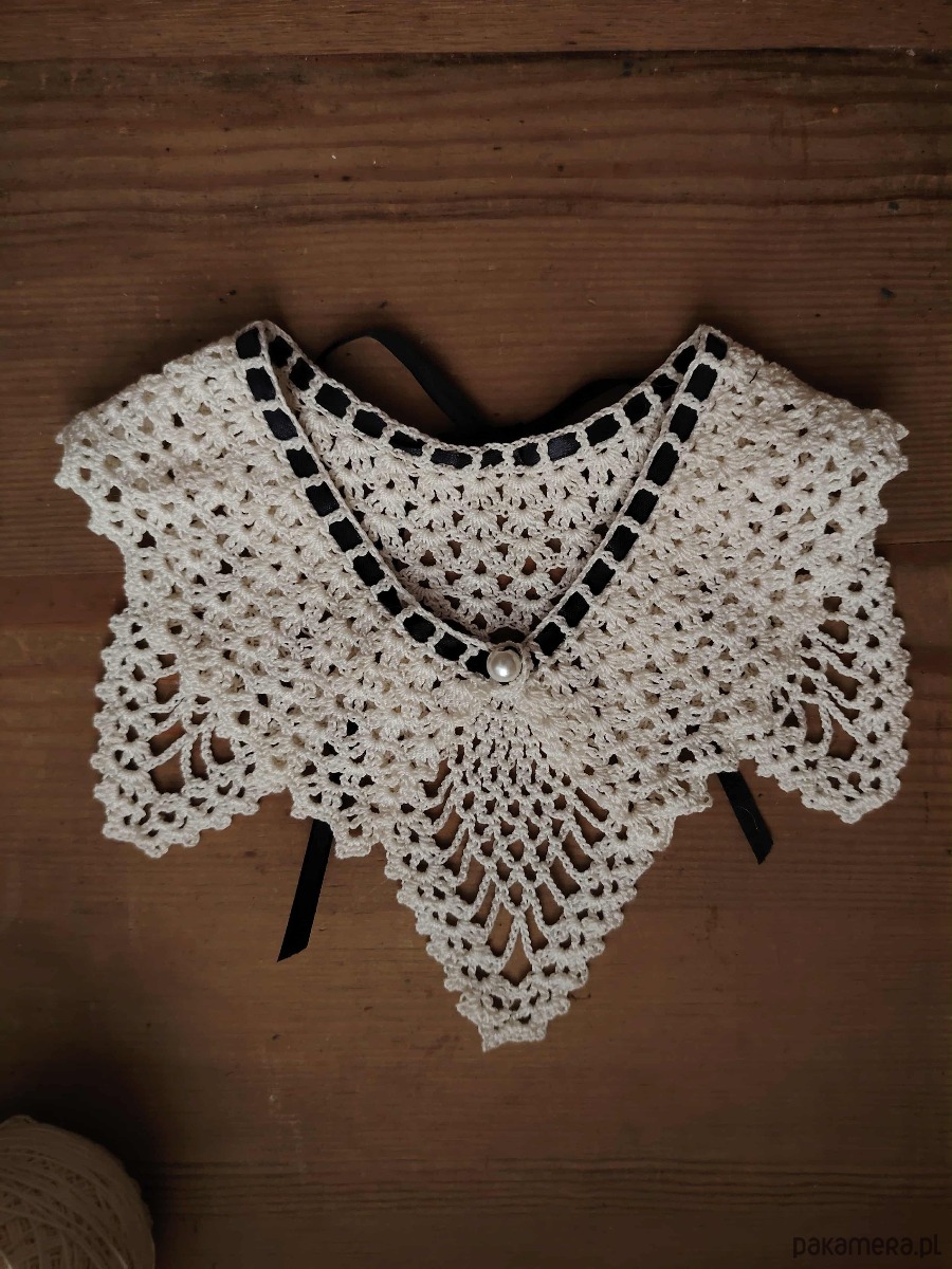 Kołnierzyk został wykonany z cienkiej, 100% bawełnianej nici. Ozdobiony czarną wstążką przewleczoną przez górną część kołnierzyka, zawiązaną w elegancką kokardkę na środku. Ażurowy wzór został lekko wykrochmalony, aby podkreślić jego misterność i niebanalny, odważny kształt. Model jest zapinany z tyłu na subtelną perełkę.