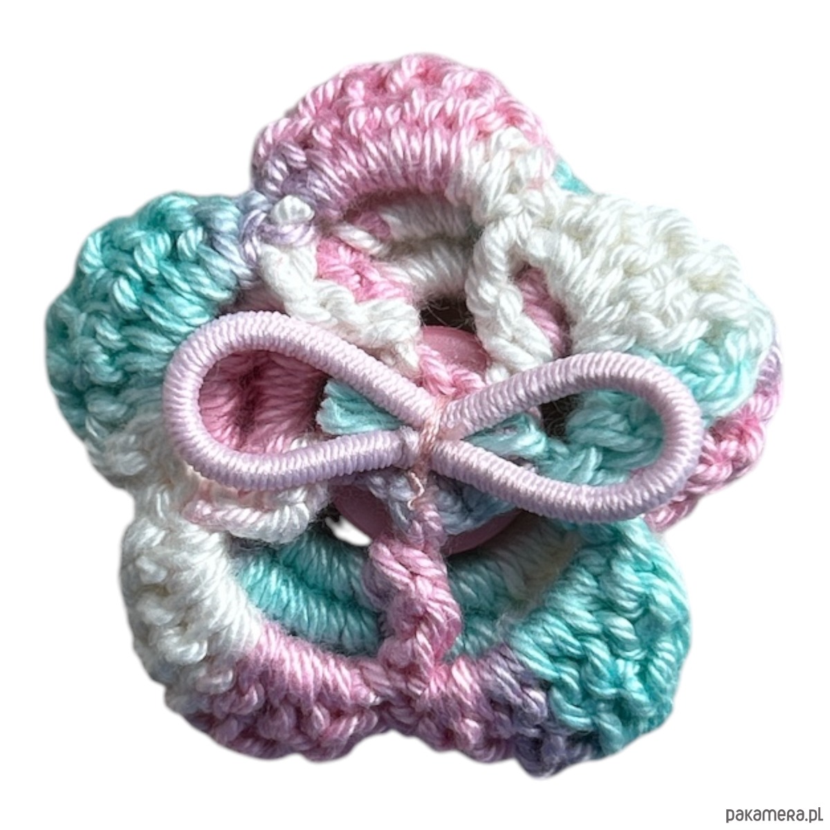 Zrobiony na szydełku ze 100% bawełny i przyszyty do gumki.