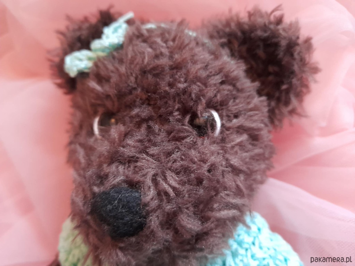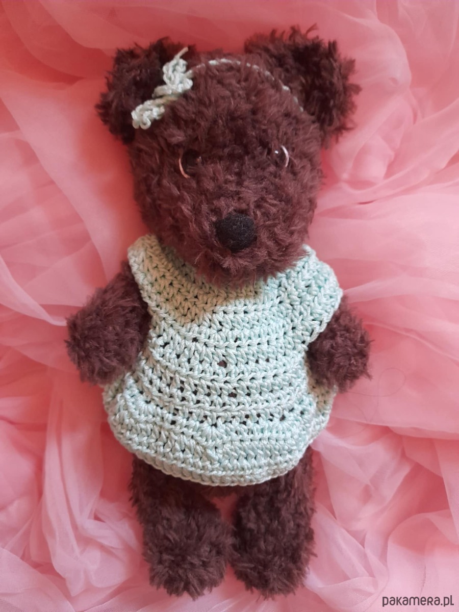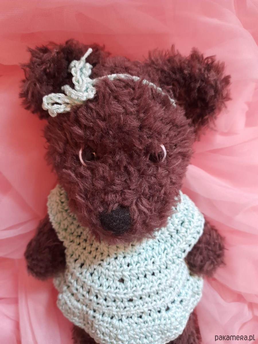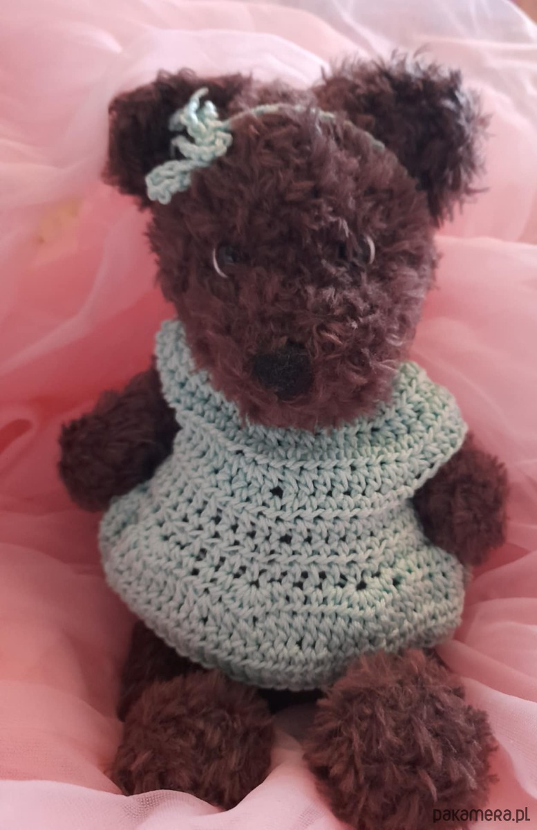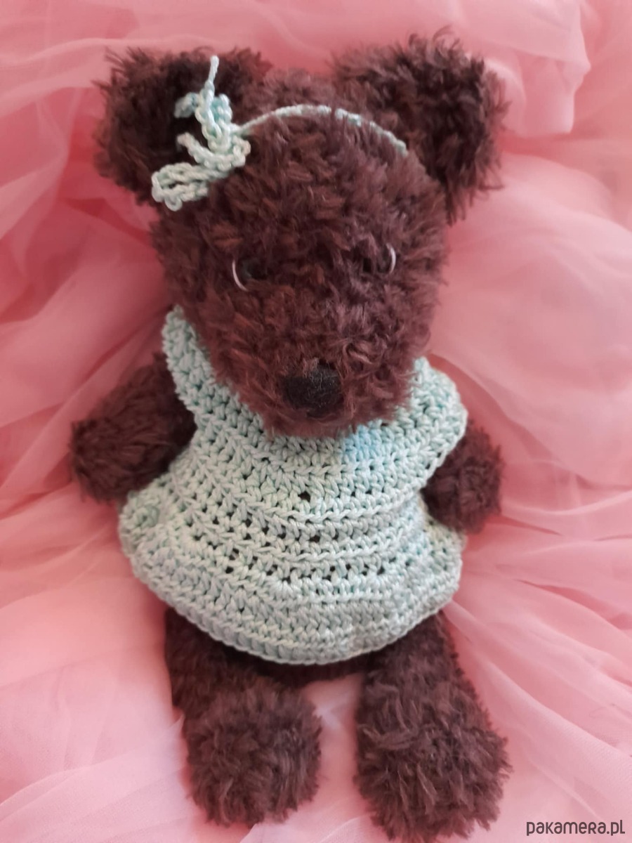 Oto ja. Brązowa misia. Jestem zrobiona z miłej w dotyku włóczki. Mam 24 cm. Mam bezpieczne oczka i bezpieczny nosek. Noszę na sobie śliczną sukienkę zapinaną z tyłu na kolorowe guziczki. Jestem pogodna i każdemu kto mnie weźmie do rąk przyniosę szczęście.Moje ubranka można ściągać. Można mnie nosić ze sobą wszędzie. W każdy dzień szepnę Ci coś miłego na uszko.