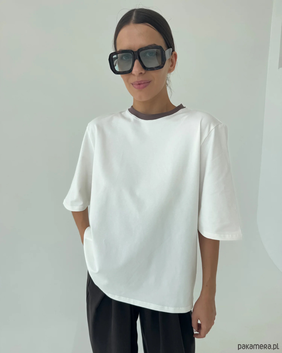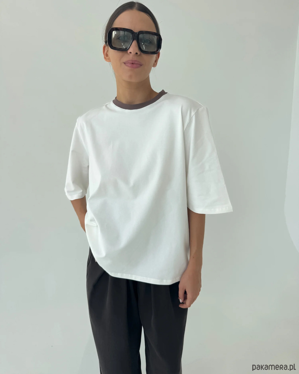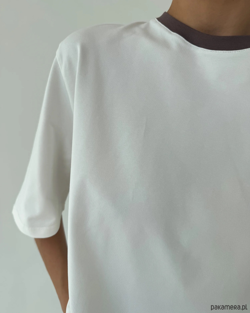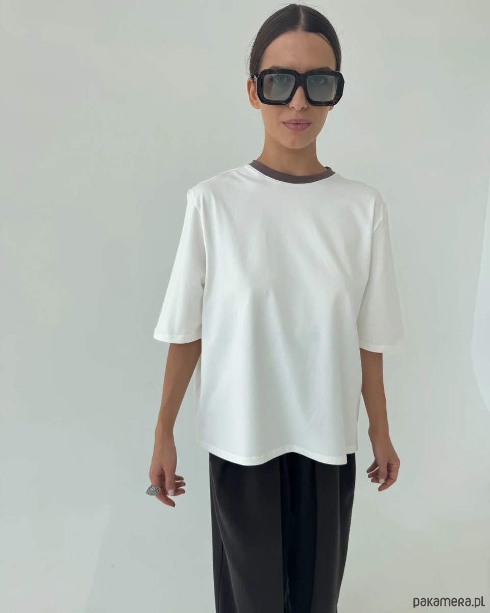 T-shirt Art w odcieniu ecru z kontrastową plisą cacao to połączenie minimalistycznego designu i architektonicznej formy. Uszyty z wysokogatunkowej bawełny premium, zachwyca strukturą, komfortem i dbałością o detale.