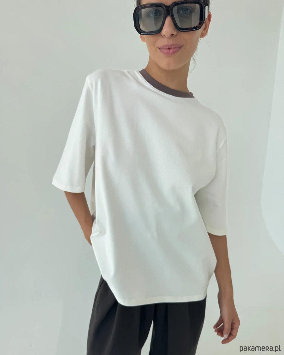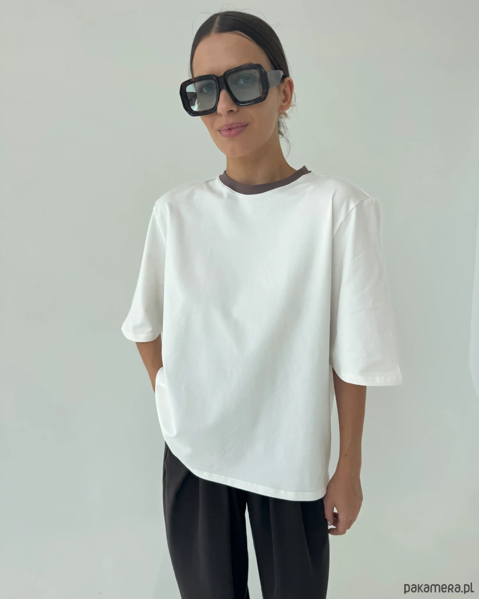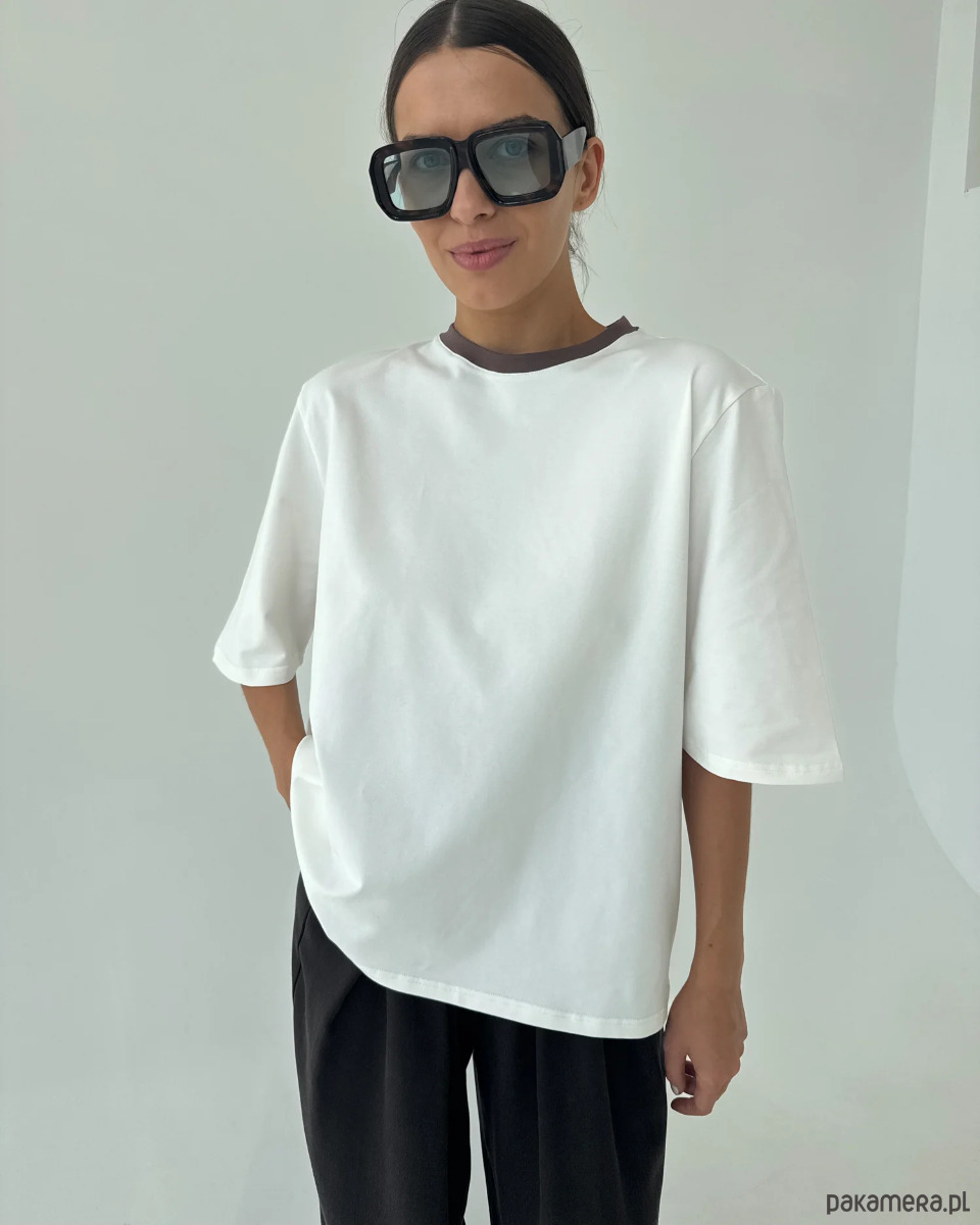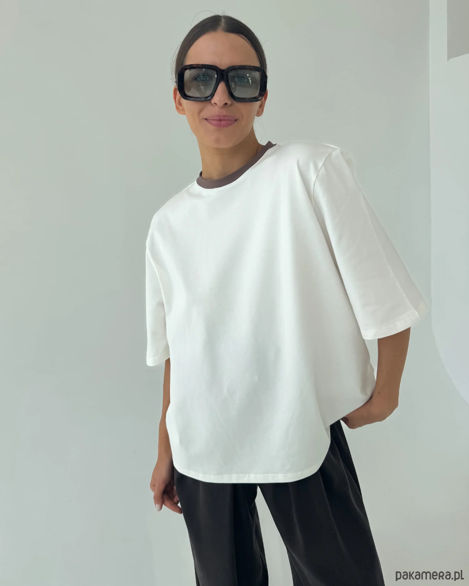 T-shirt Art w odcieniu ecru z kontrastową plisą cacao to połączenie minimalistycznego designu i architektonicznej formy. Uszyty z wysokogatunkowej bawełny premium, zachwyca strukturą, komfortem i dbałością o detale.