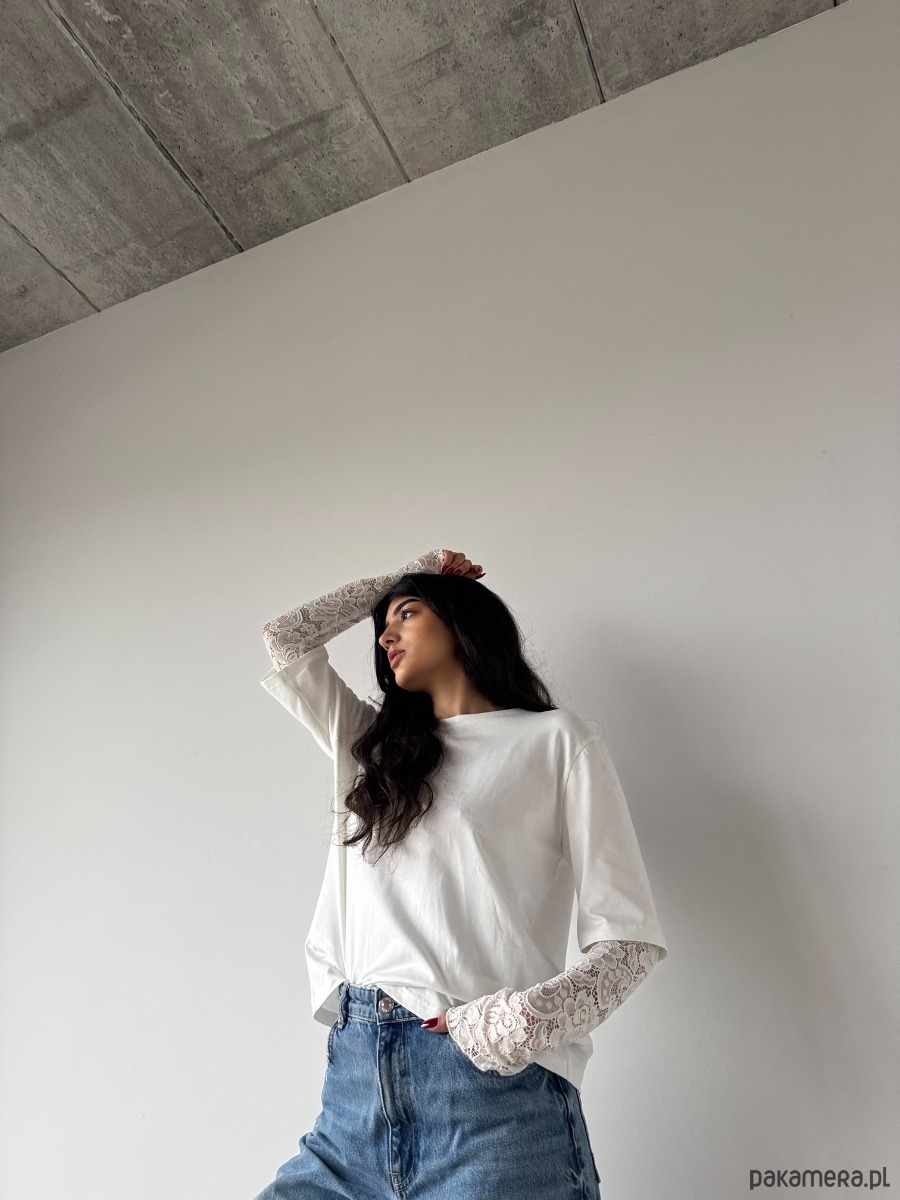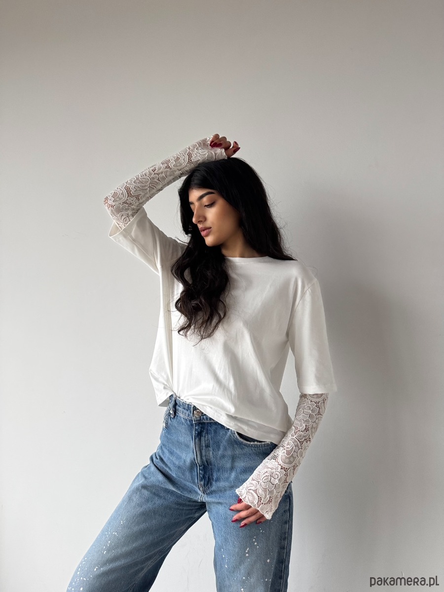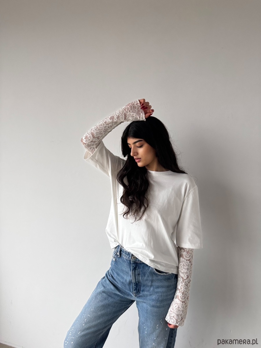 T-shirt bawełniany z koronkowym rękawem CREAMLY