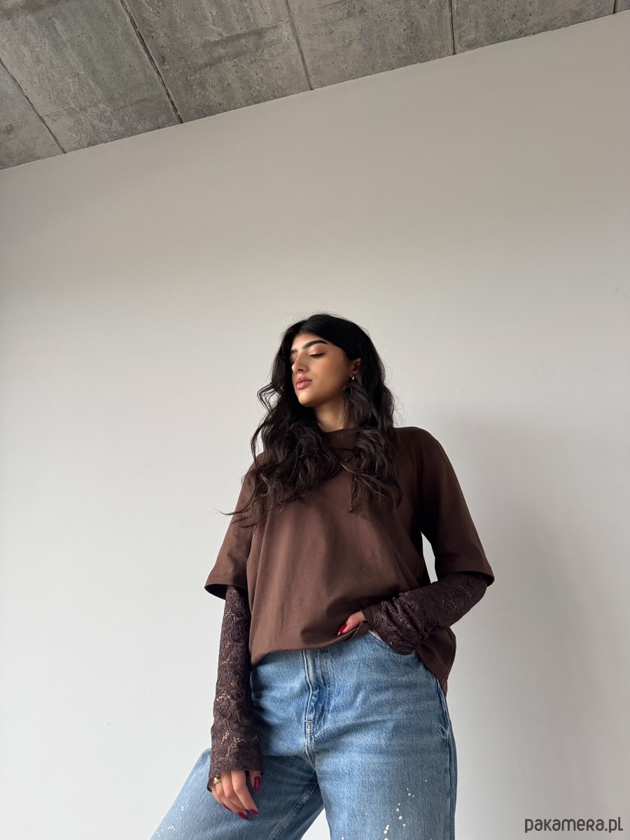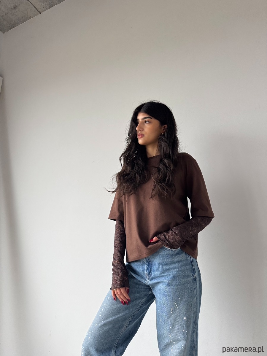 T-shirt bawełniany z koronkowym rękawem CZEKOLADOWY